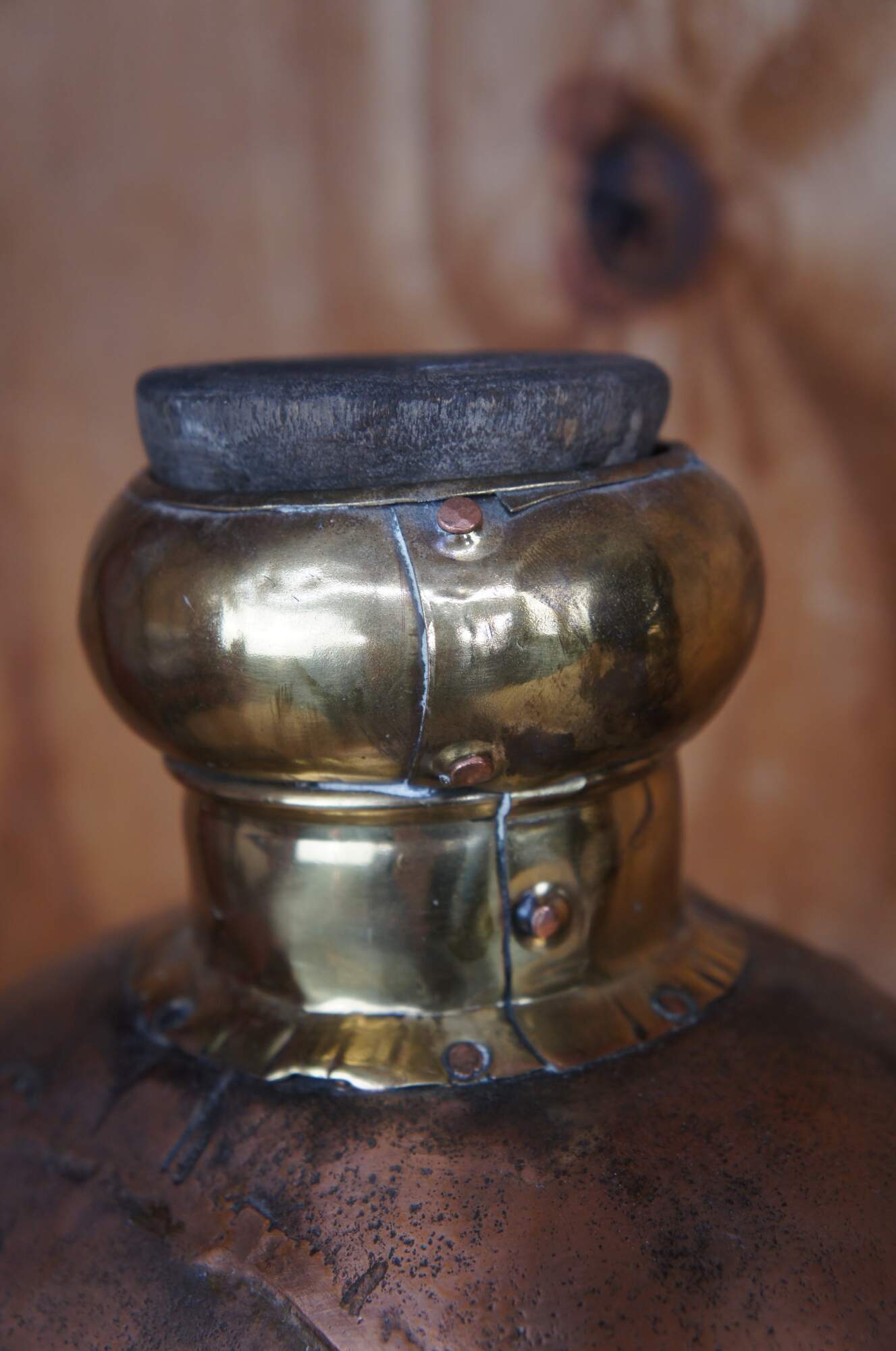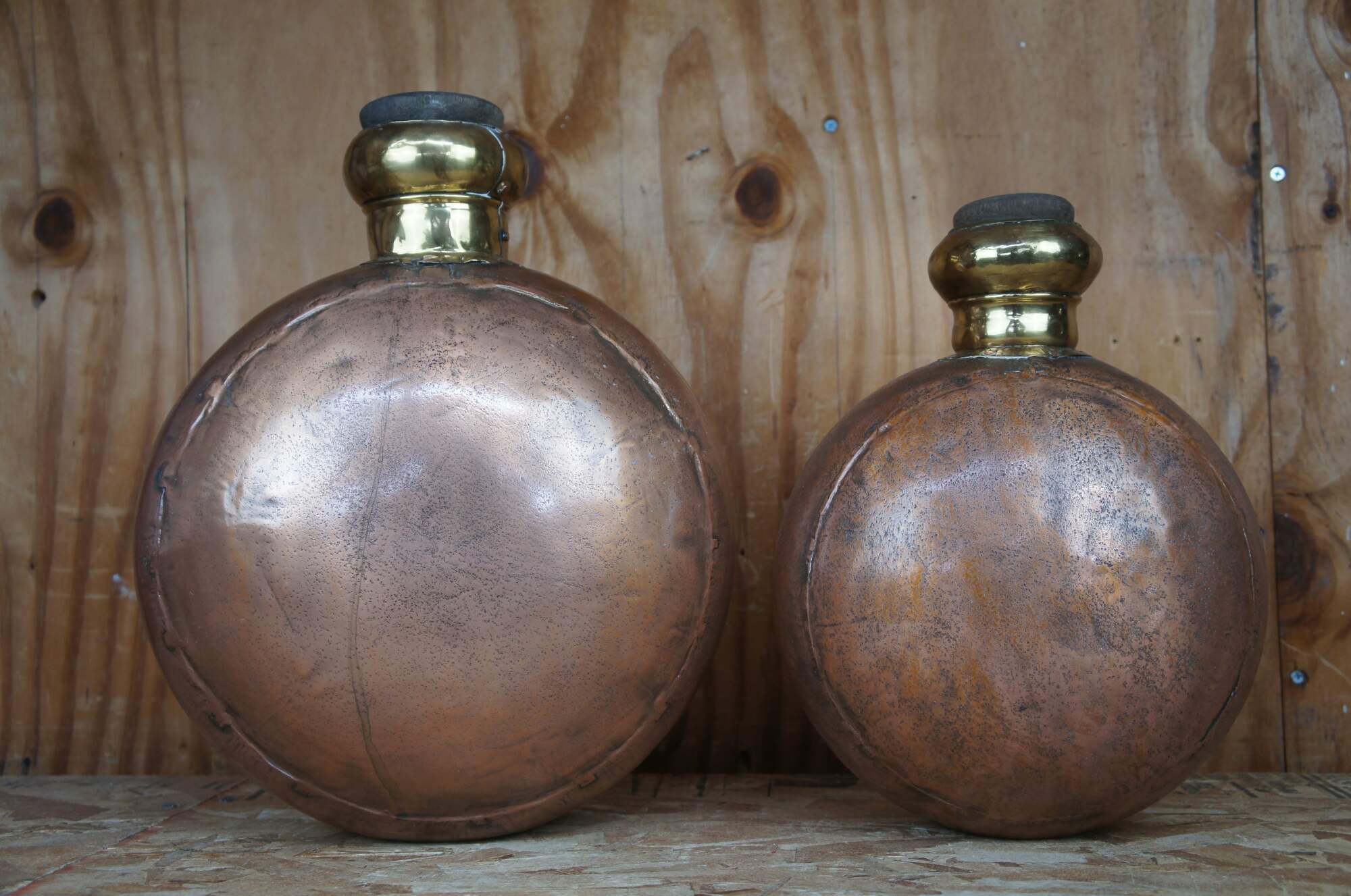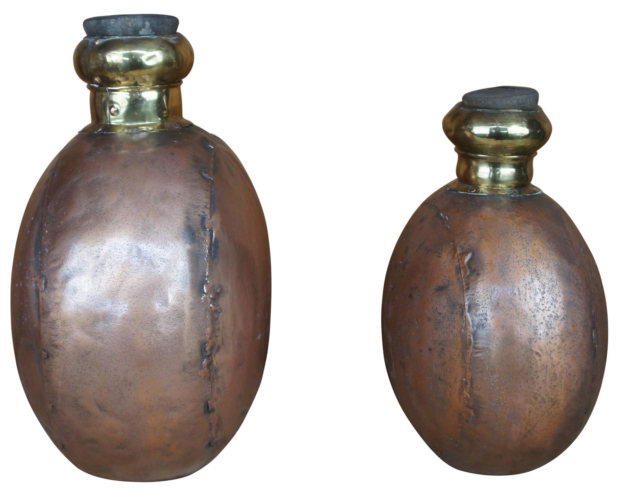 Two large vintage copper canister jugs, bottles or vases featuring cork stopper and dovetailed accents. From India.
