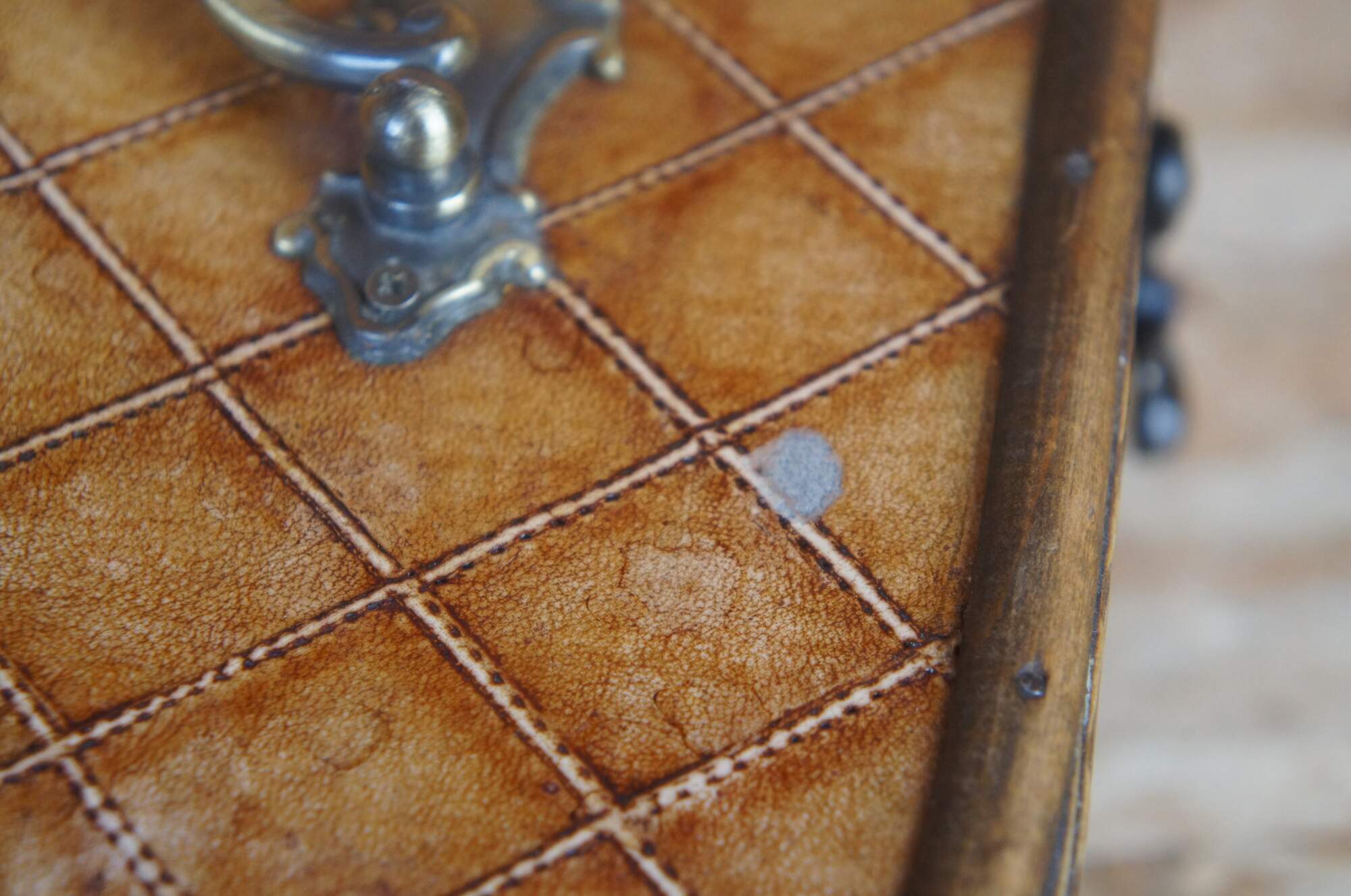 Vintage oval lidded box or case featuring brass folding handle and clasp.
