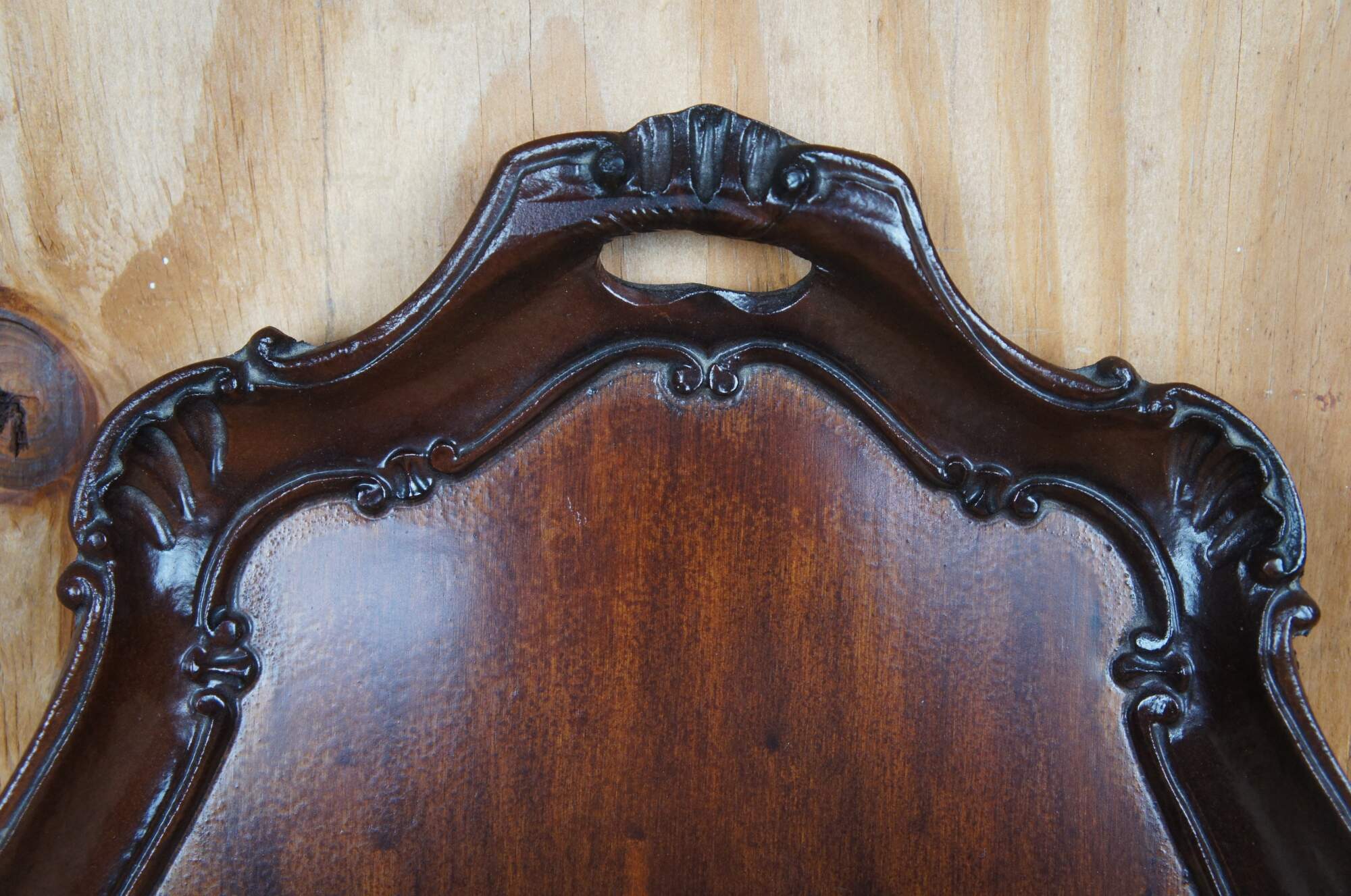 Four vintage Neiman Marcus Rococo or Baroque style mahogany bar, coffee or tea trays featuring ornate scalloped form with handles. Made in Italy.