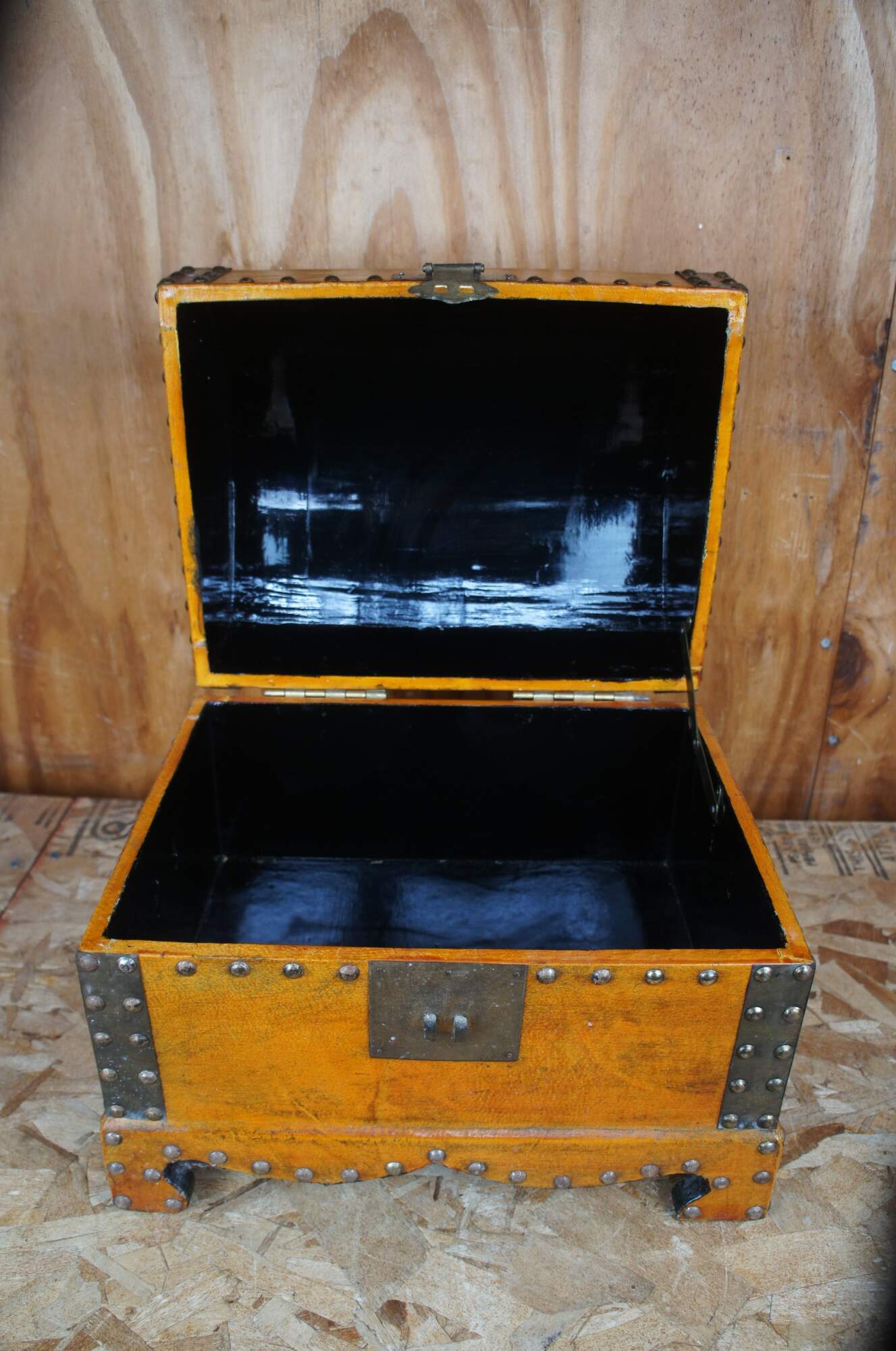 Vintage dome top leather chest, letter, keepsake, jewelry, storage lock box featuring footed base with nailhead accents, brass banding, Chinese lock, and black lacquered interior.