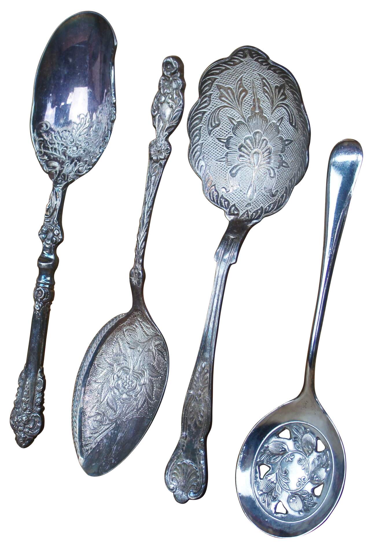 4 vintage serving spoons in various patterns, 3 unmarked, one serving spoon in acorn pattern, stamped with Leonard silver plate Italy on back.