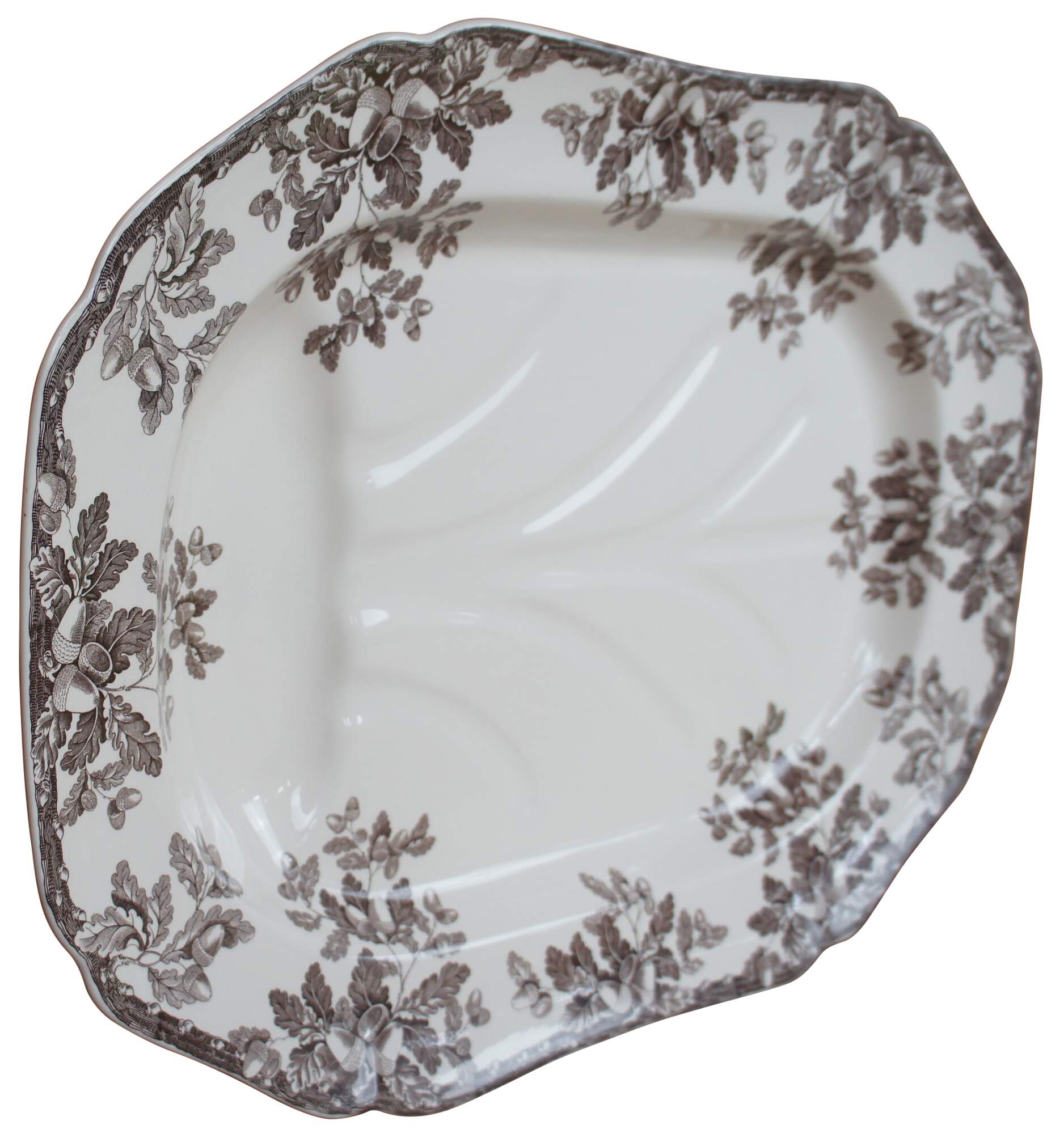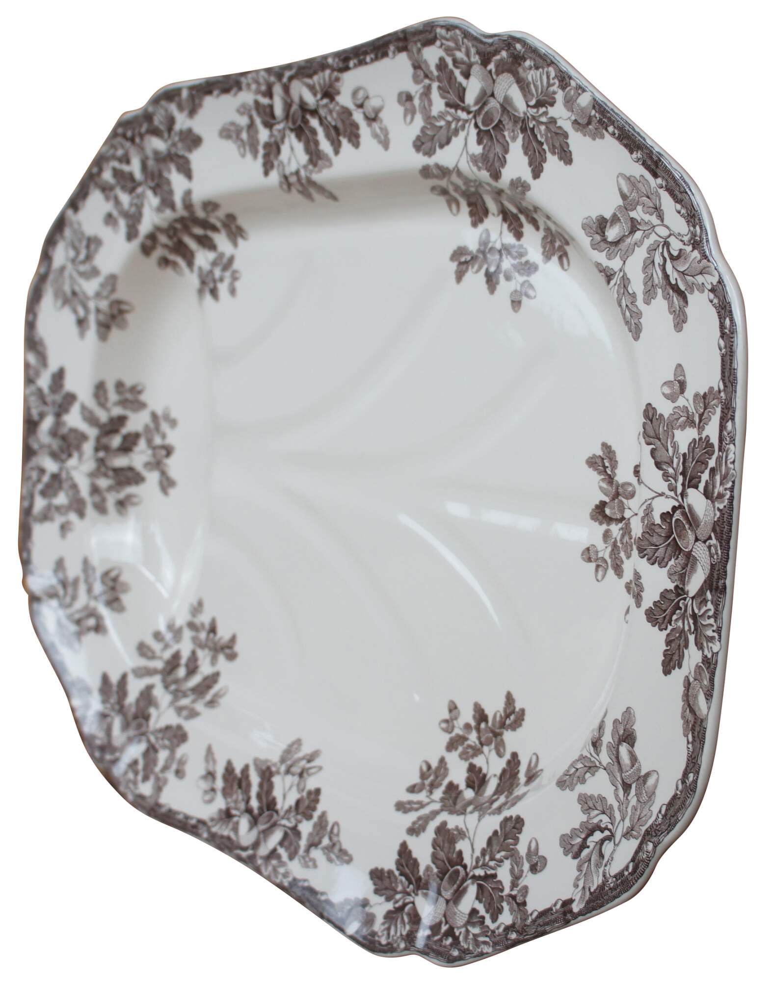 Vintage large Thanksgiving Turkey or meat serving platter by Williams Sonoma in the Manor brown acorn pattern featuring a juice well or basin for draining. Marked Williams-Sonoma Home, Spode, Made in England, Dishwasher and Microwave safe.