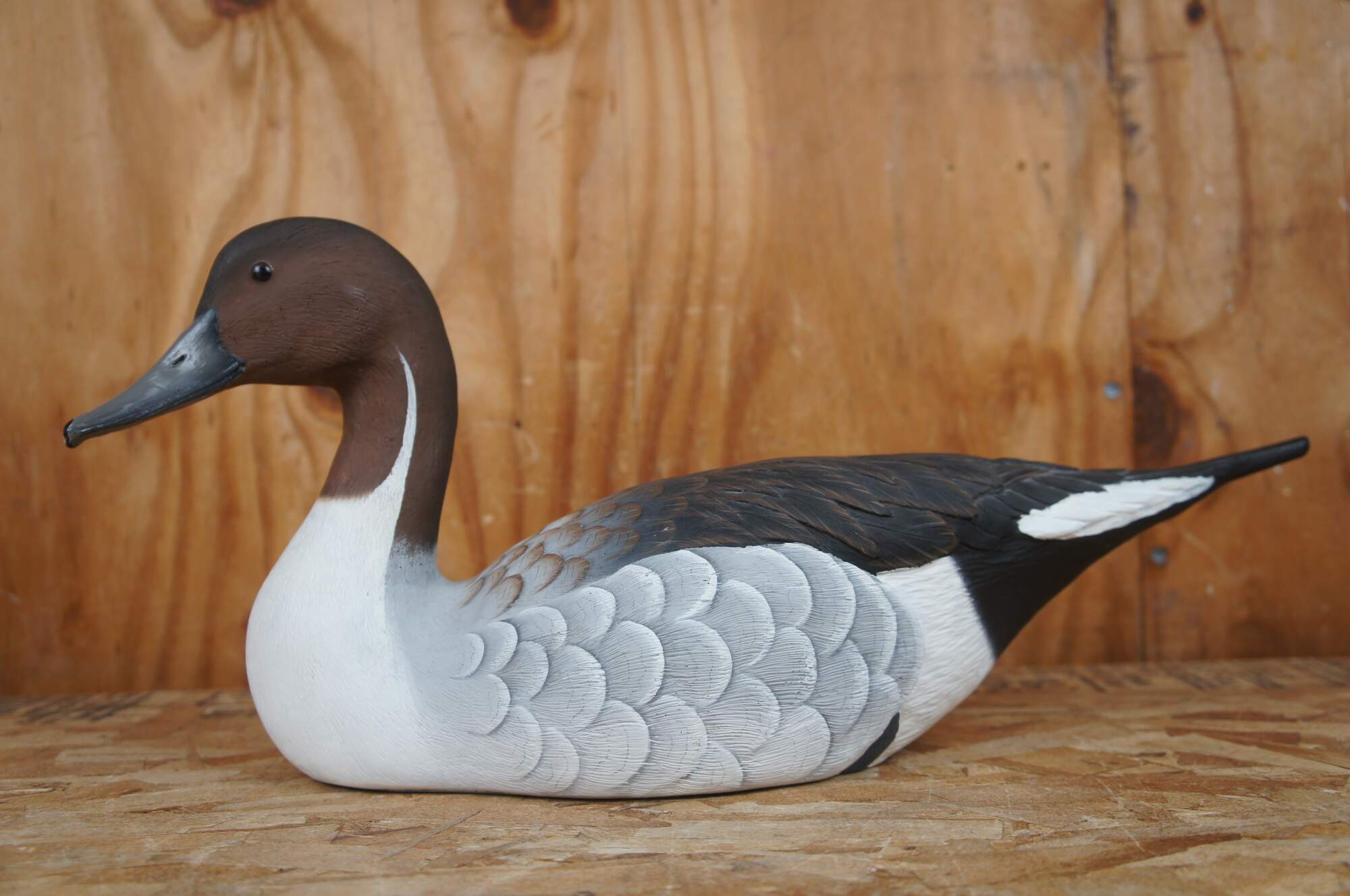 Three vintage signed duck decoys including: mallard drake signed W Downs (for Rosella) 1989, loon signed L Lightfoot 1990, and pintail drake signed September 1989. One of the ducks was made by Craft Tex Inc in High Point NC for the American Wildlife Collection, circa 1985. Another has a 1983 mark.