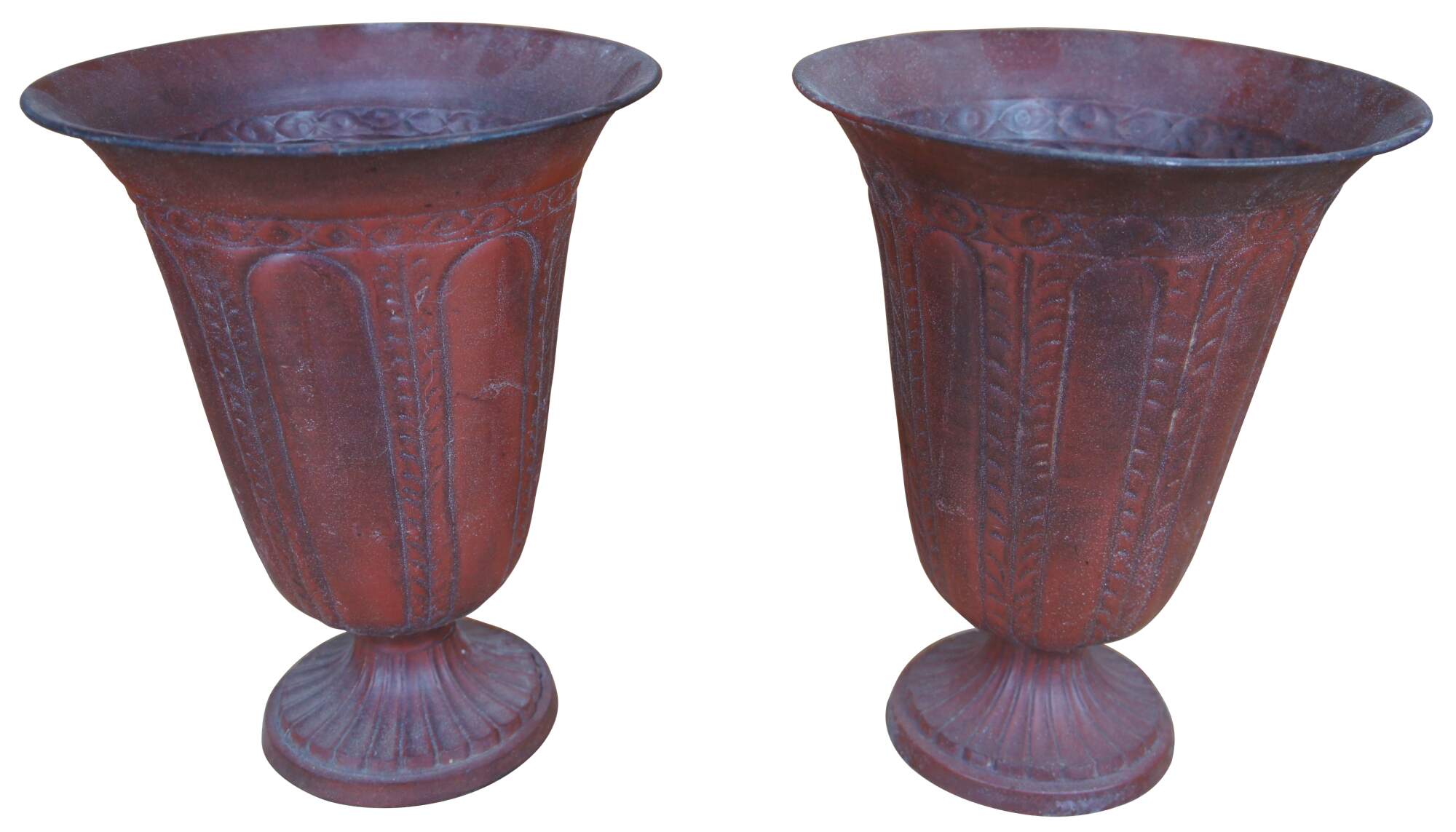 Pair of vintage embossed metal flower or garden urns featuring flared tapered form with footed base.