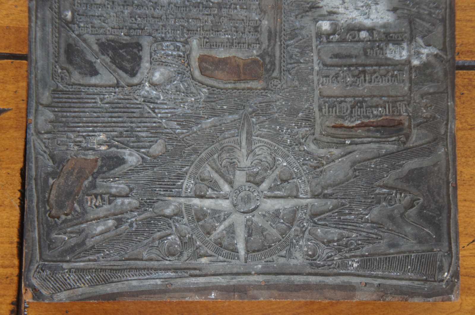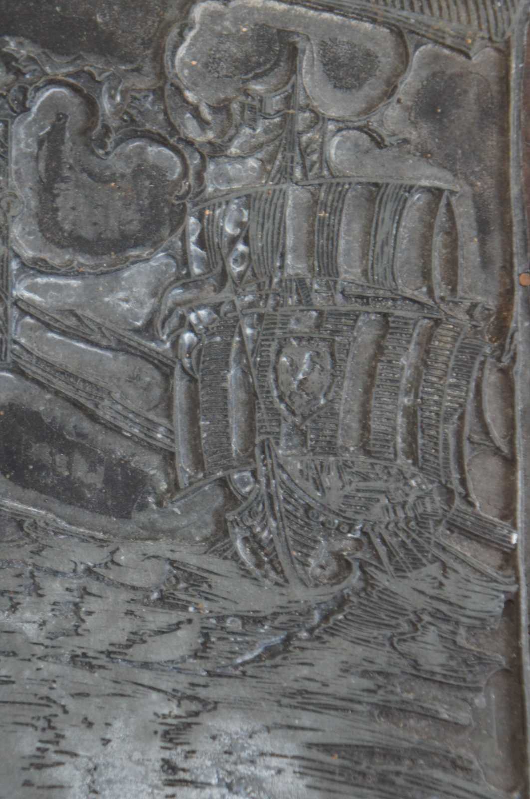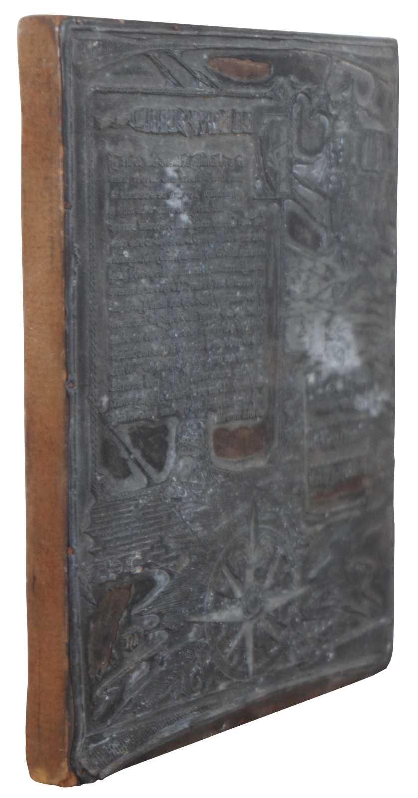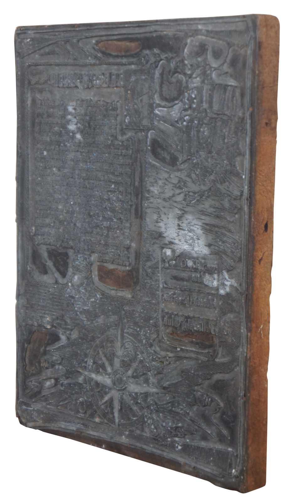 Antique metal print block mounted on wood, featuring a nautical/navigation motif with a sailing ship / boat, and fleur de lis compass rose framing a paragraph about the virtue of Fellowship.