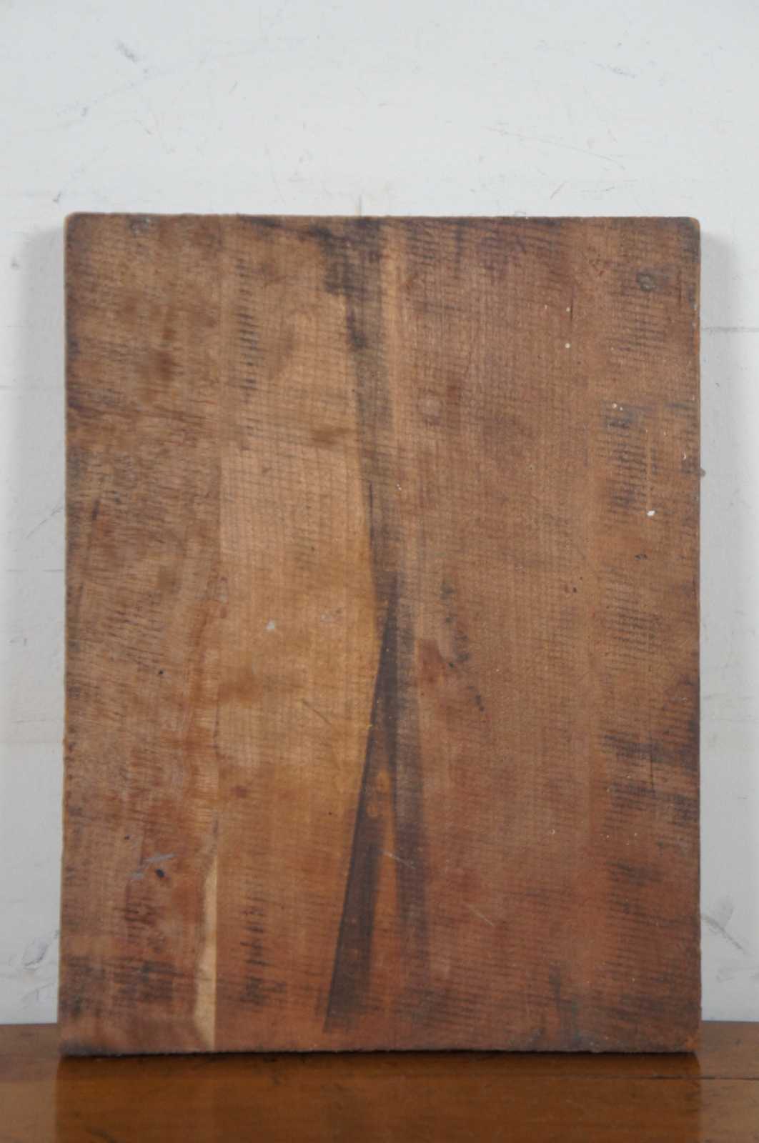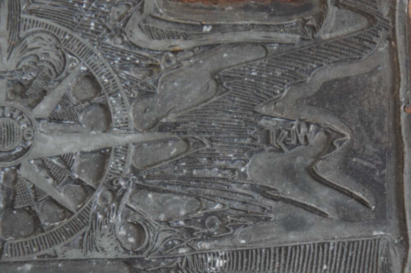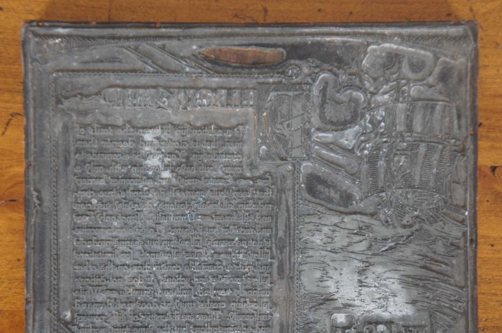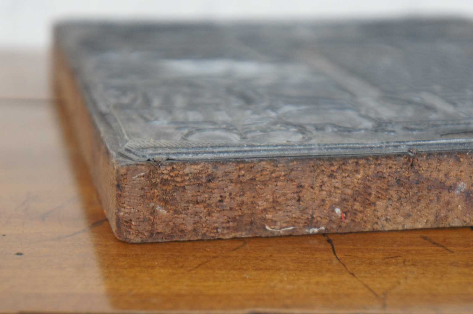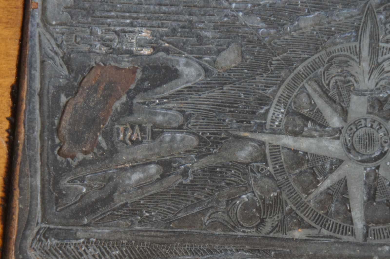 Antique metal print block mounted on wood, featuring a nautical/navigation motif with a sailing ship / boat, and fleur de lis compass rose framing a paragraph about the virtue of Fellowship.