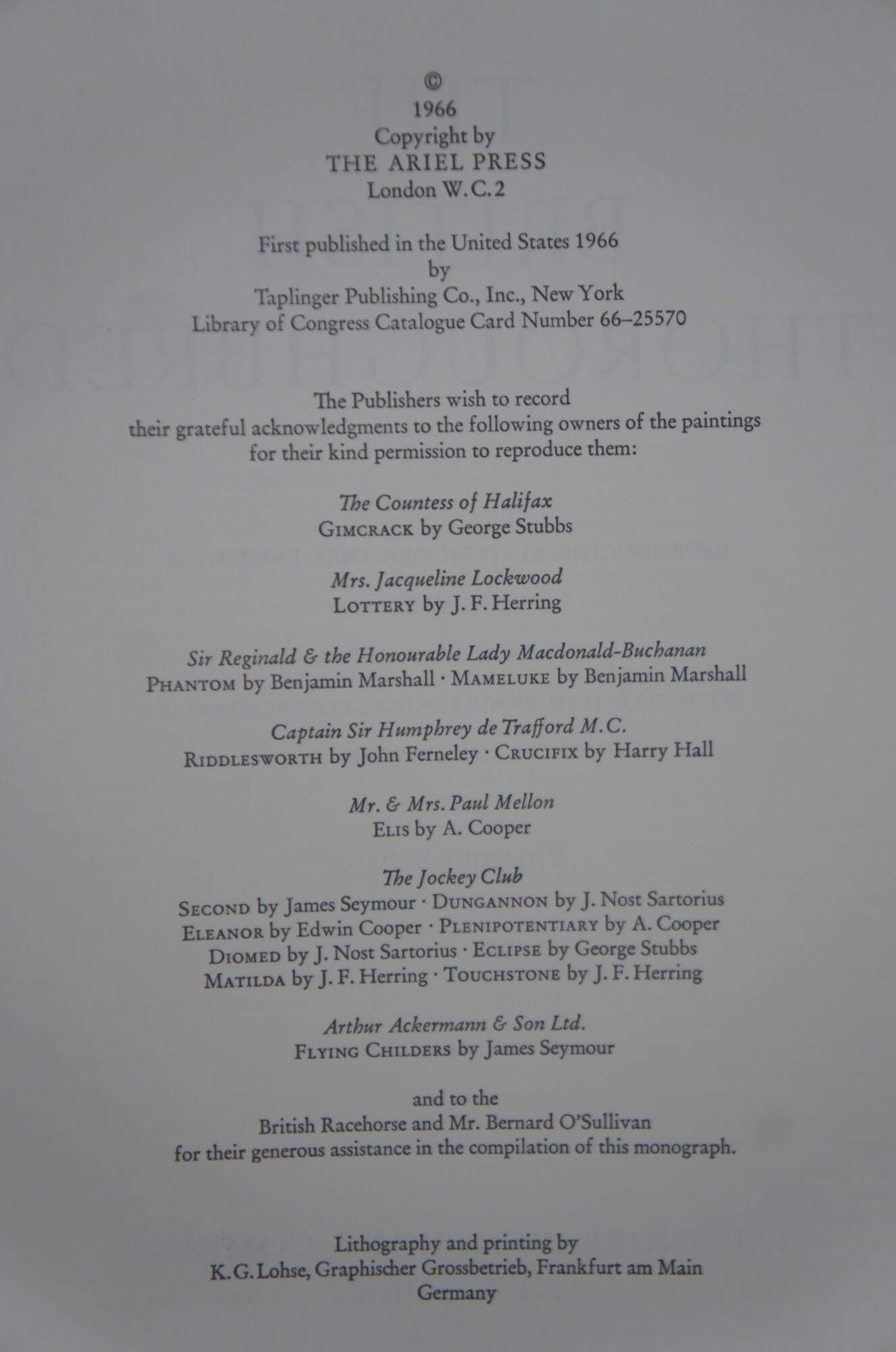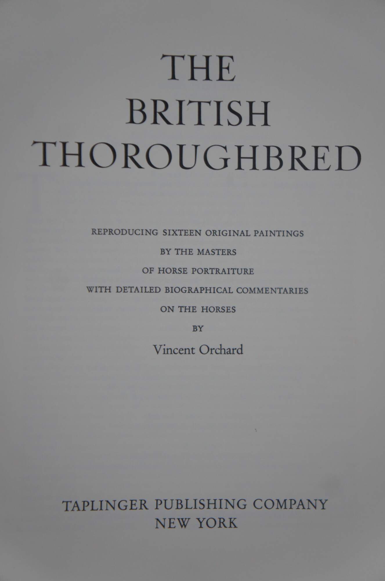 Cloth cover oversize coffee table hard back book, “The British Thoroughbred 1700-1850: Reproducing Sixteen Original Paintings by the Masters of Horse Portraiture with Detailed Biographical Commentaries on the Horses,” by Vincent Orchard, produced by Taplinger Publishing Company, copyright by The Ariel Press, 1966.