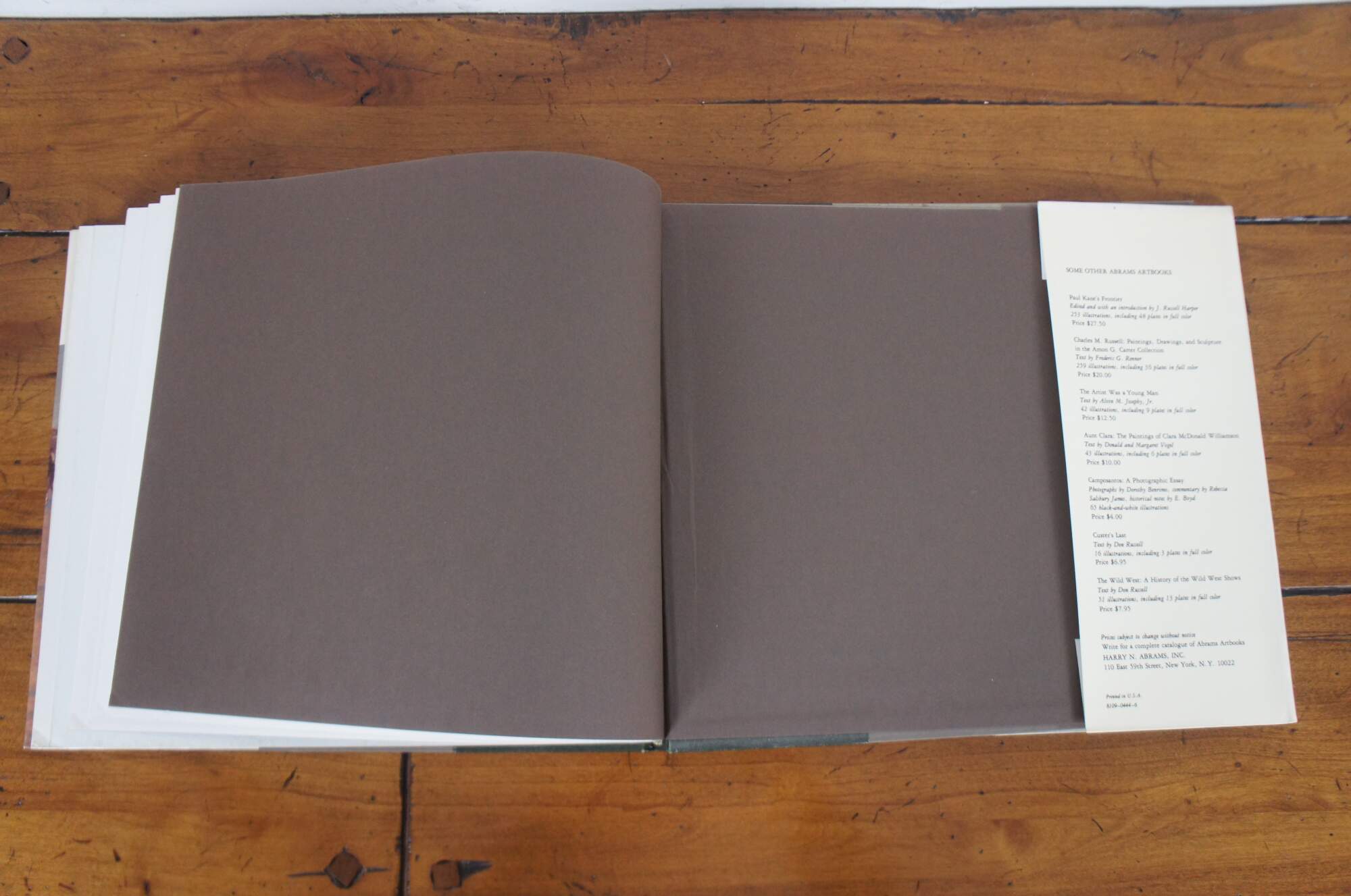 1st edition bonded leather and paper hardback book with dust jacket, “Frederic Remington,” text by Peter H. Hassrick, foreward by Ruth Carter Jhnson, published by Harry N. Abrams Inc in association with the Amon Carter Museum of Western Art, 1973; ISBN: 0-8109-0444-6.