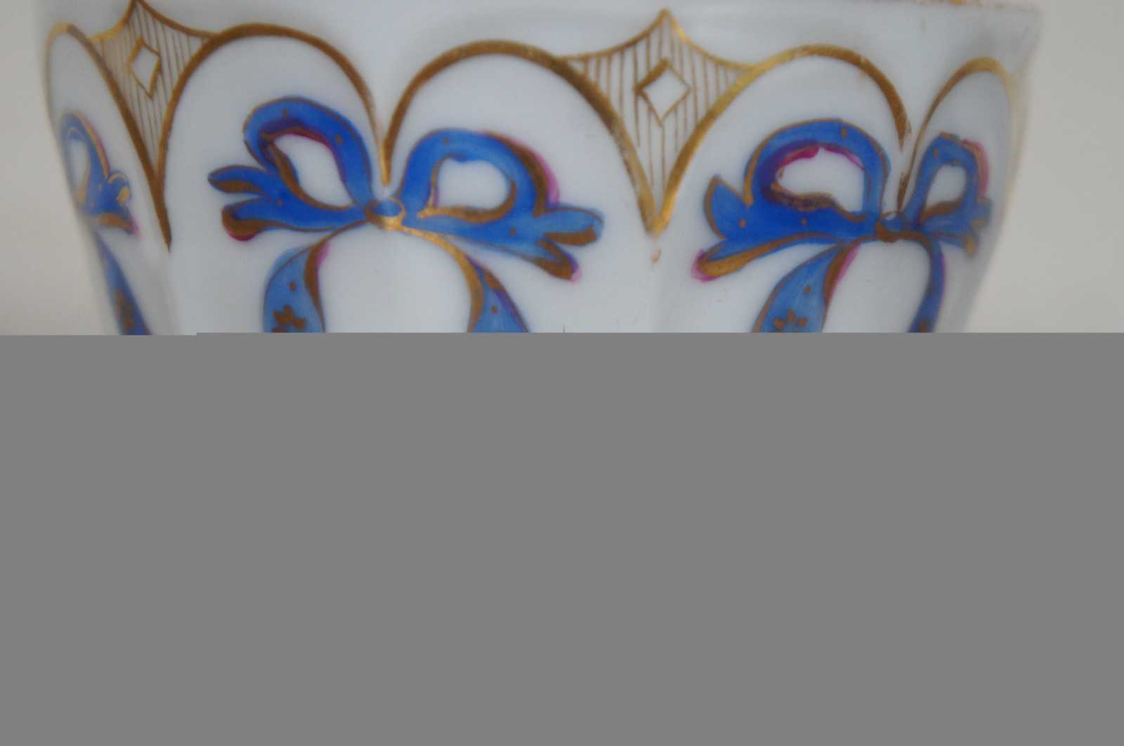 Set of three antique 19th century porcelain tea cups with gilded interior rims and decorated with swags of blue ribbon and small pink roses.
