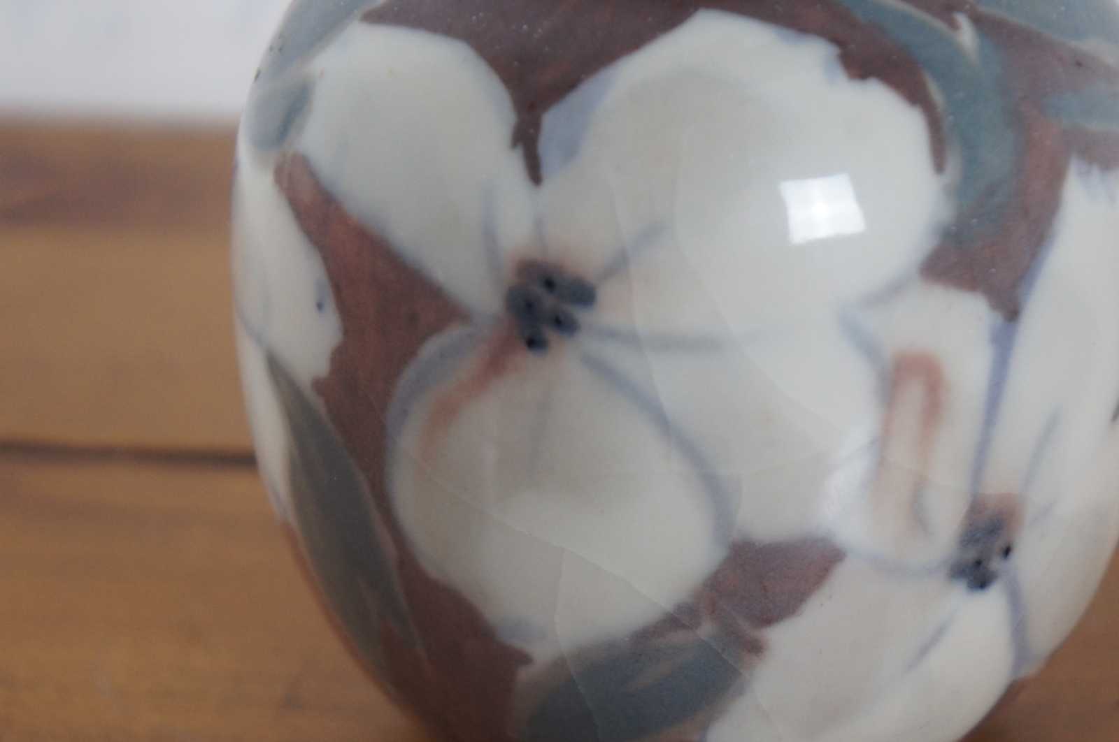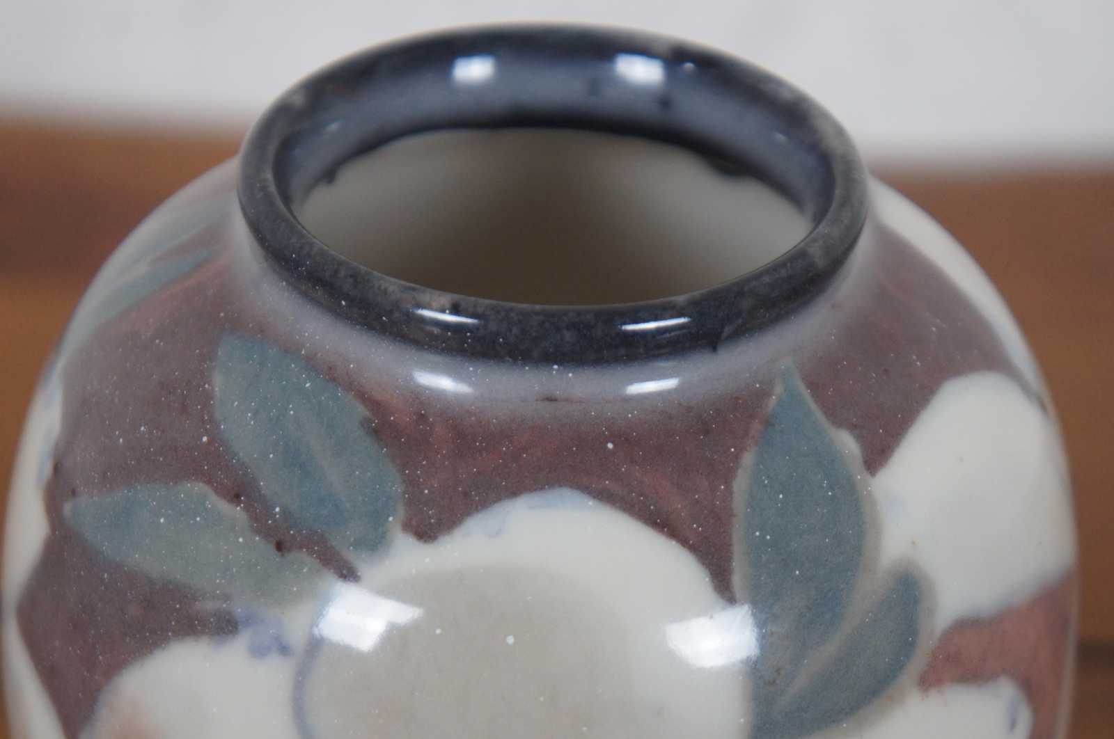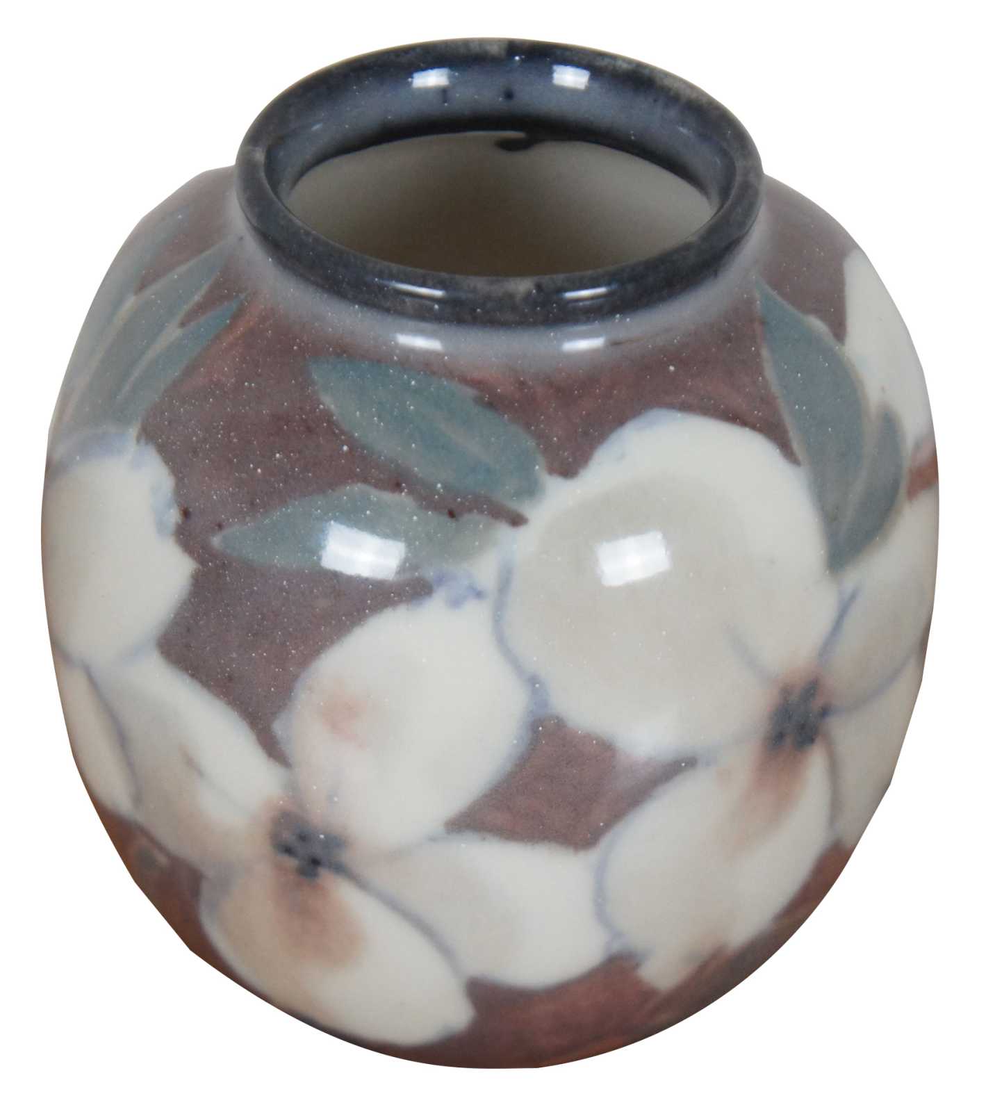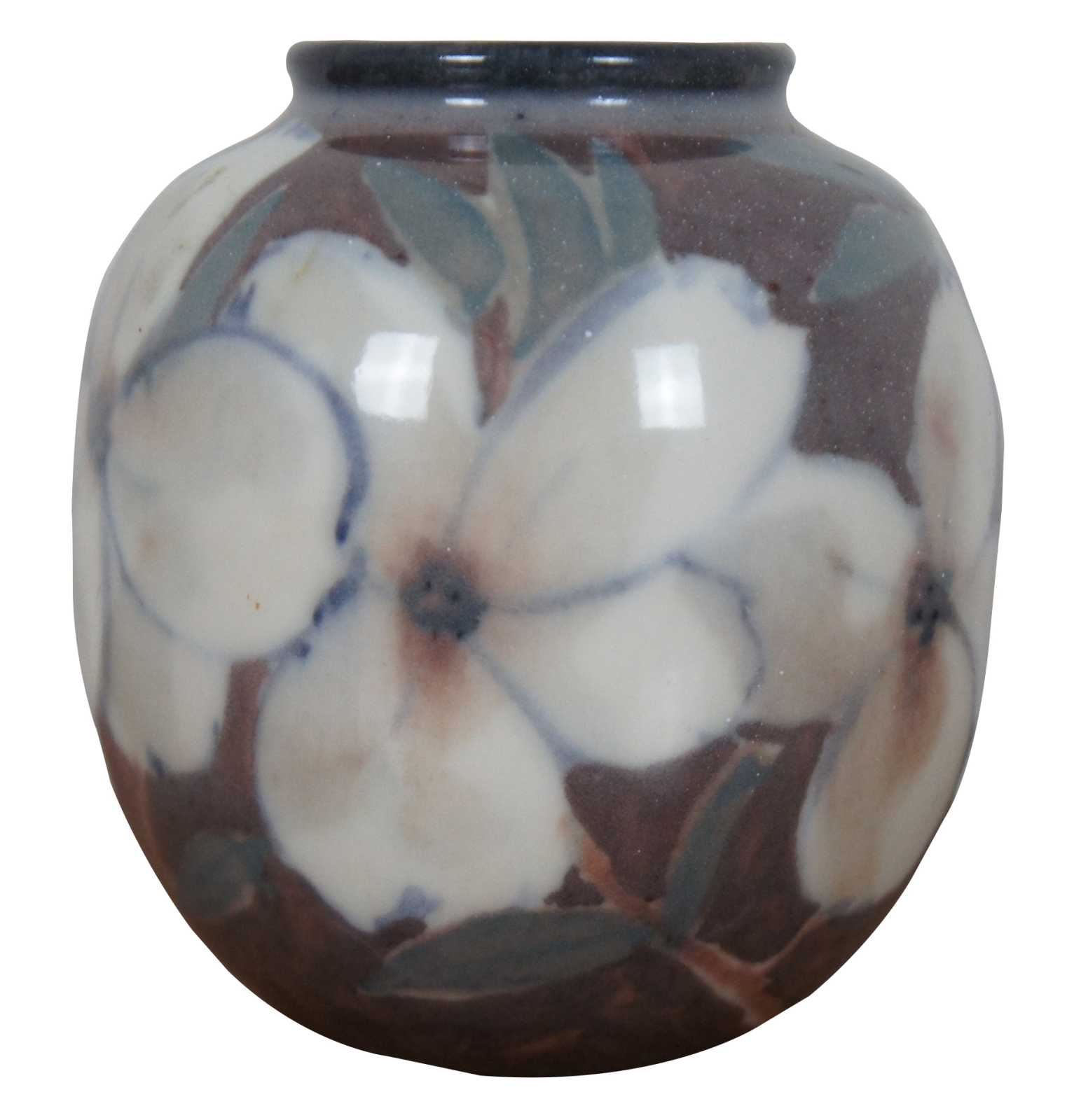 Antique 1944 Rookwood Pottery porcelain vase with a floral design by Jens Jensen featuring white dogwood or magnolia blossoms on a mottle brown ground.