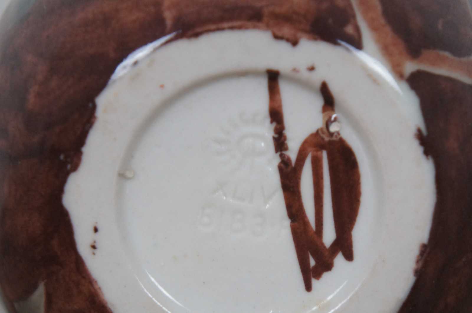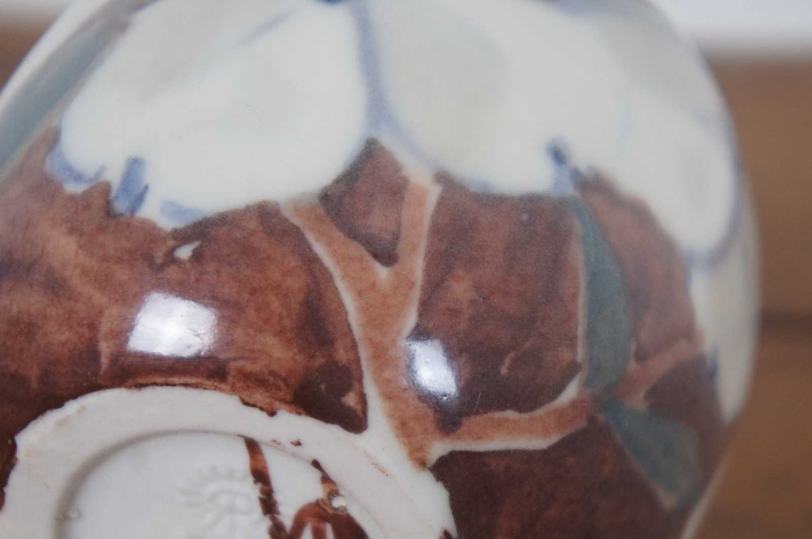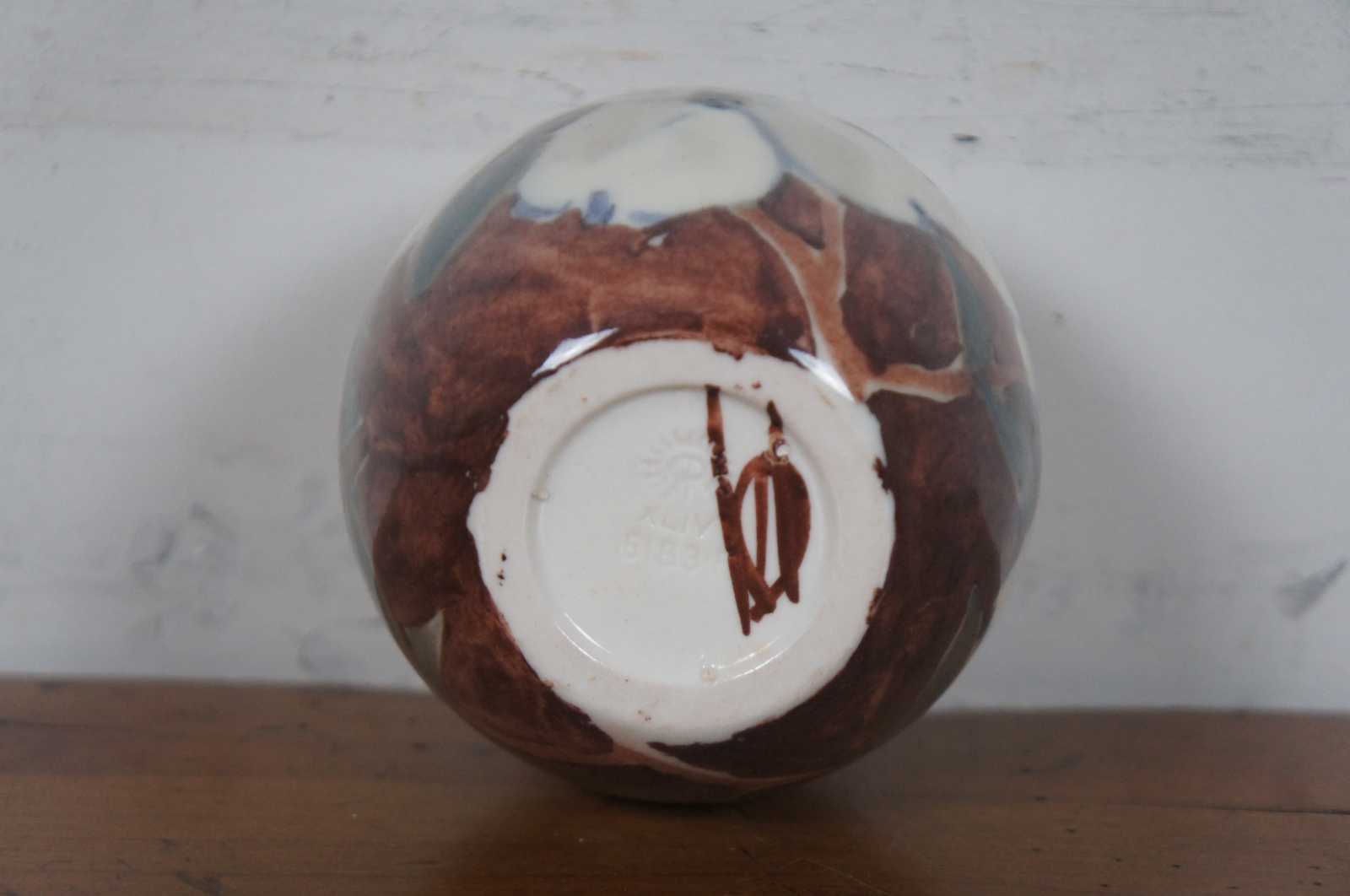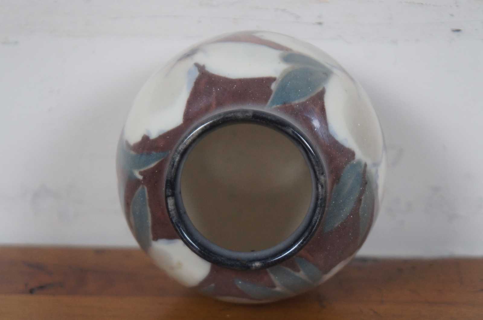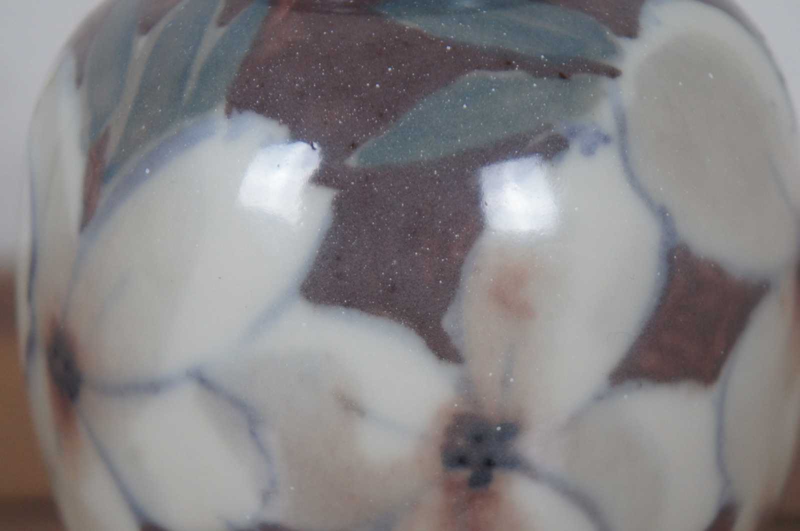 Antique 1944 Rookwood Pottery porcelain vase with a floral design by Jens Jensen featuring white dogwood or magnolia blossoms on a mottle brown ground.