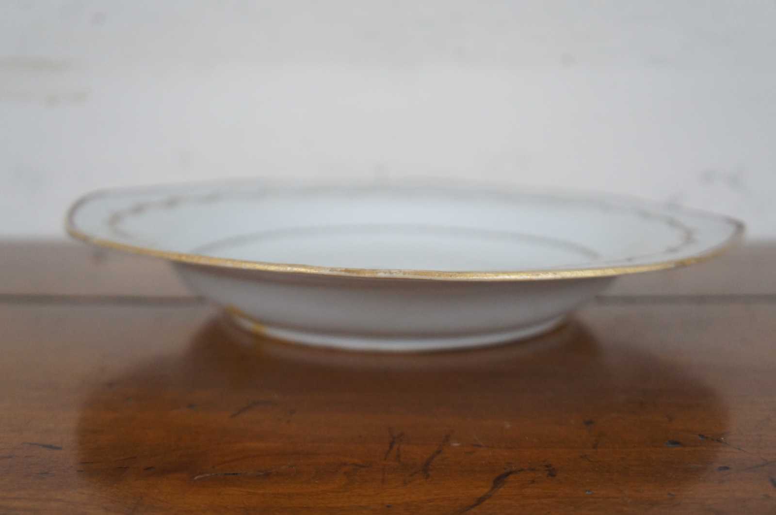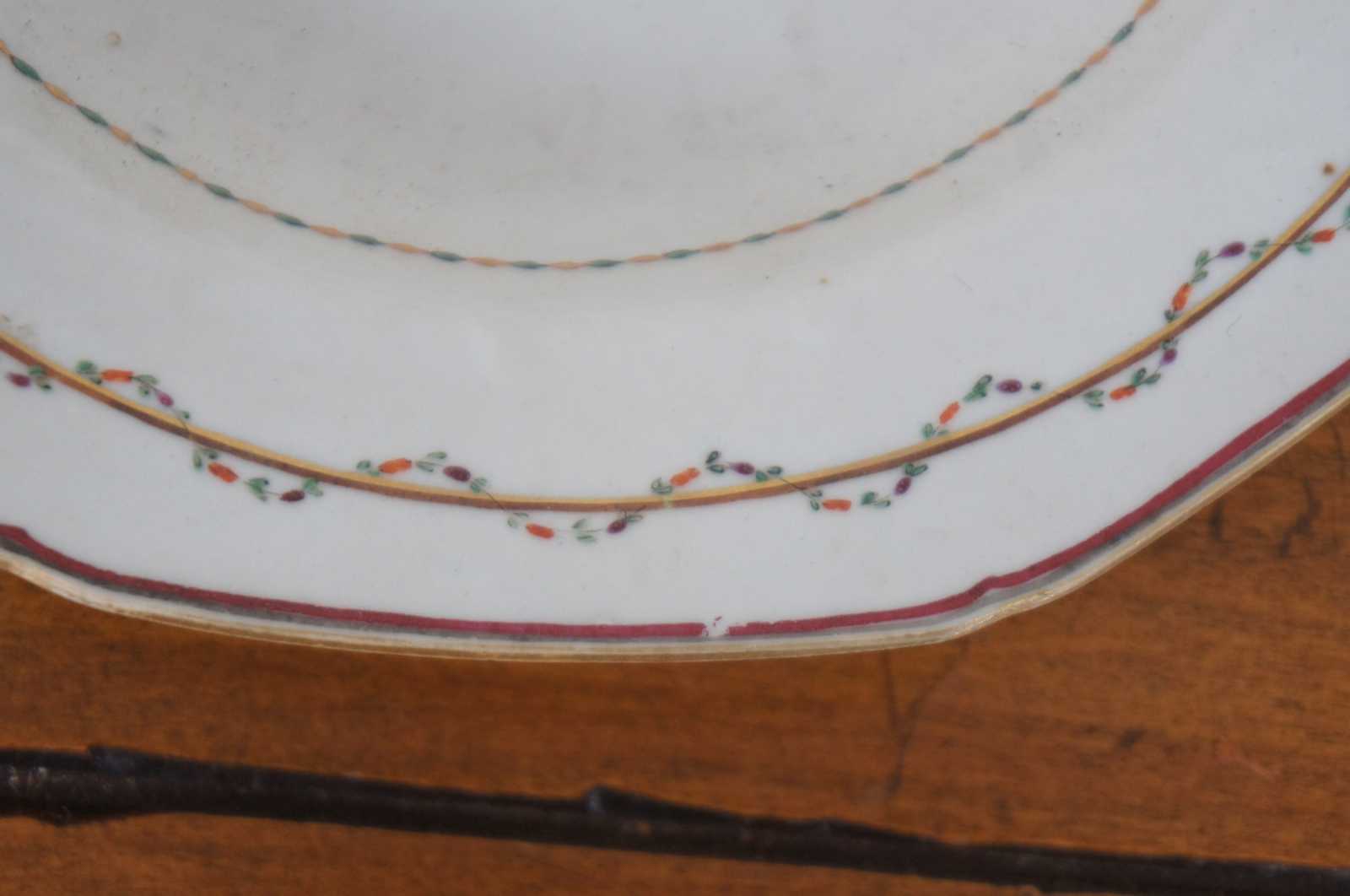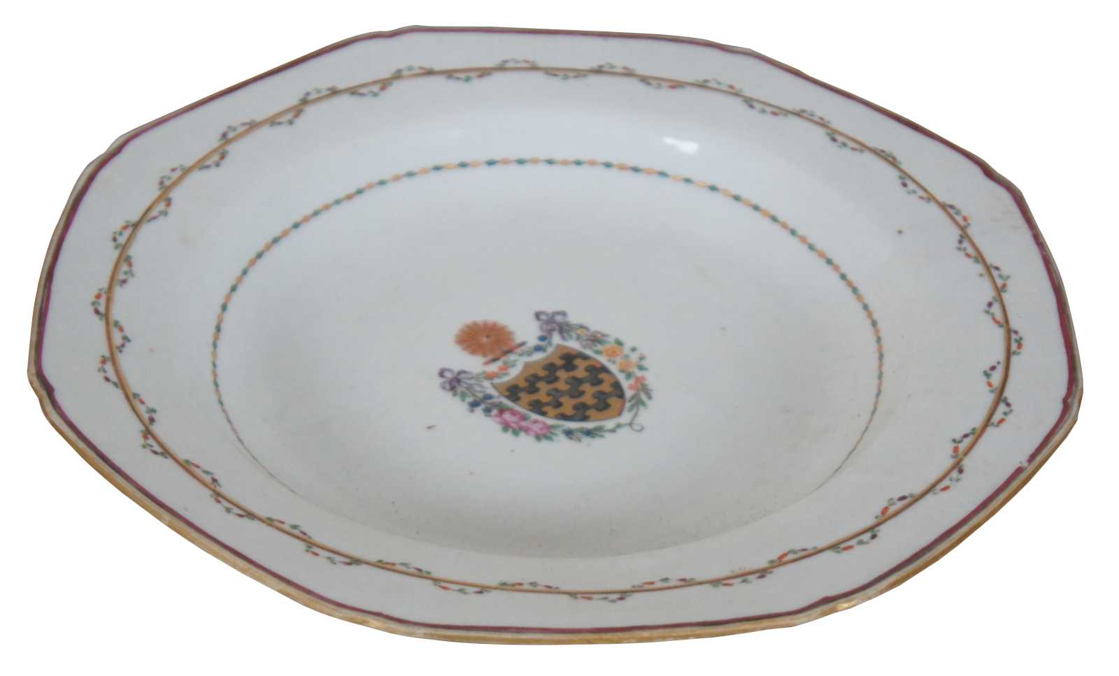 Antique late 18th to early 19th century Chinese Export (Qianlong Period, circa 1780) porcelain hexagonal soup plate with floral swag and a floral armorial coat of arms center shield and all seeing eye.