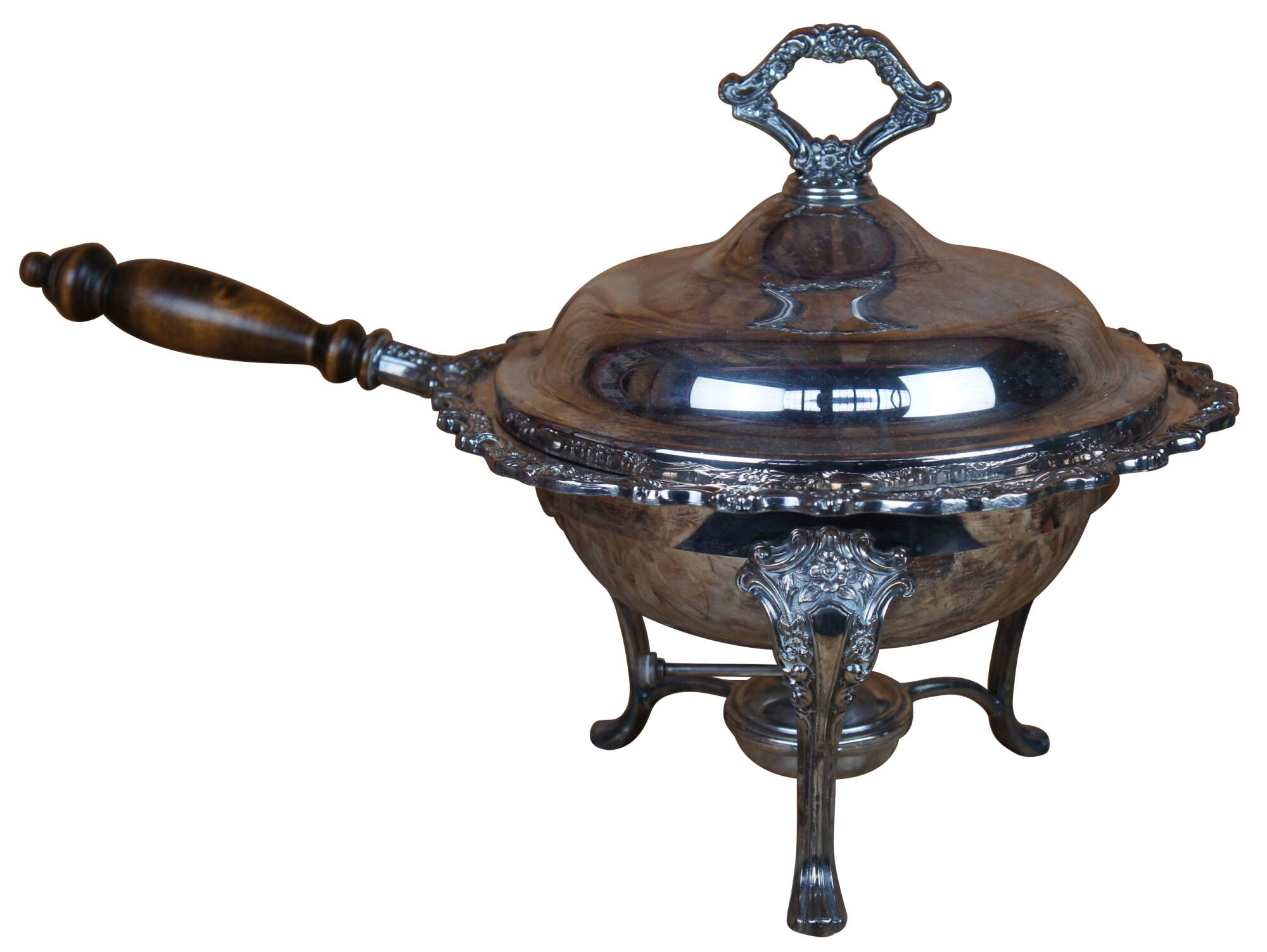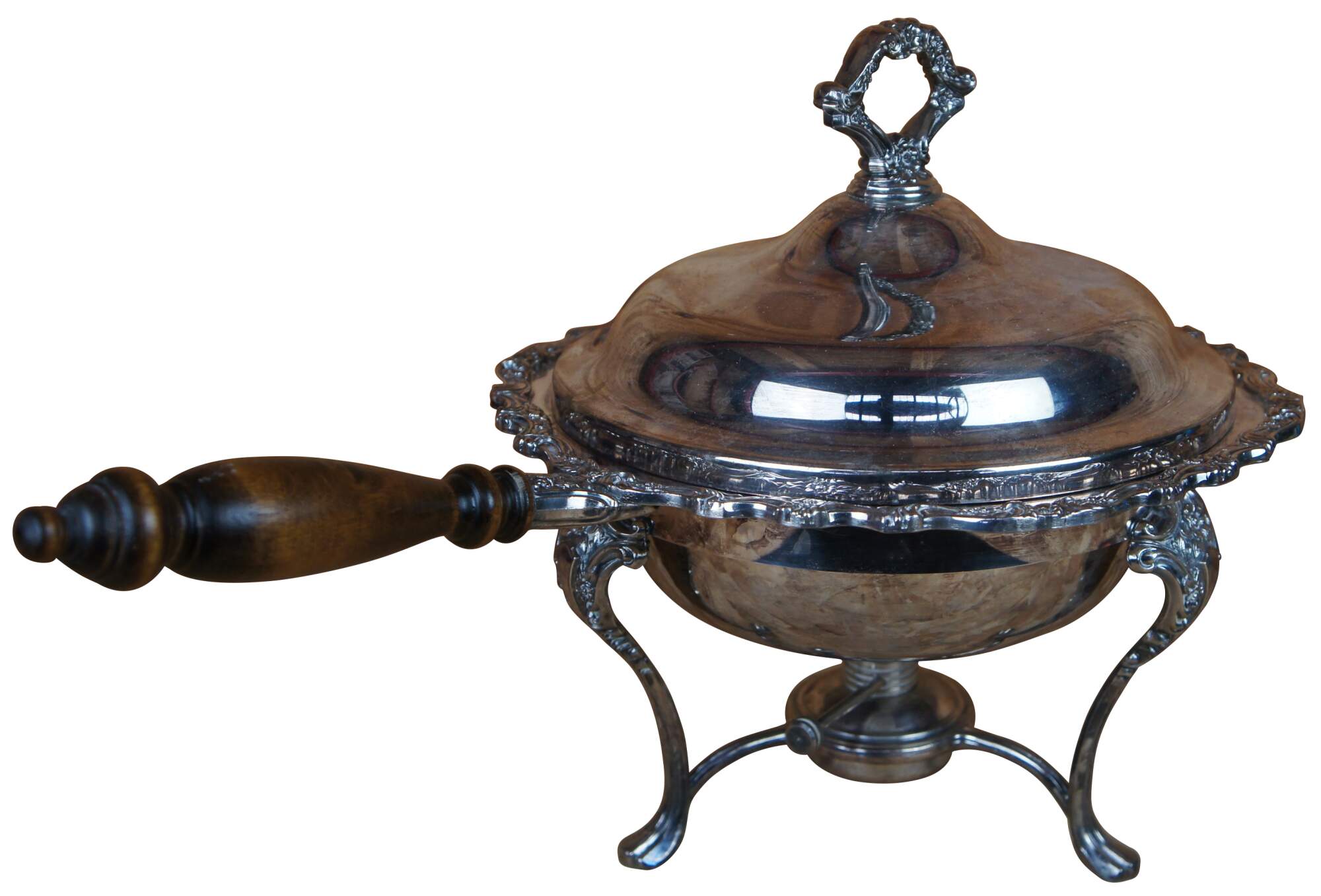 Webster Wilcox Oneida chafing dish featuring rose design with burner, lid, stand and wood handle.