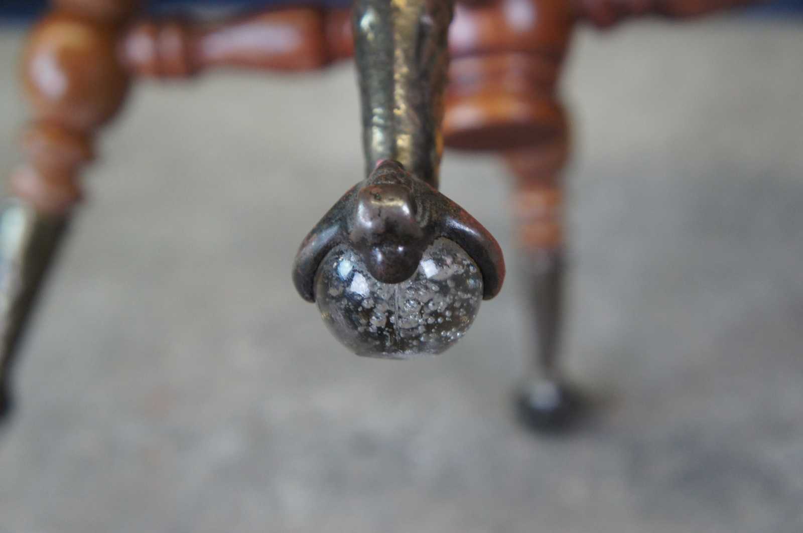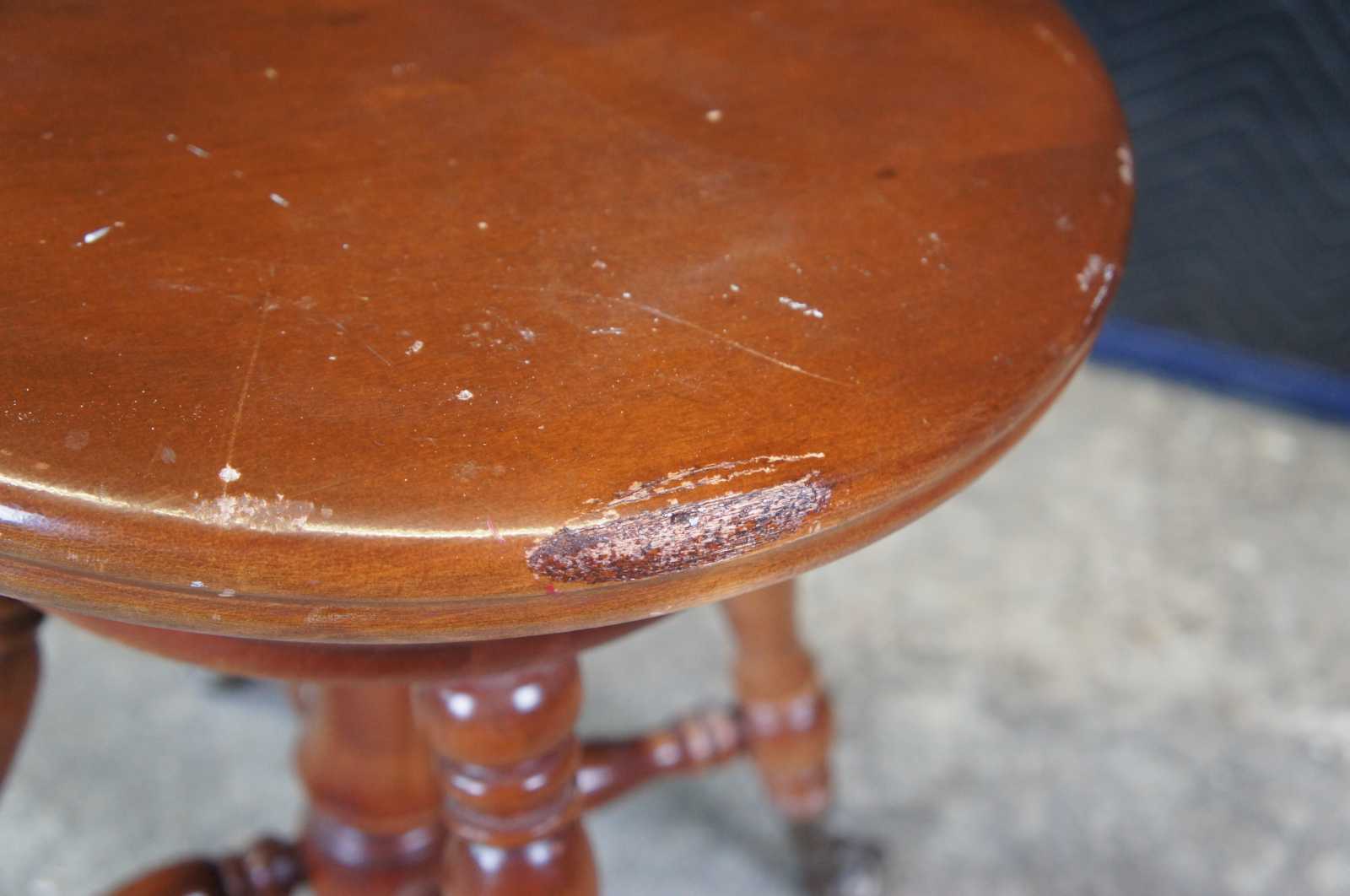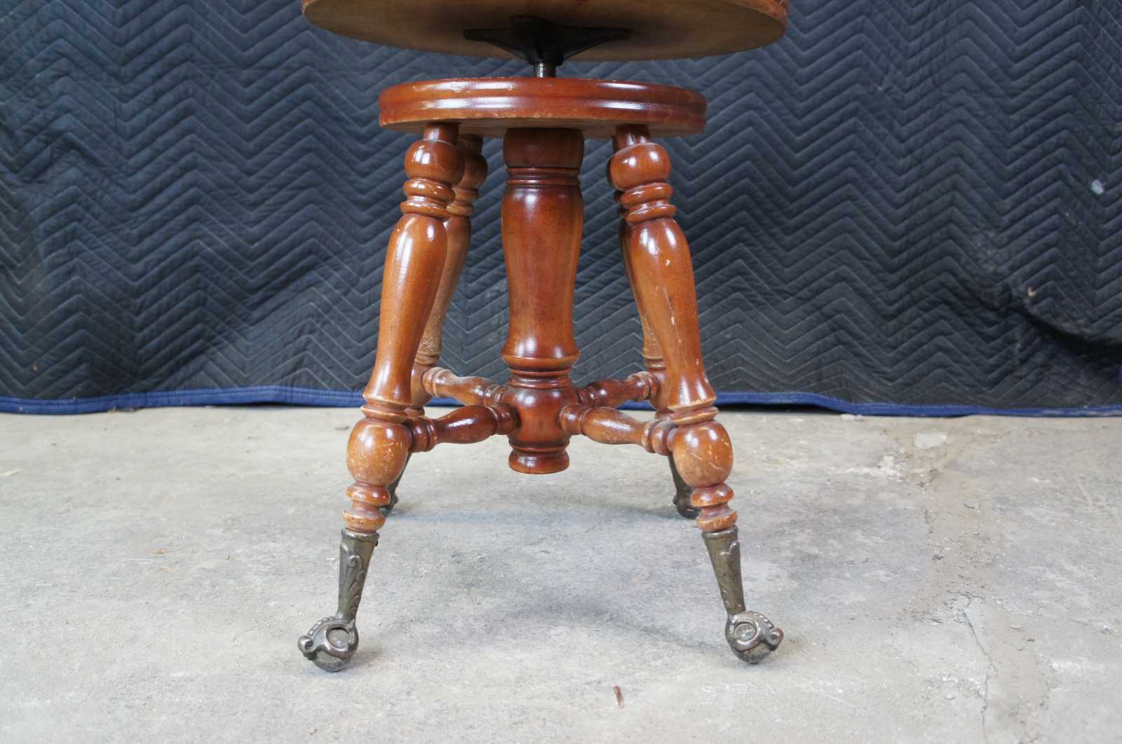 Racine Mfg. Co piano stool. Circa 1909-1925. A classic Victorian design supported by metal talon feet hold glass balls