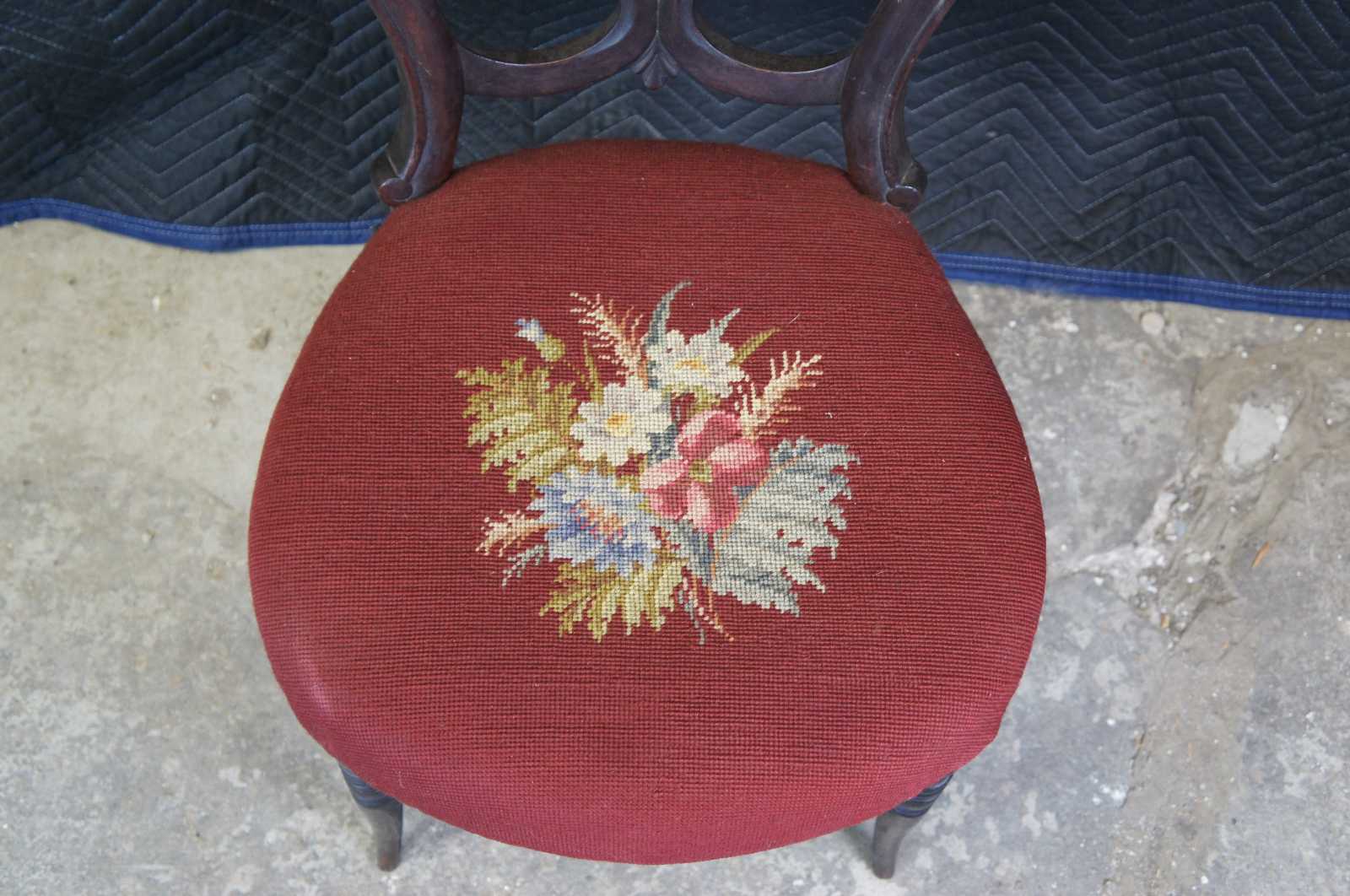 Antique 19th Century balloon back chair. Made of mahogany featuring serpentine form with balloon shaped back, needlepoint seat and turned accents.
