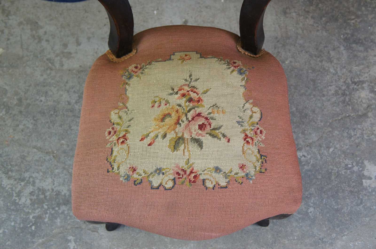 Antique Victorian mahogany chair featuring balloon back and needlepoint seat.