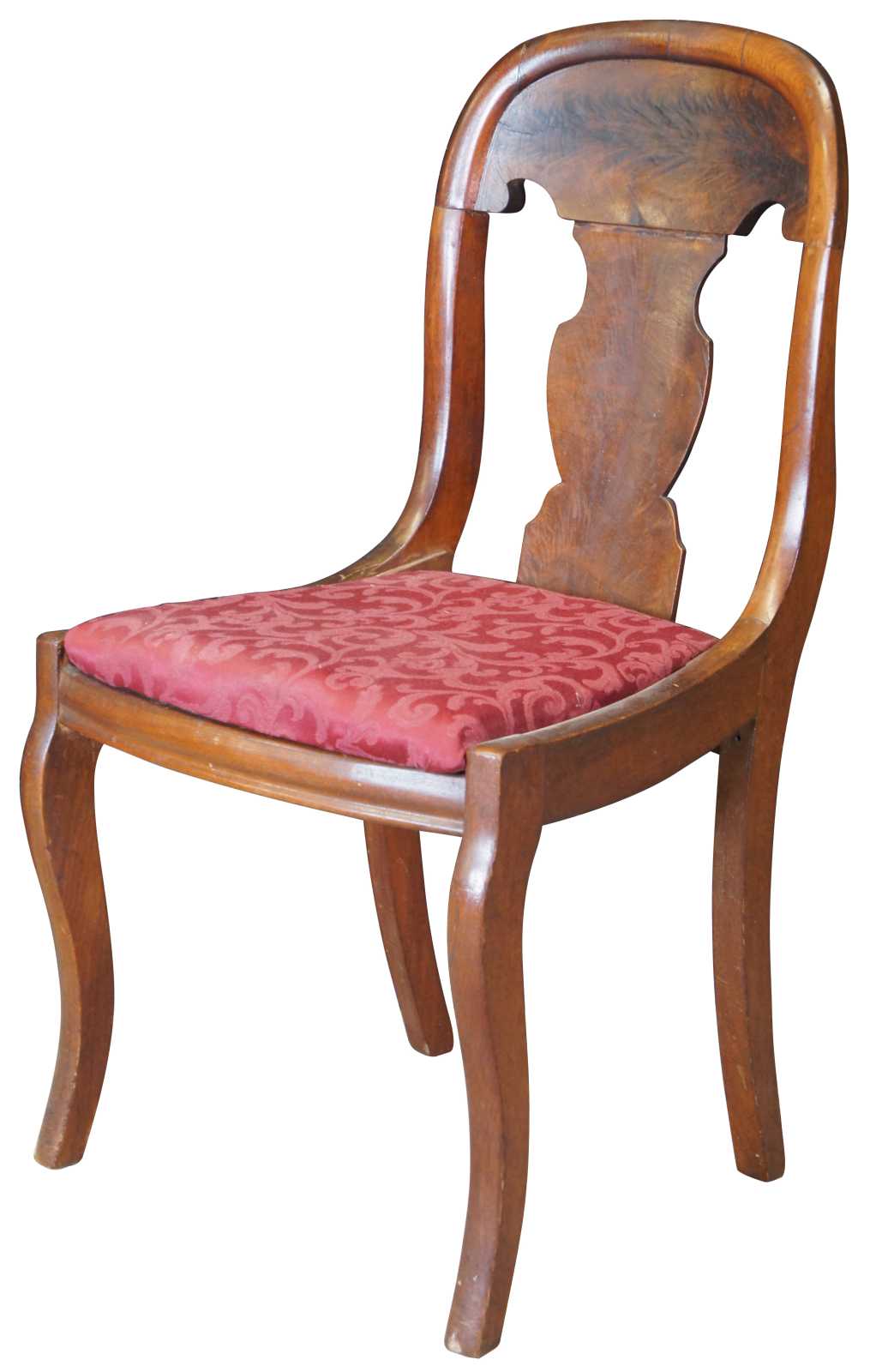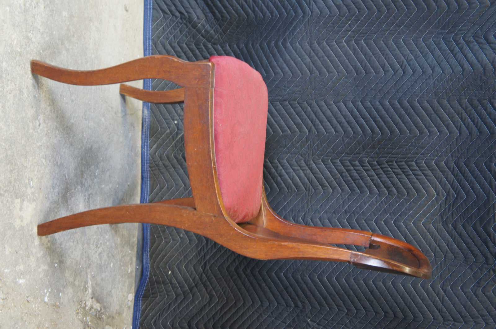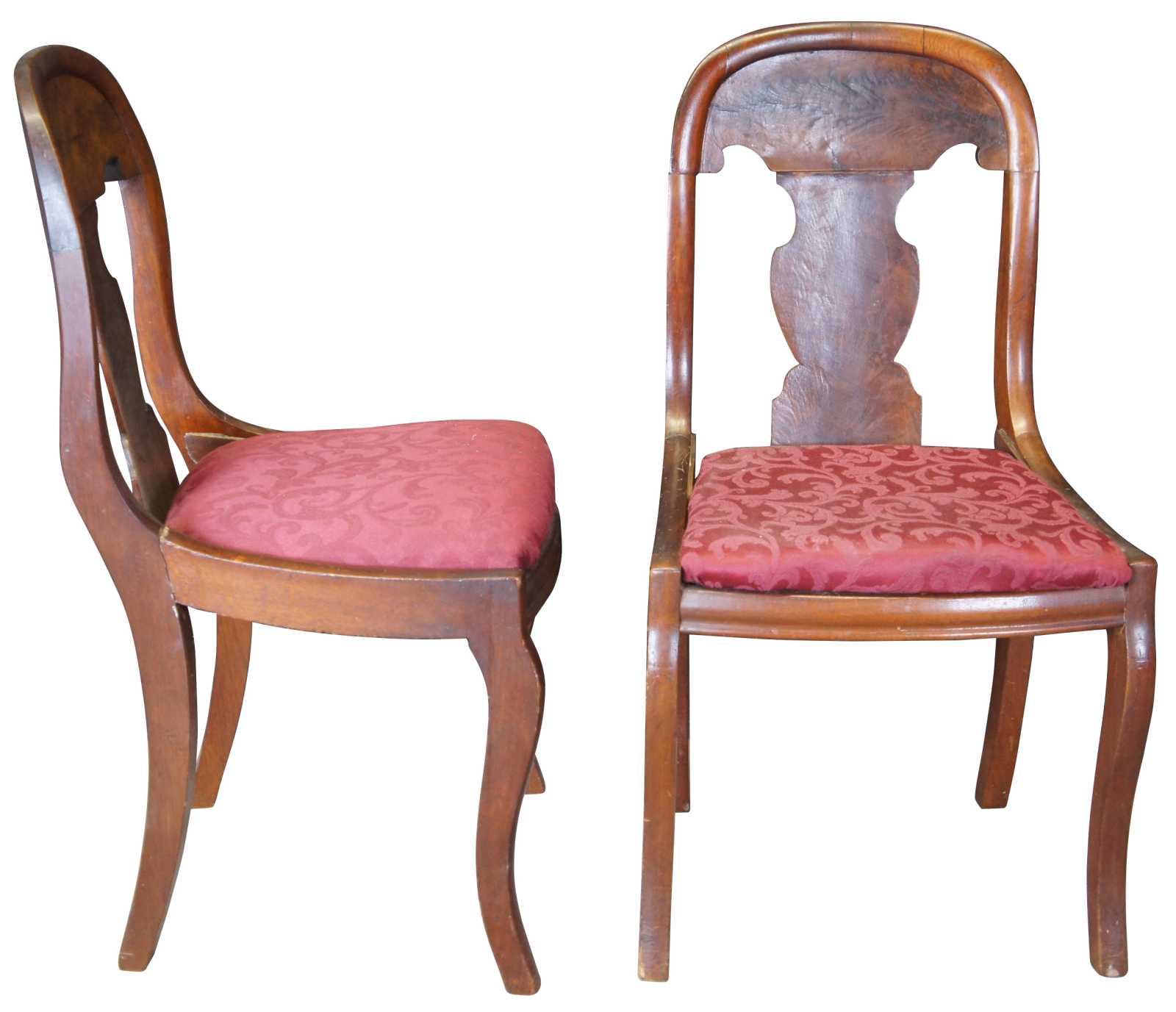 Set of six early 19th century American Empire Period Dining Chairs. Made from crotch mahogany with a smooth rail over scrolled crest and vase shaped splat. Seats feature an upholstered in red with a brocade design.