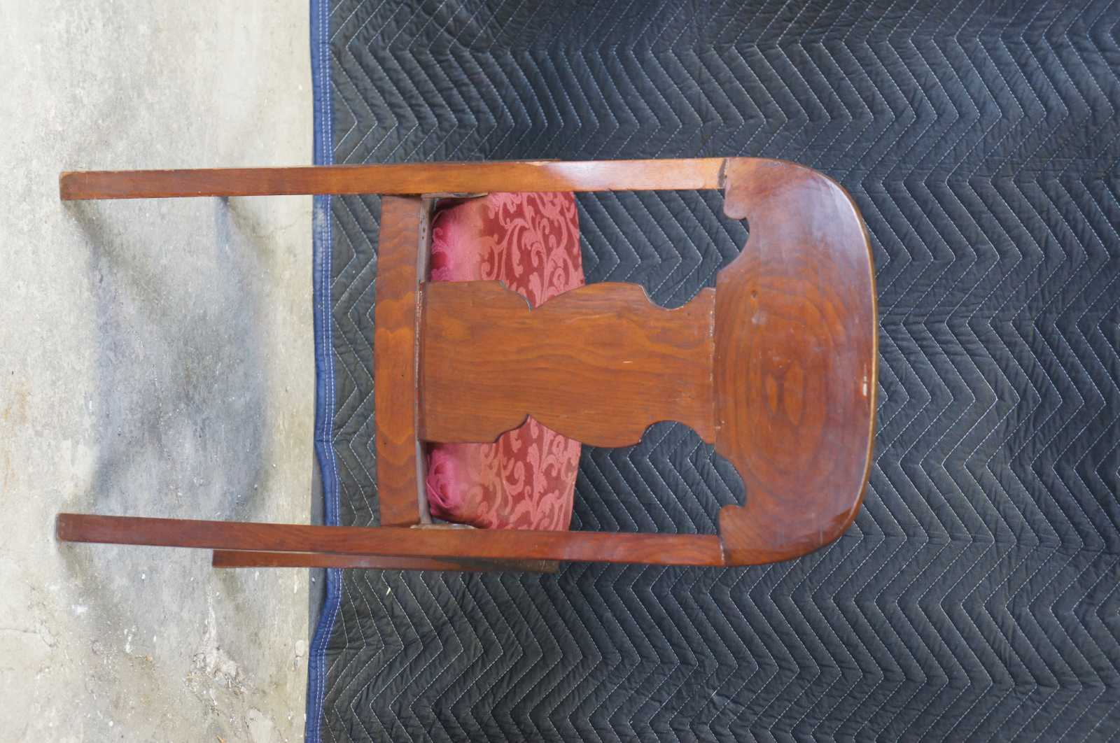 Good overall condition, wear and distressing commensurate with age and use, rubbing, splitting, veneer alligatoring/crazing, past repair to one splat.