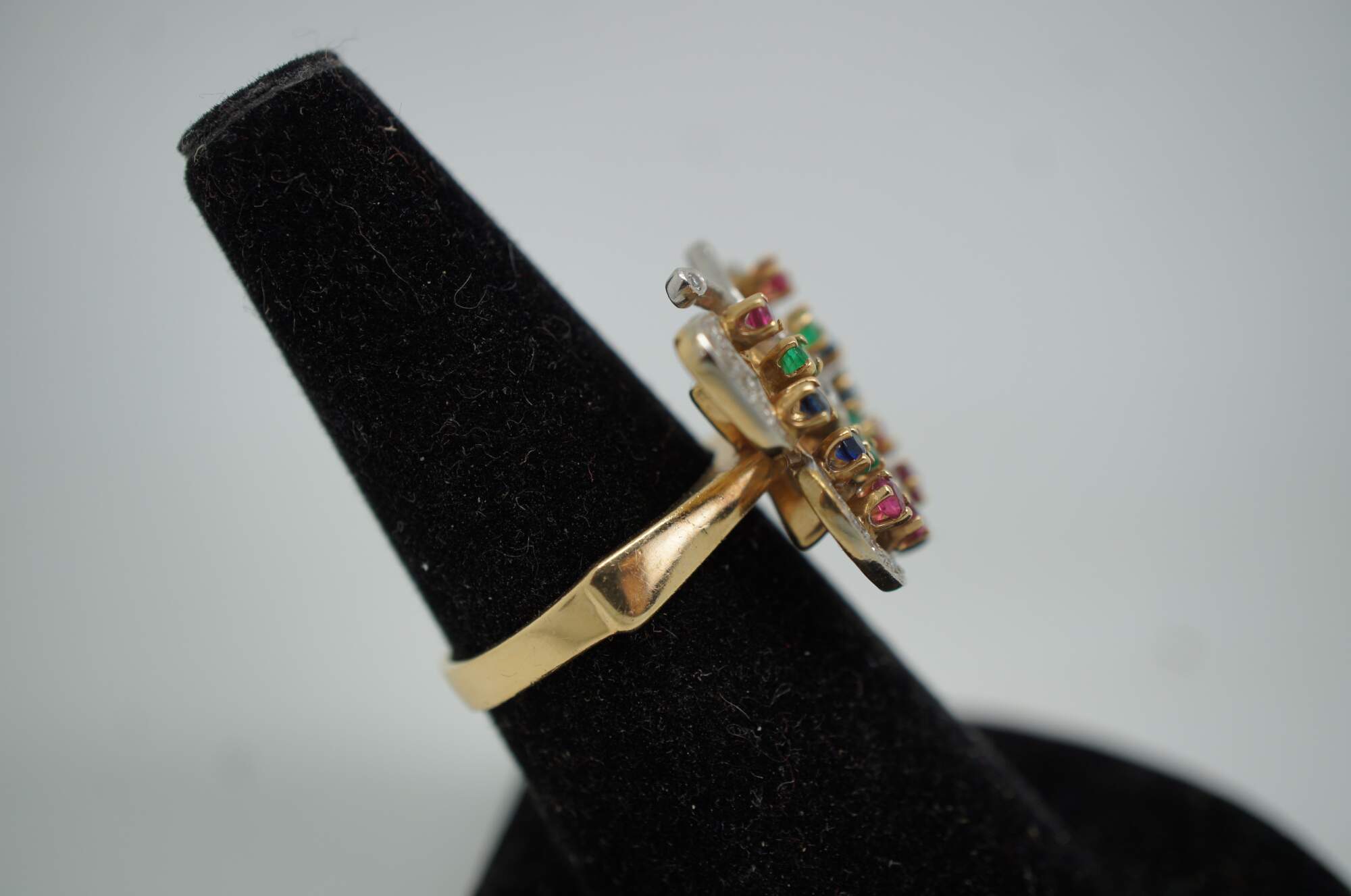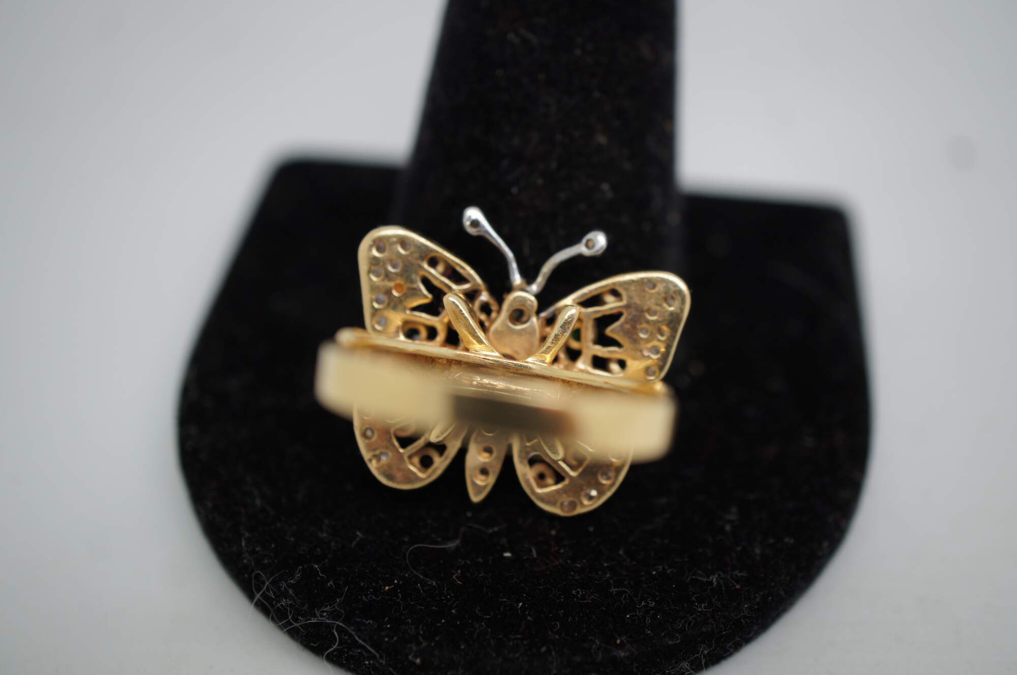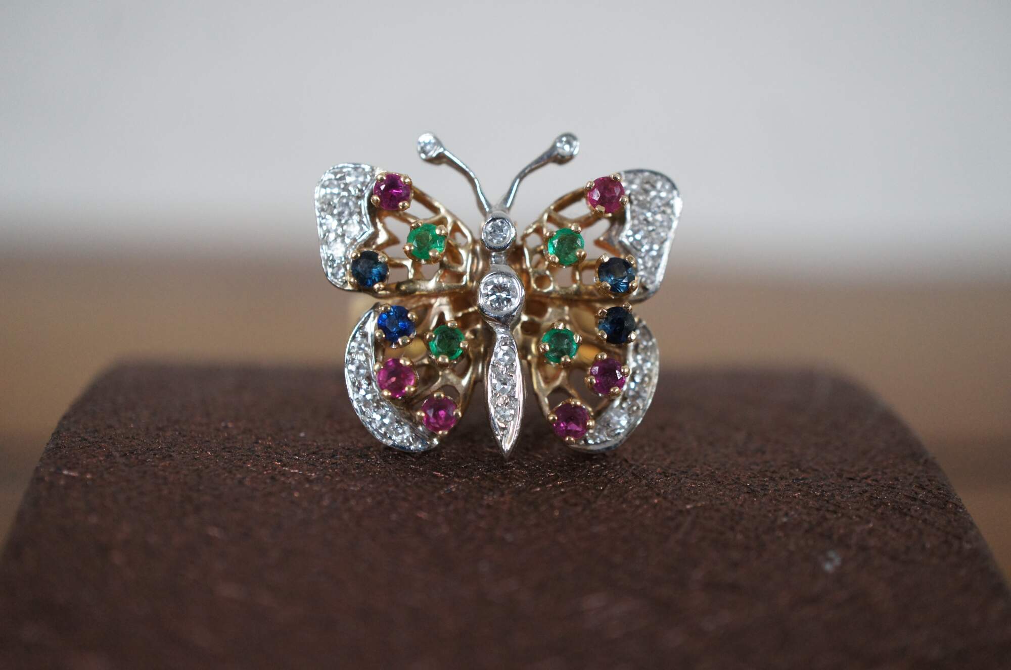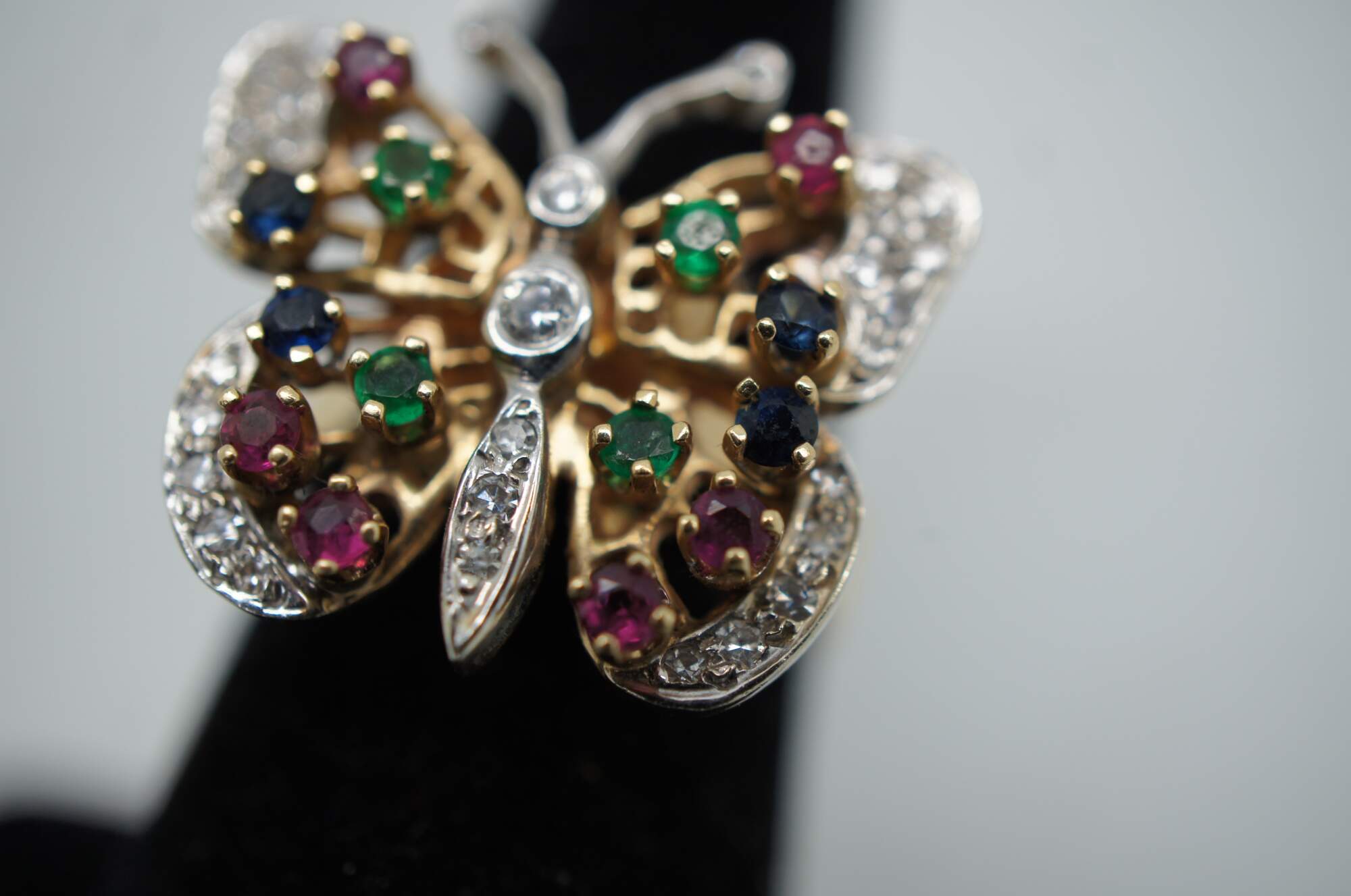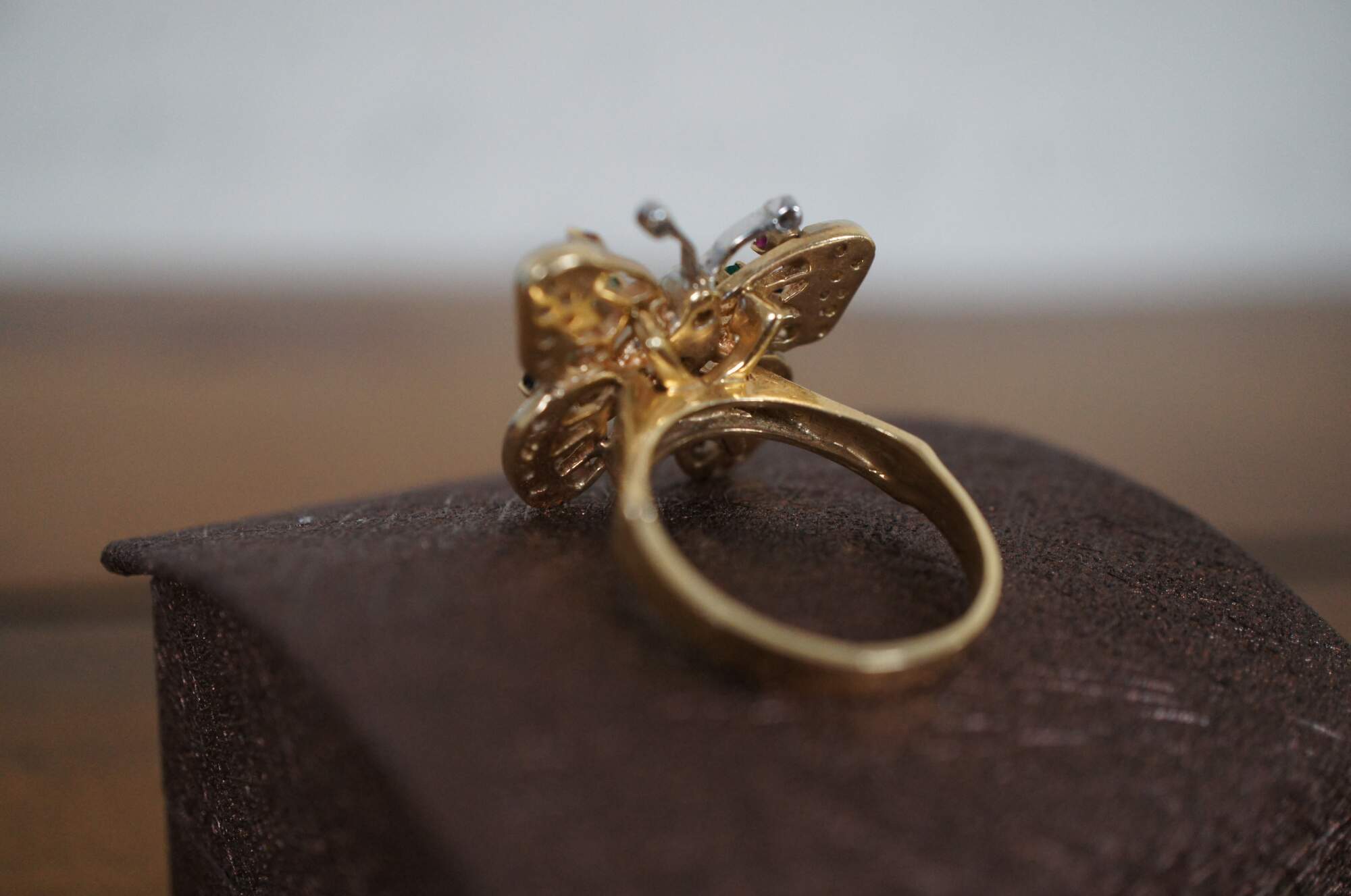 Vintage 1970s/1980s 14k yellow and white gold ring in the shape of a butterfly decorated with diamonds, emeralds, rubies and sapphires.