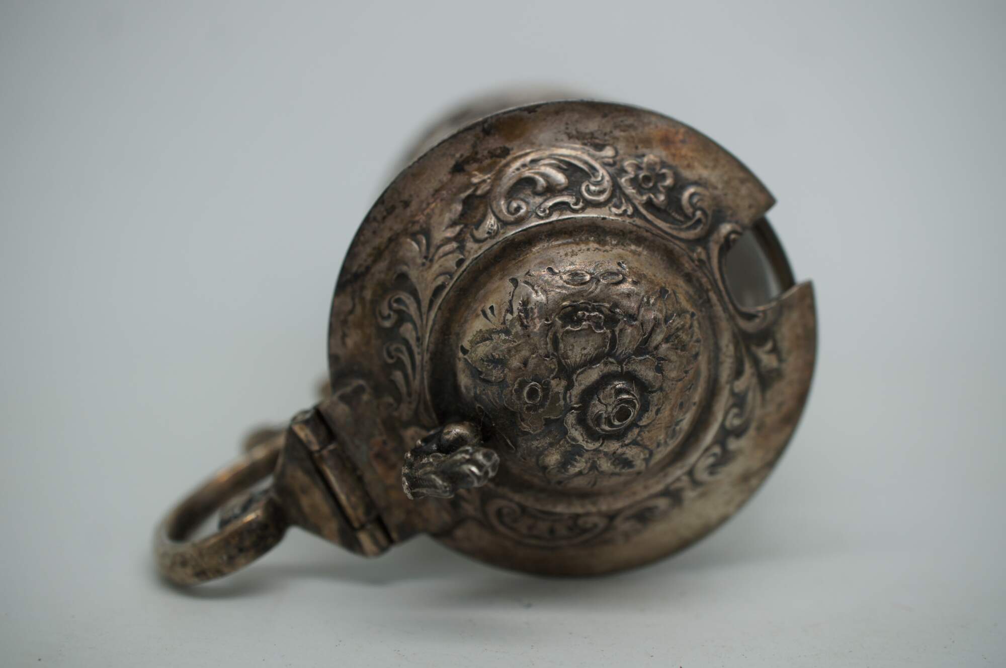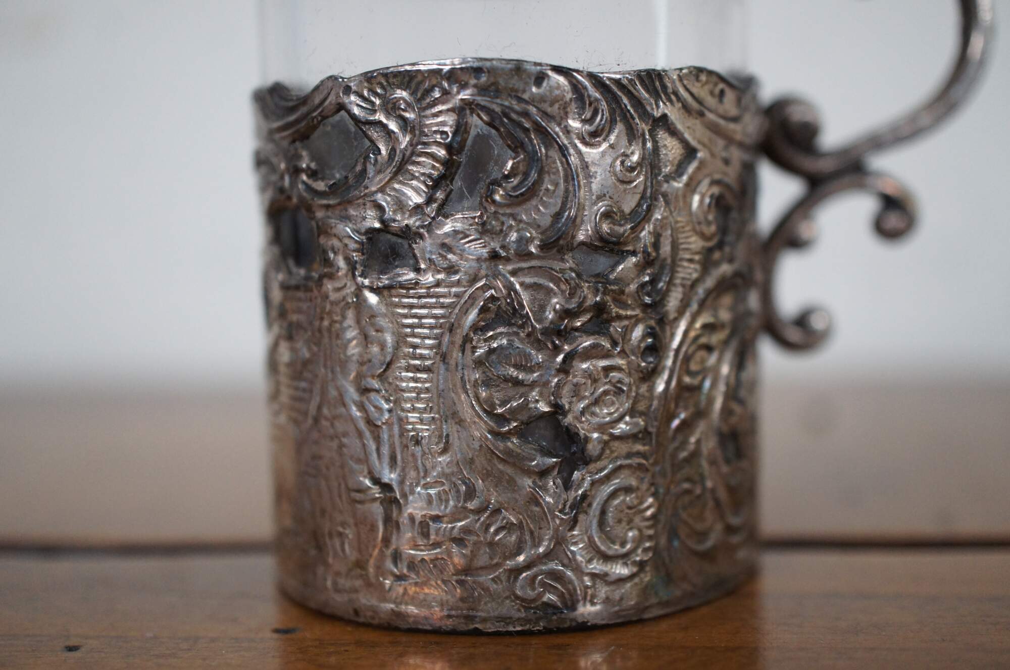 Antique late 19th century mustard pot featuring a clear glass insert with a scrolled handle and chased silver body and lid, filled with flowers and scenes with figures. 3596.