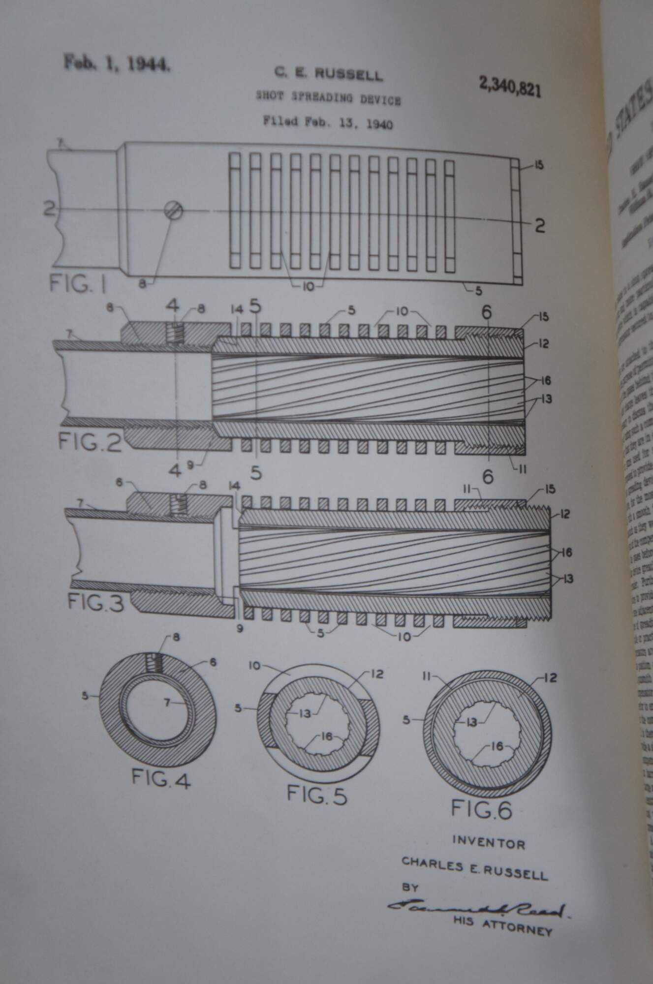 Antique 1944 patent for Shot Spreading Devices for shotguns, designed by Charles E. Russell, assignor to William Earnshaw and his heirs. “William Earnshaw, D.D. (April 12, 1828 – July 7, 1885) was an American minister who served in the Union Army as a chaplain and as the 8th Commander-in-Chief of the Grand Army of the Republic, 1879-1880. Earnshaw was born on April 12, 1828 in Chester, Pennsylvania. Soon after the outbreak of the Civil War, he enlisted April 16, 1861 as a private in the 49th Pennsylvania Infantry and was mustered in as the regiment's chaplain with the rank of captain. Earnshaw resigned his commission on October 12, 1862 when the regiment was consolidated with another regiment. He was appointed a hospital chaplain in the U.S. Volunteers April 22, 1863 and remained in the service until August 27, 1867. With the necessity of creating national cemeteries, Ernshaw was superintendent of the construction of Stones River National Cemetery and Nashville National Cemetery. He was elected chaplain of the National Military Home in Dayton, Ohio on September 5, 1867 and held the post until illness forced him to retire. Earnshaw was Commander of the Ohio Department, Grand Army of the Republic in 1876, Junior Vice-Commander in 1877, and presided at the national encampment of the G.A.R. in Albany, New York in 1879, when he was elected to serve as the national organization's 8th Commander-in-Chief. He died July 7, 1885 in Dayton, Ohio and is buried there in Woodland Cemetery and Arboretum.”
