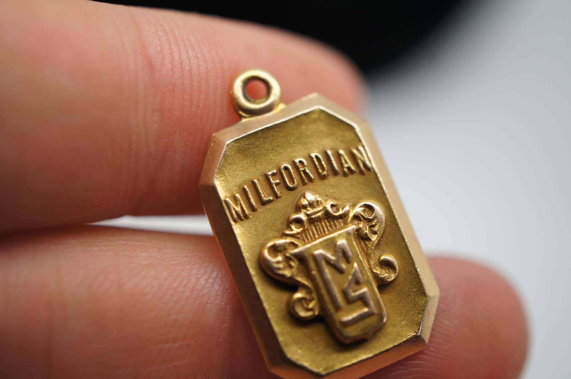 Antique Panikoff 10k yellow gold charm with the word “Milfordian” and the coat of arms of the Milford School. Engraved on the back “J.F. Gagel 1930.”