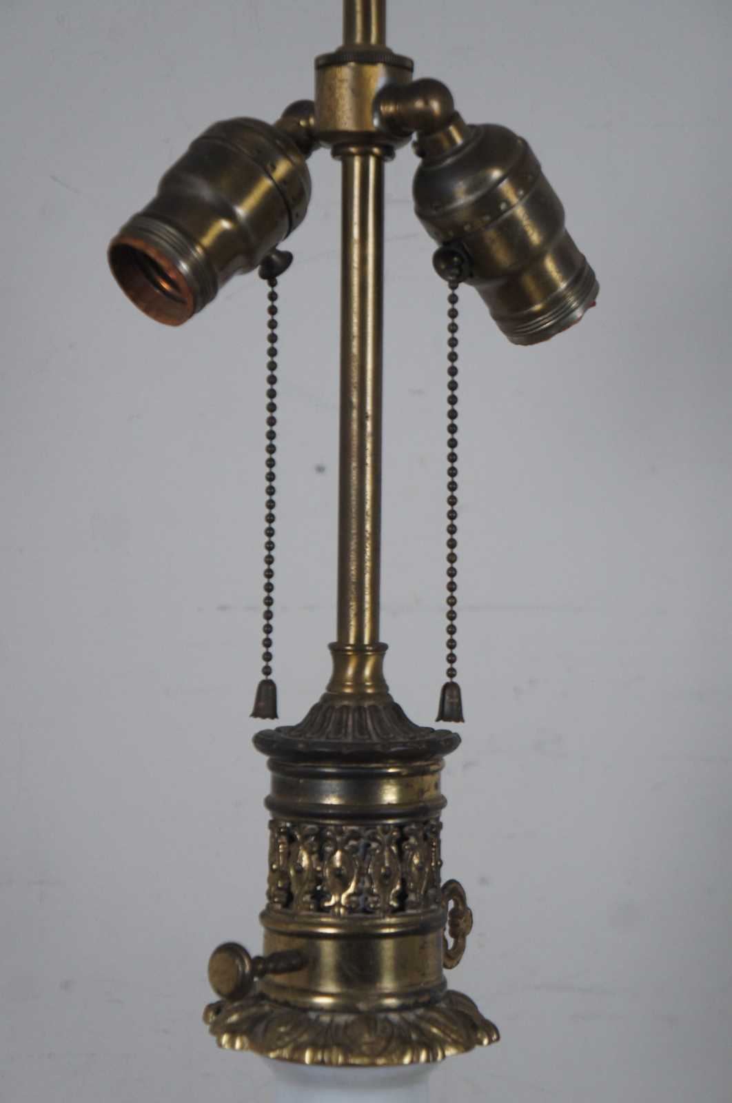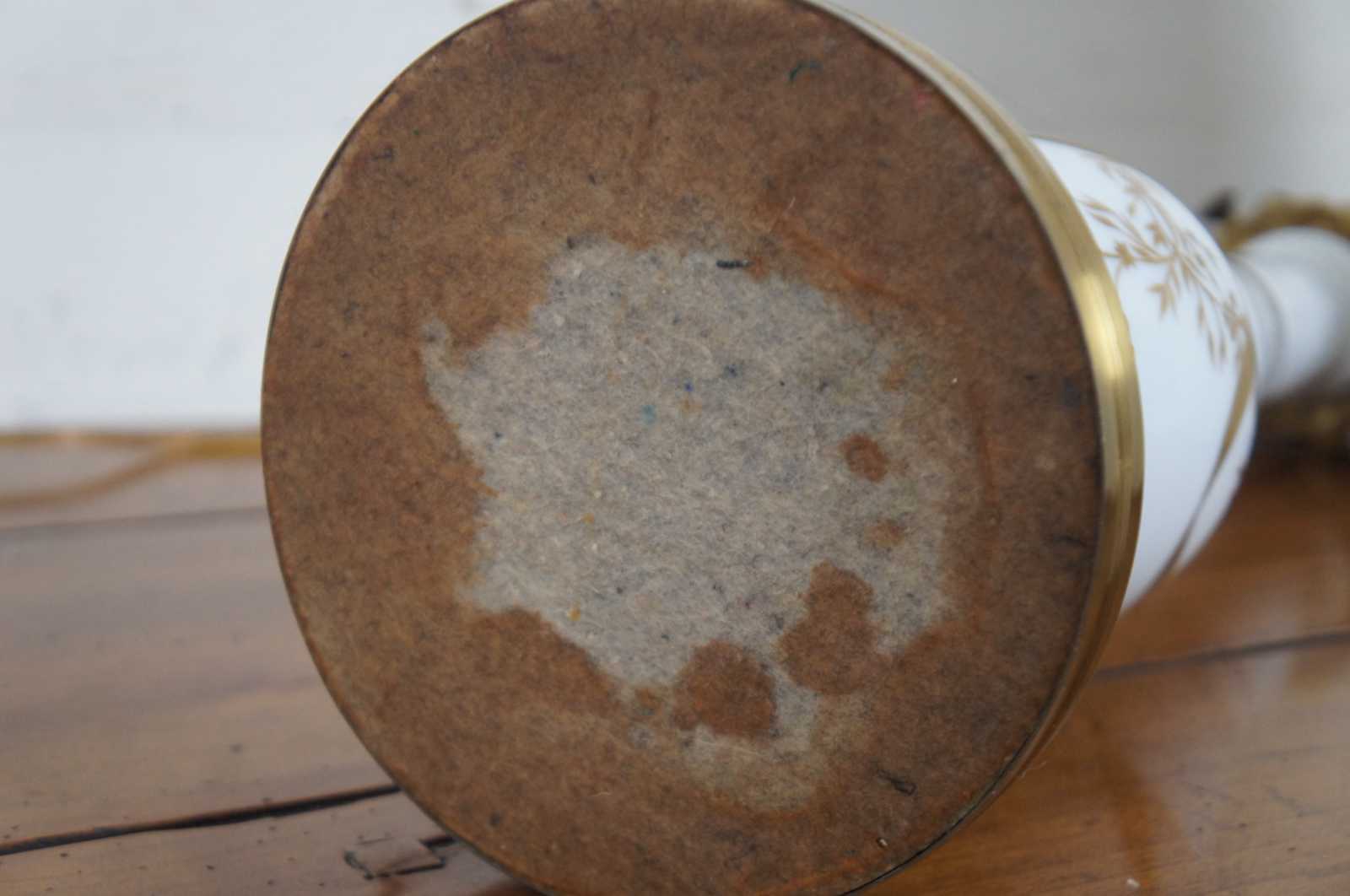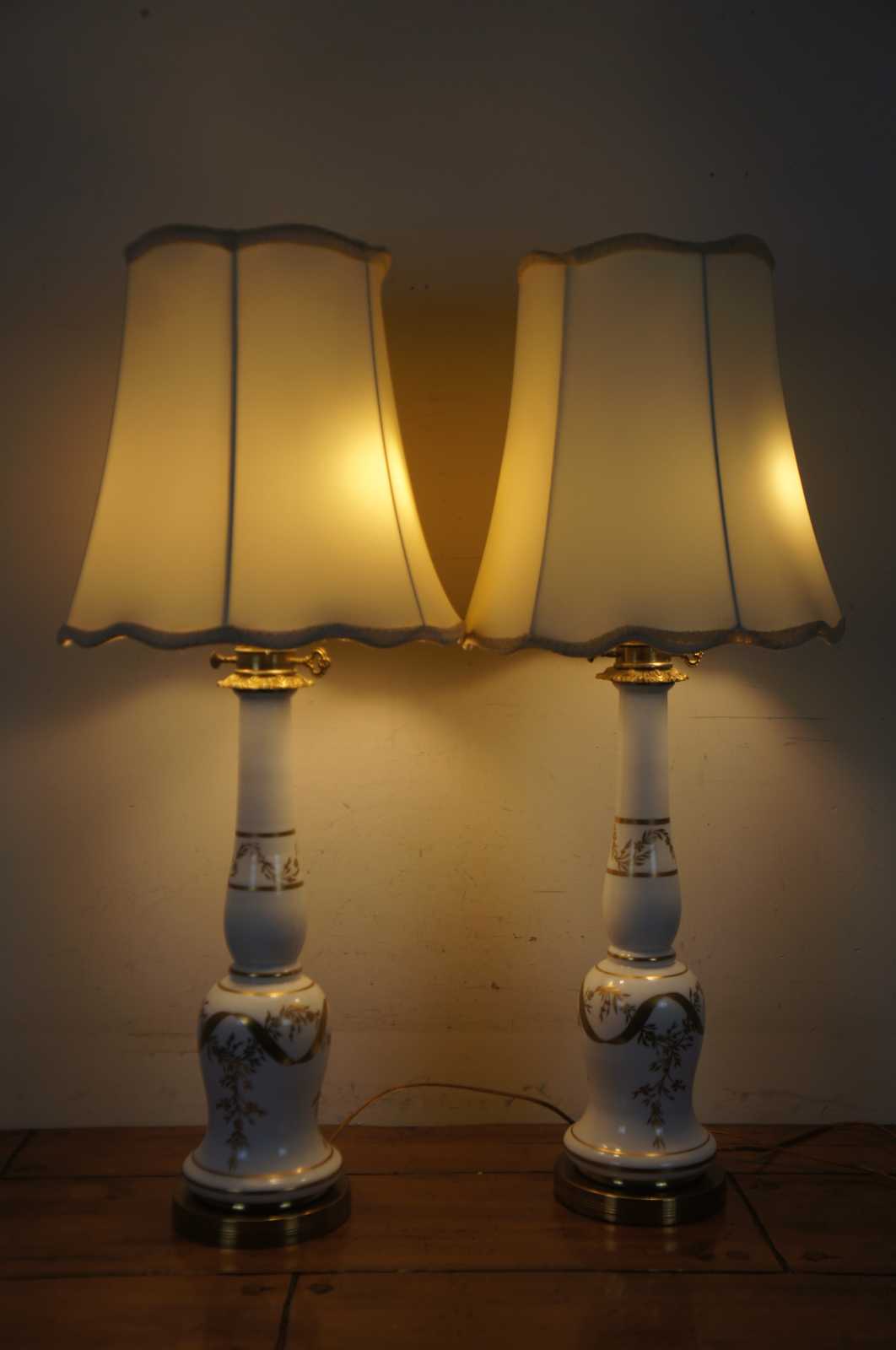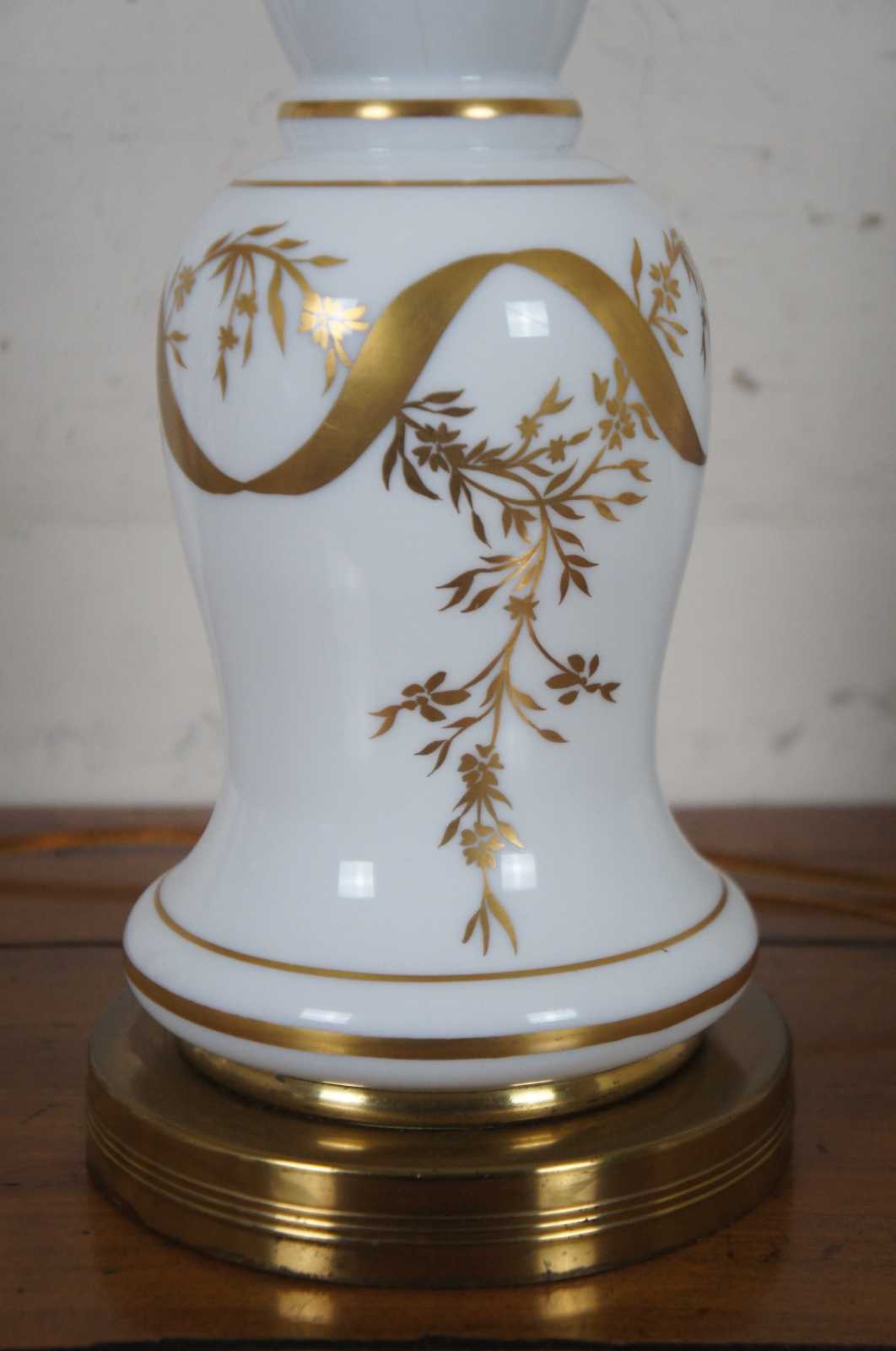 Pair of mid century two light white milk glass table lamps with French styling, painted gold floral, ribbon, wreath and swag designs, brass base and oil lamp style top with brass key.