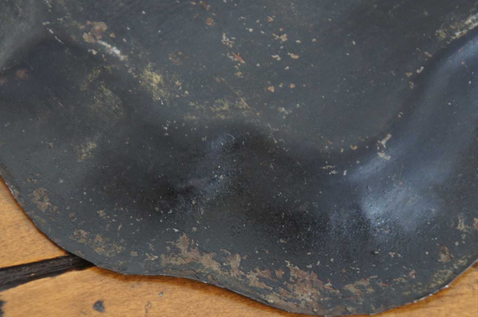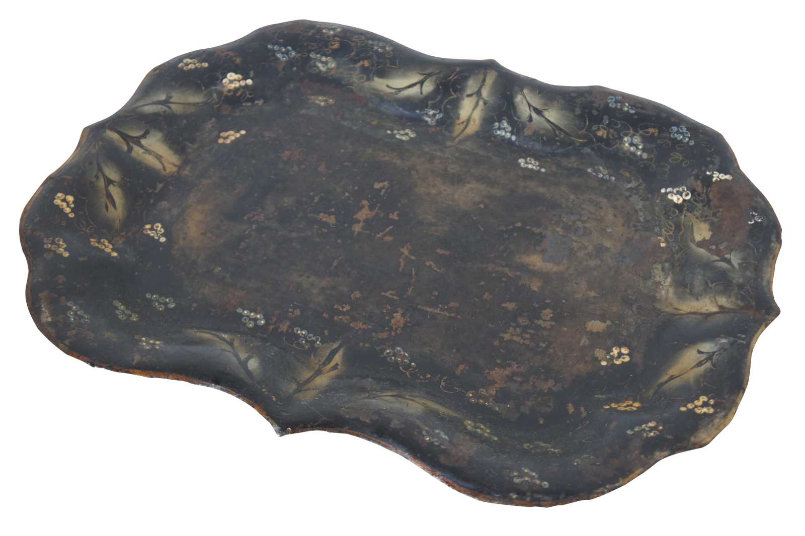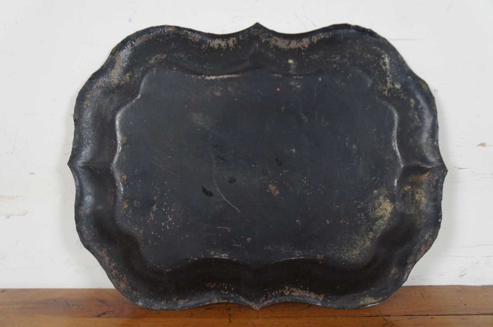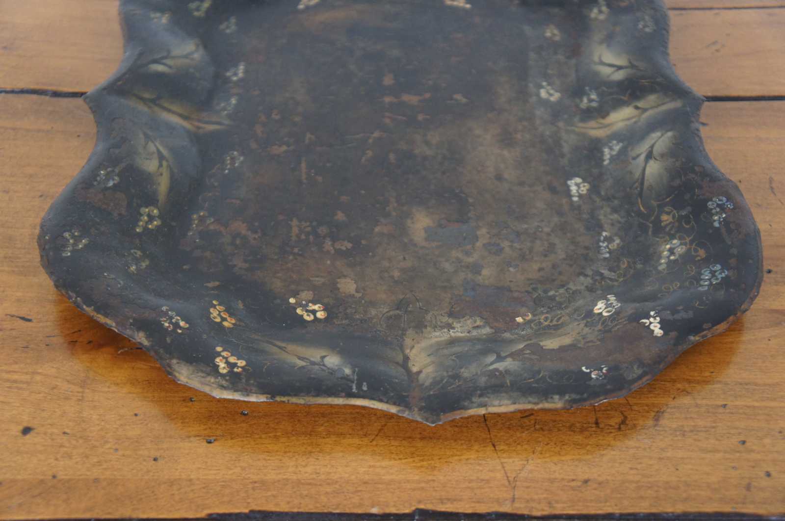 Antique scalloped metal toleware tray or platter featuring unique painted design of vines / grapes / flowers.