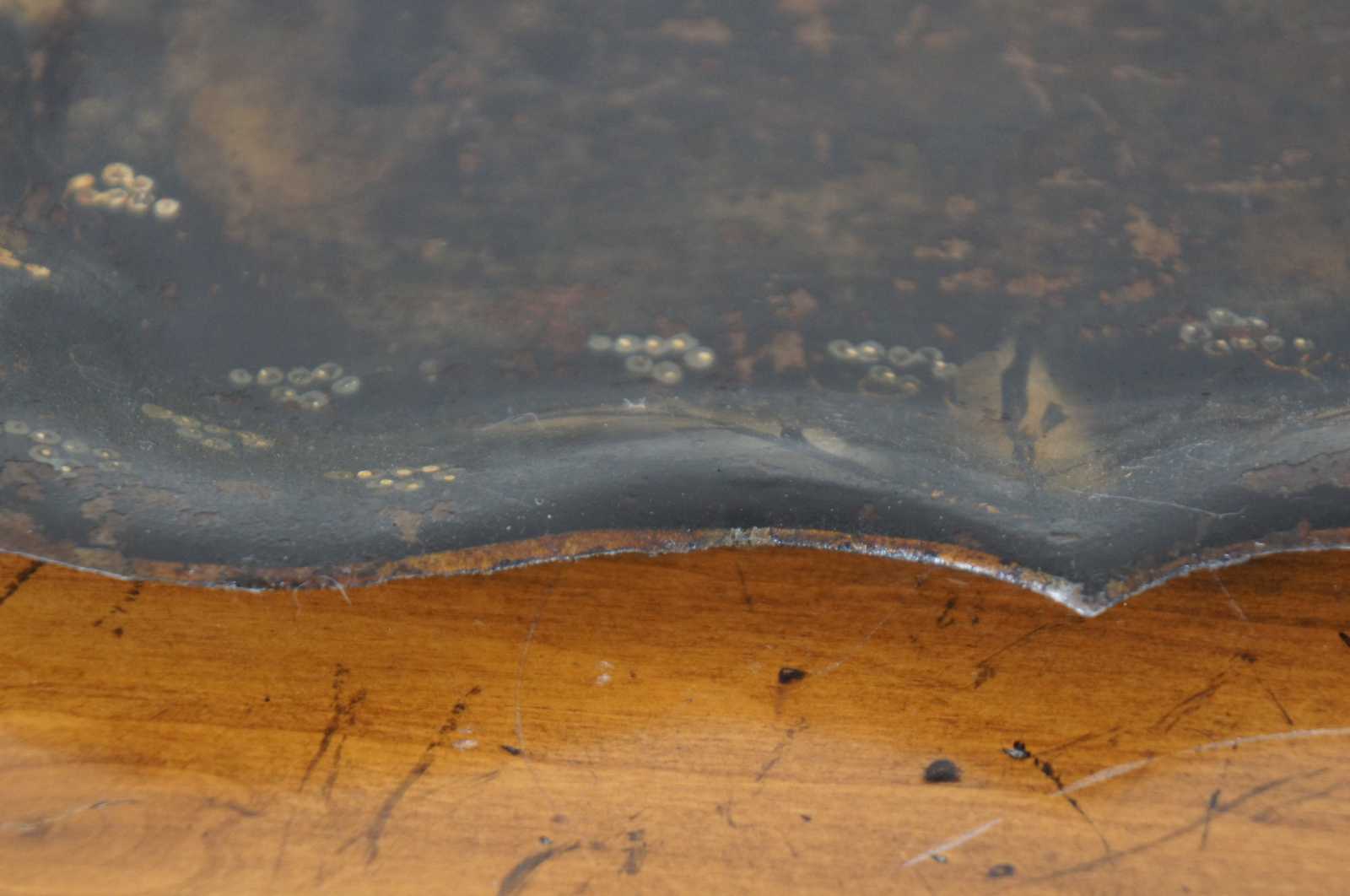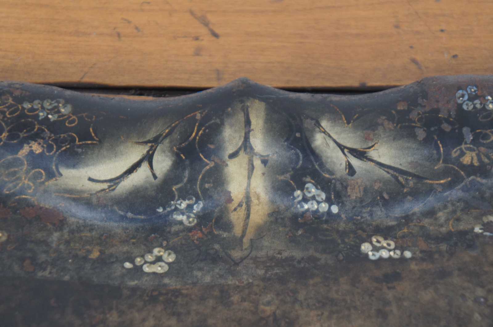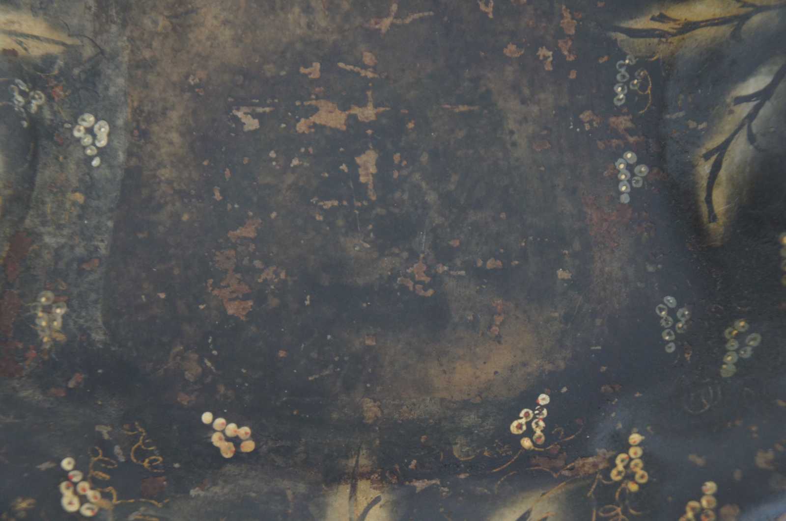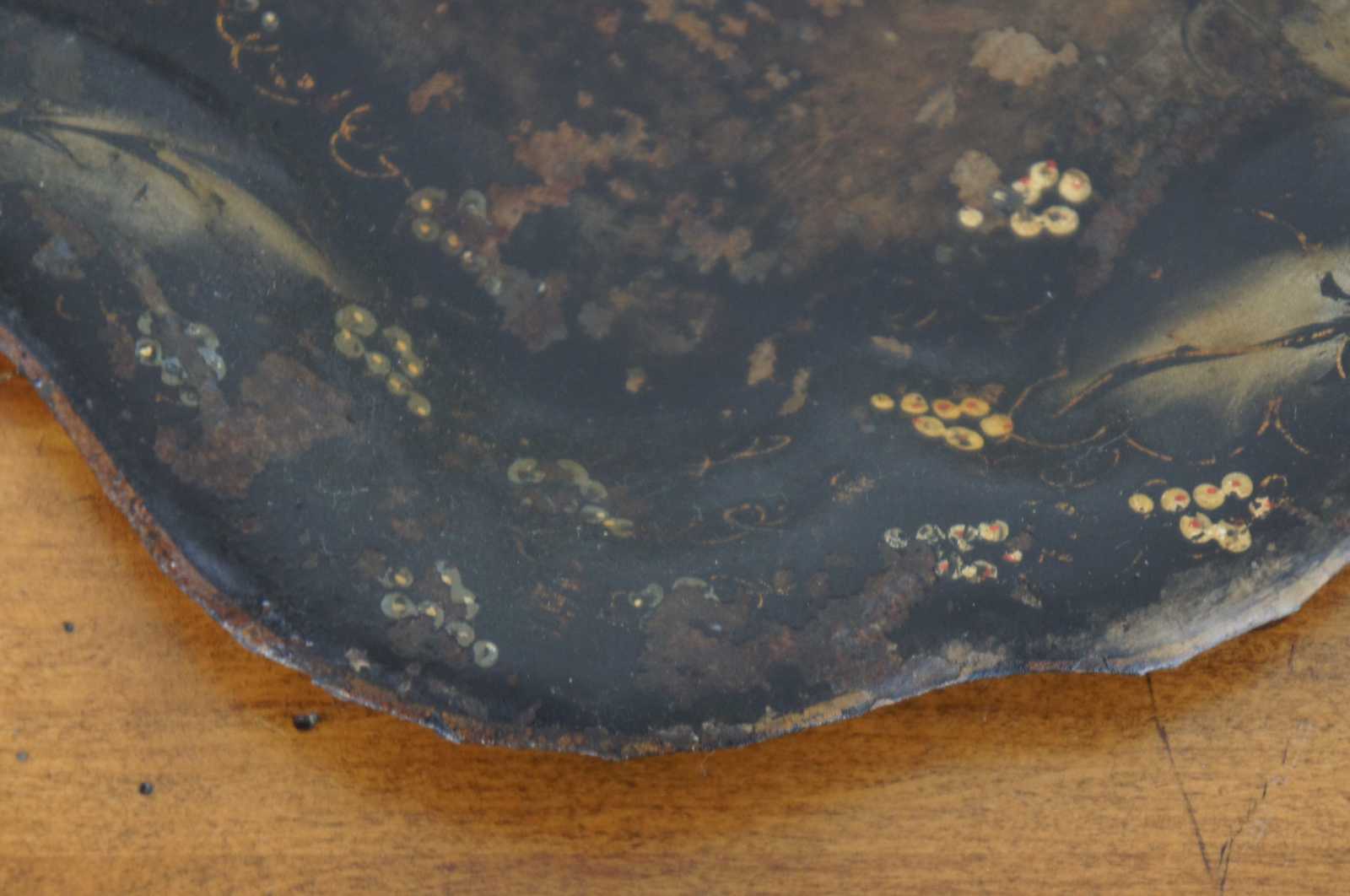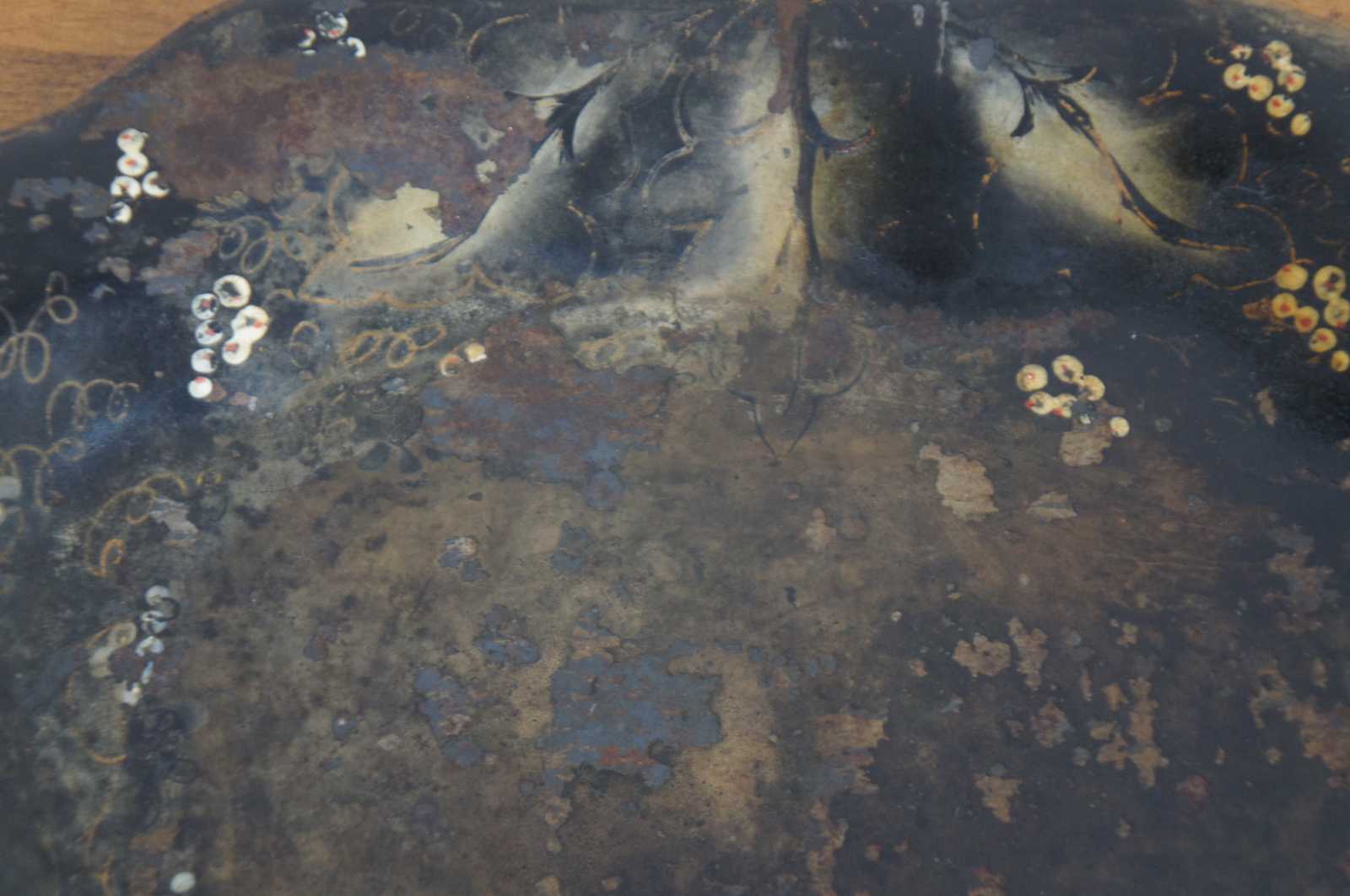 Antique scalloped metal toleware tray or platter featuring unique painted design of vines / grapes / flowers.
