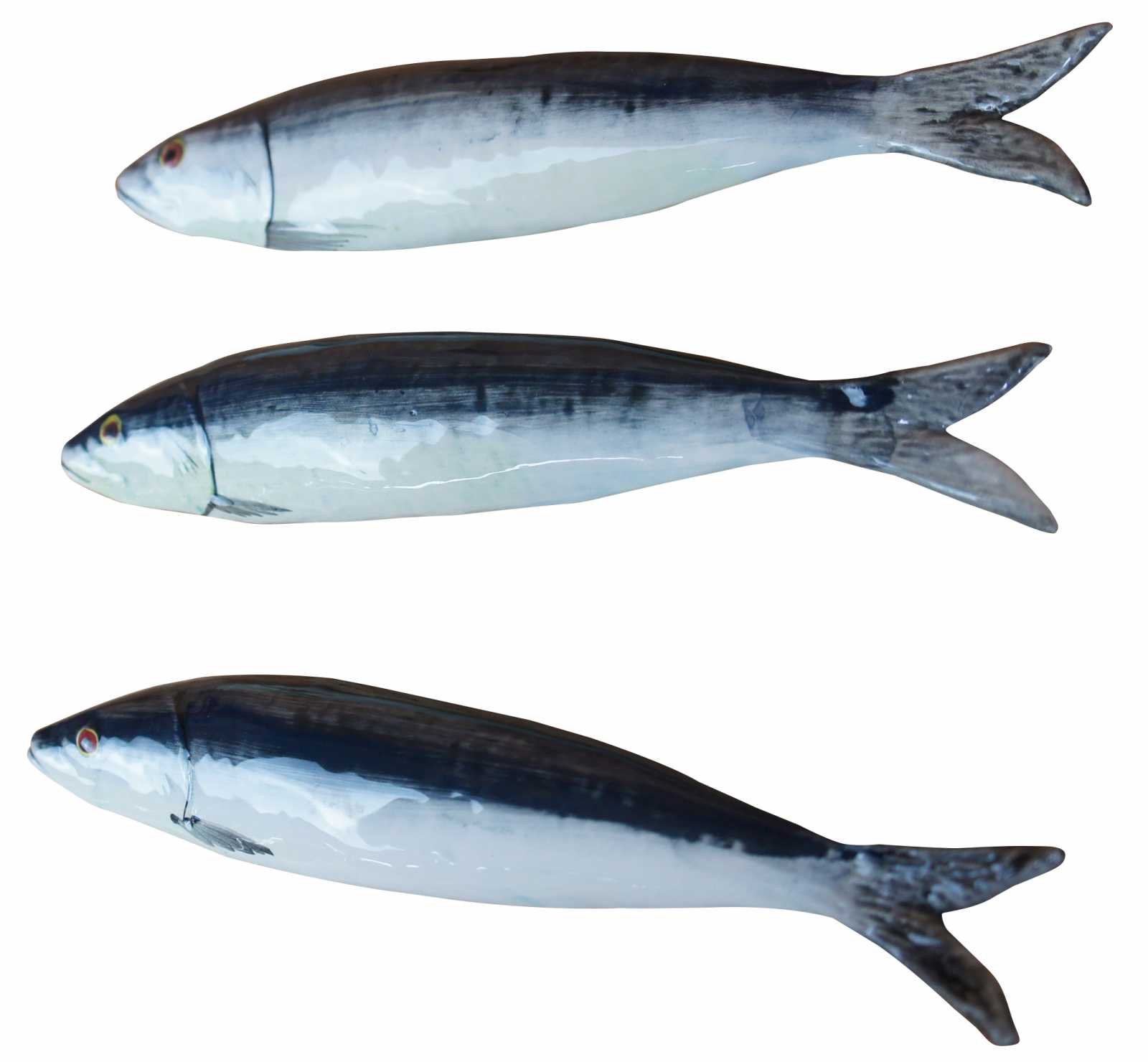 Three realistic porcelain sardines or fish marked made in Portugal.