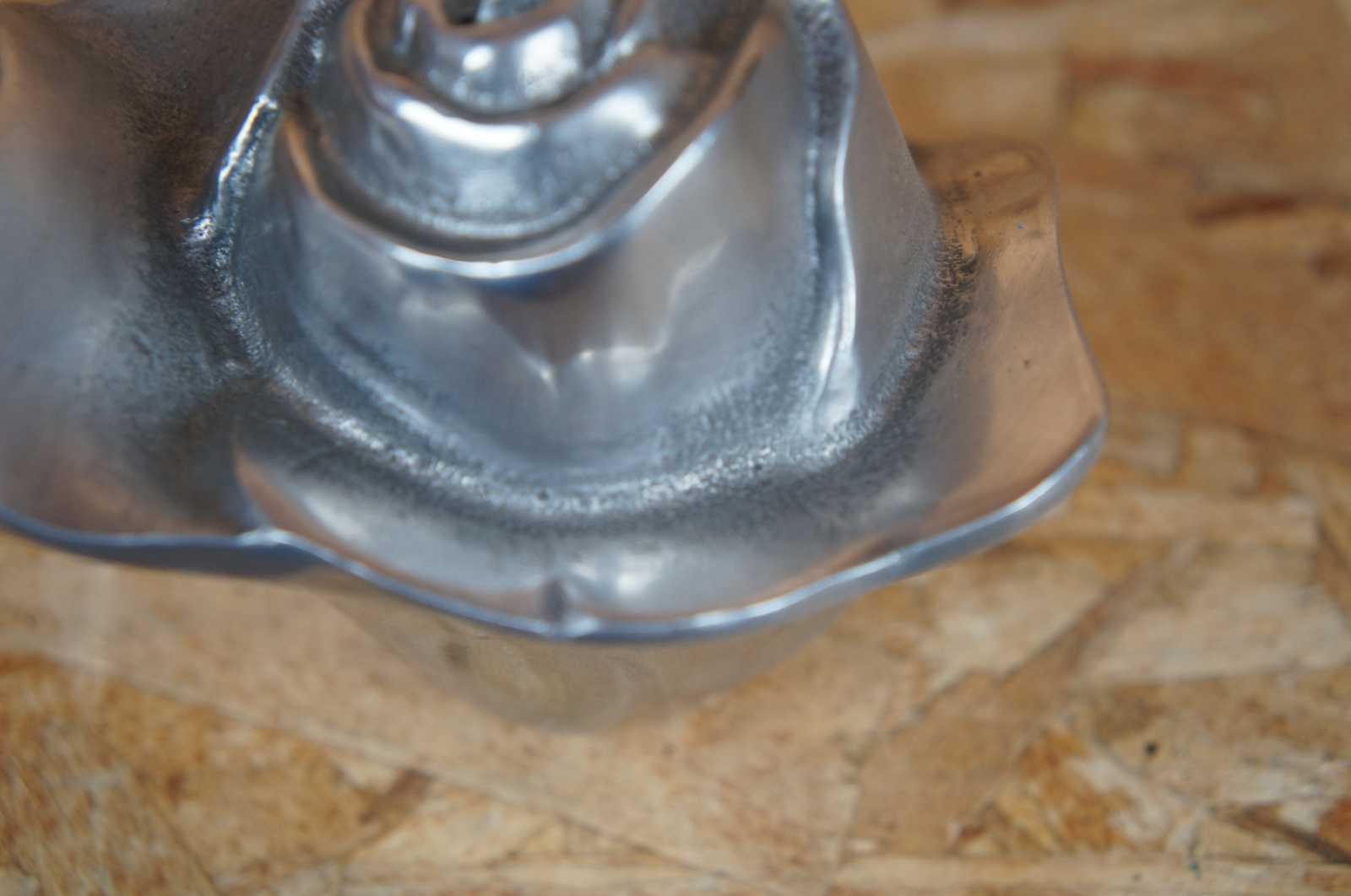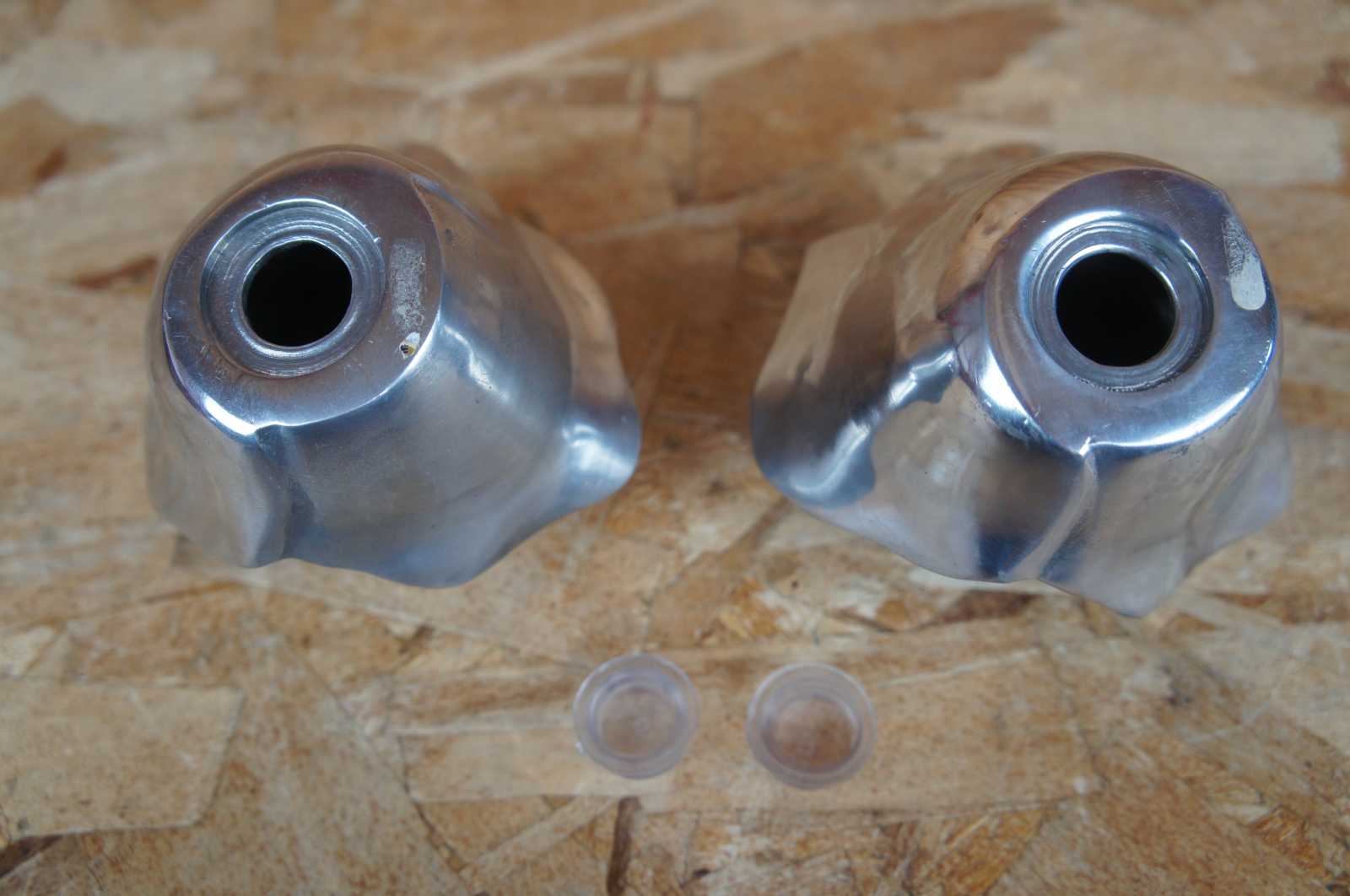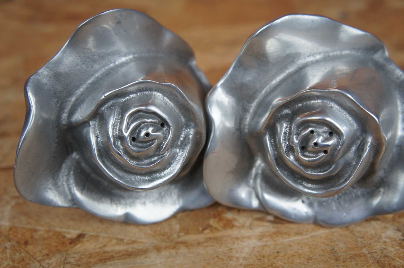 Pair of pewter or aluminum salt and pepper shakers in the form of rose buds or flowers, unmarked with rubber stoppers.
