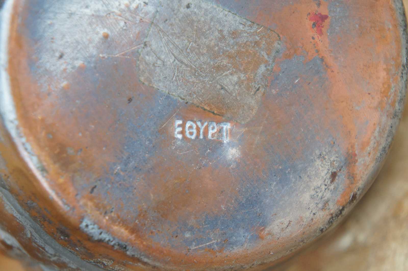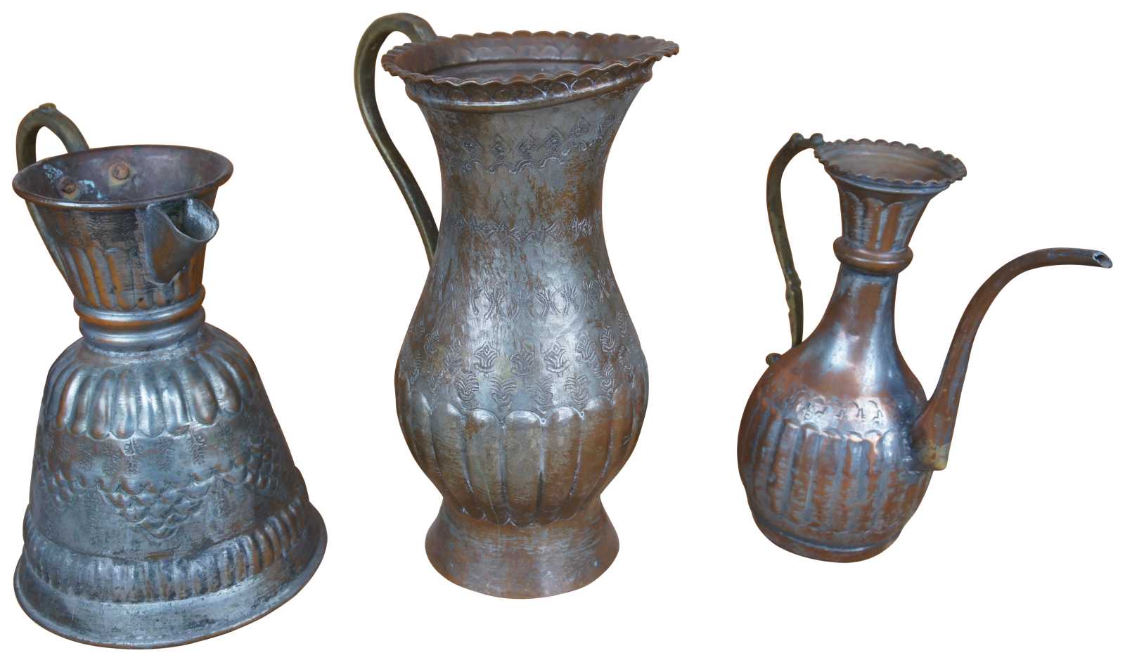 Three of assorted hammered copper pitchers featuring various designs and styles with fleur de lis and ribbed accents, and scrolled handles. One features a bonsai gooseneck spout. Stamped with ‘Egypt’ on the bottom.