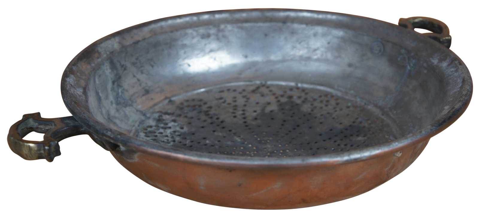 Antique tin lined copper colander with brass handles and star or flower shaped strainers.