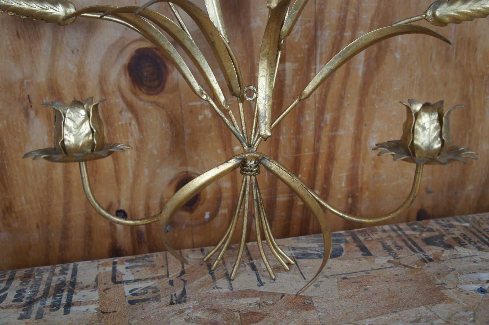 Pair of mid century Hollywood Regency candelabras or candle holders in the form of sprays of wheat, gold gilt painted and tagged ‘made in Italy’.