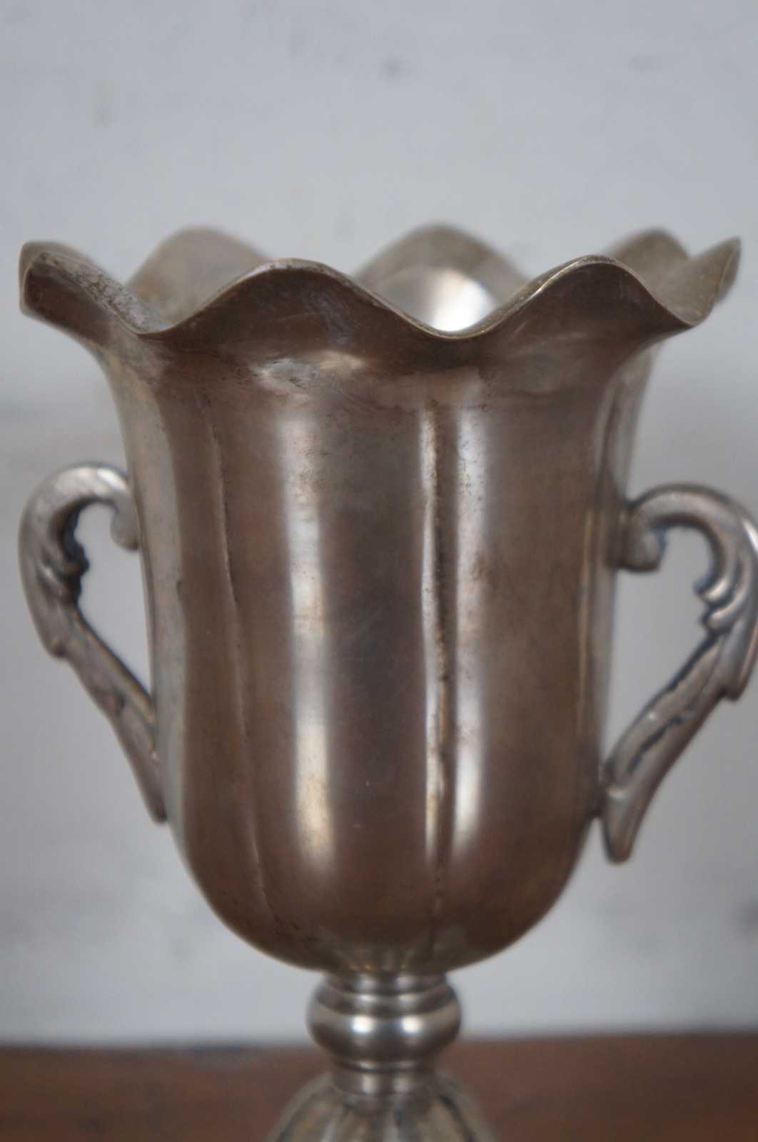 Vintage Scalloped Metal Handled Trophy Urn Flower Holder Pen Bud Vase 6