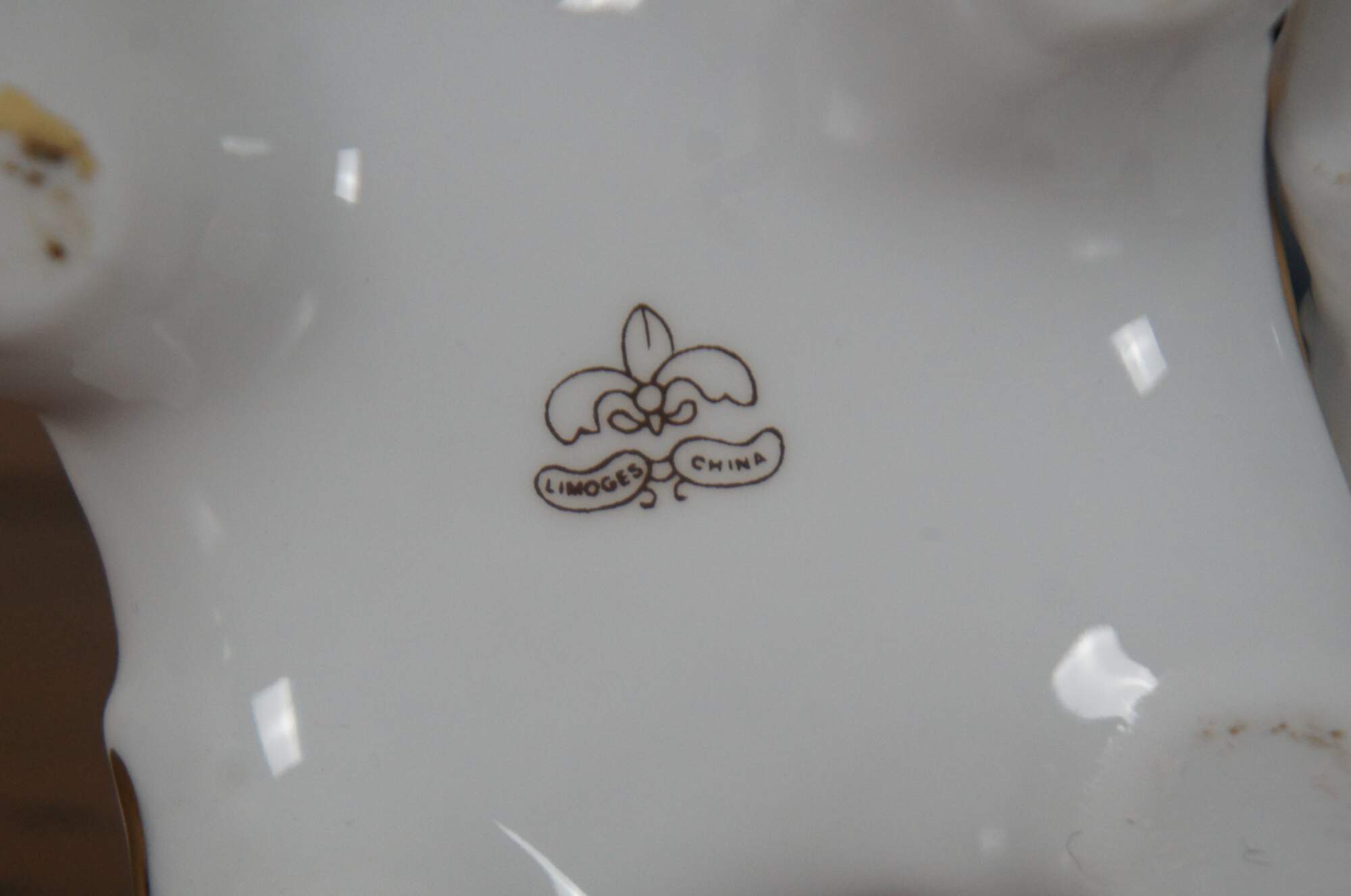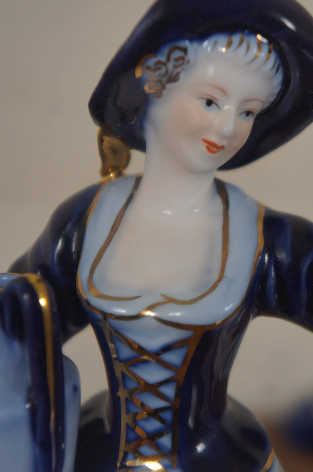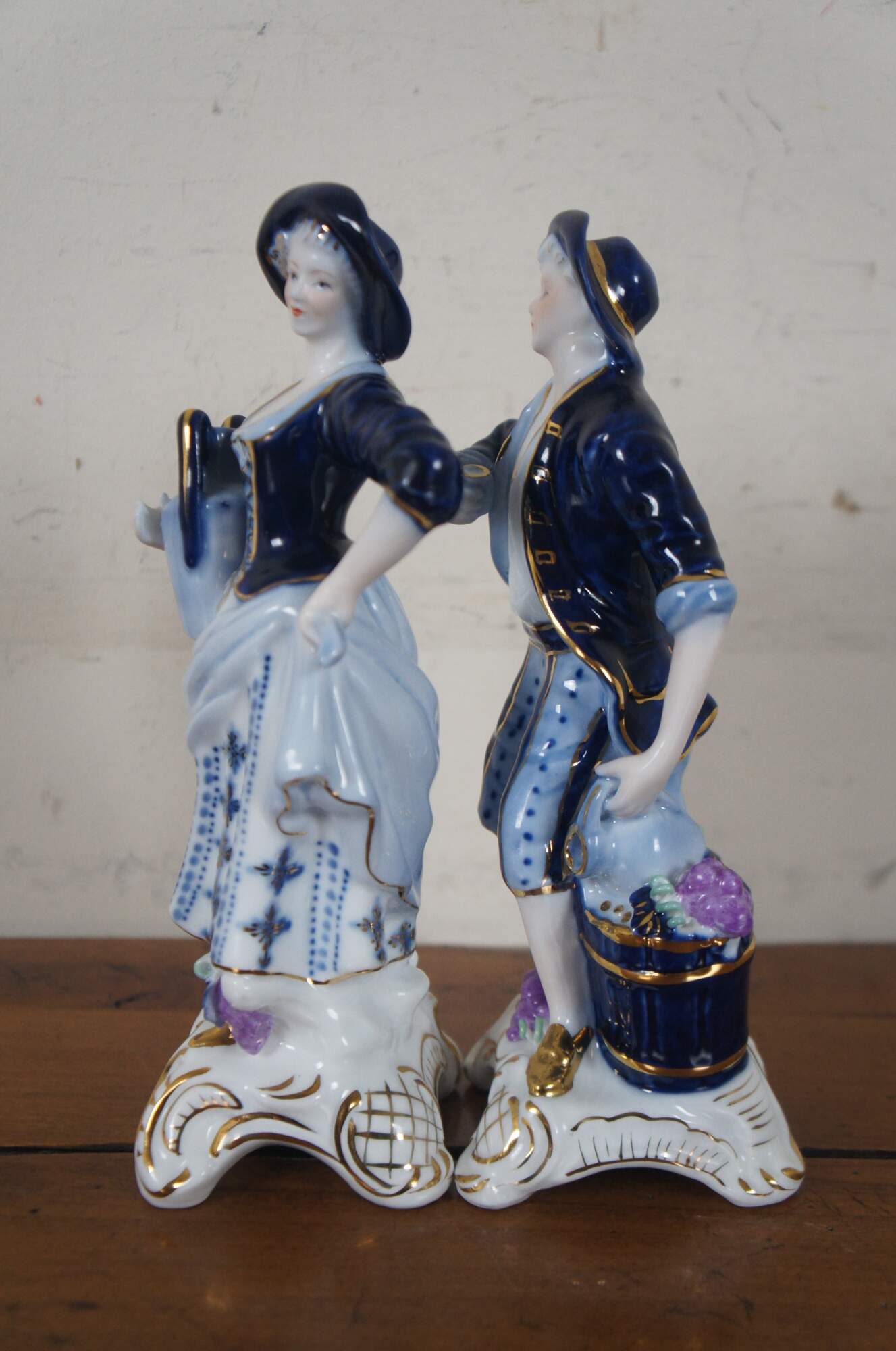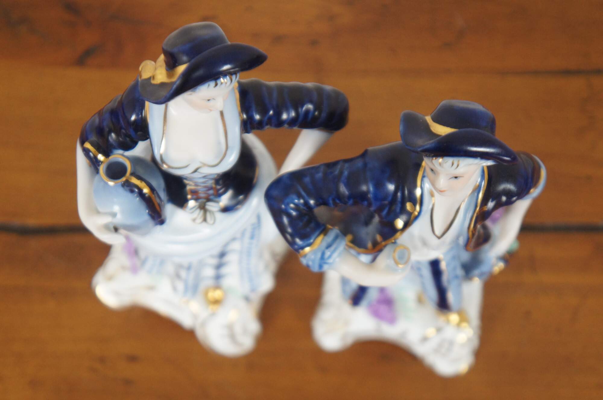 Pair of vintage Colonial or Victorian style male and female figures dressed in cobalt blue with gilded accents, made by Limoges China.