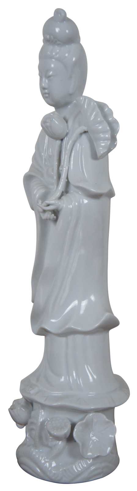 Vintage white porcelain figurine of the Goddess of Compassion Kwan Yin, made by MOC Japan. “The name Guan Yin also spelt Guan Yim, Kuan Yim, Kwan Im, or Kuan Yin, is a short form for Kuan-shi Yin, meaning ""Observing the Sounds (or Cries) of the (human) World"".