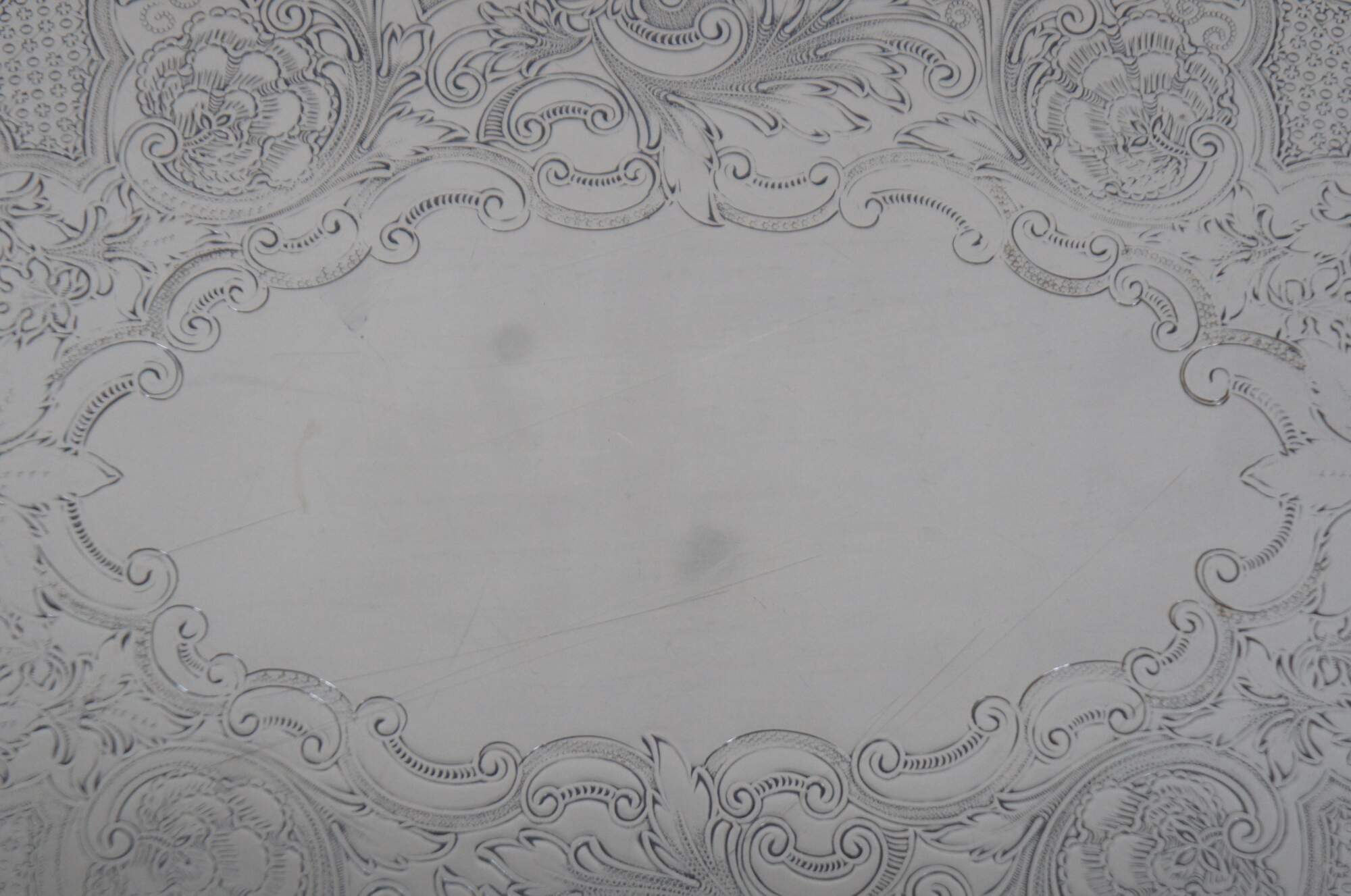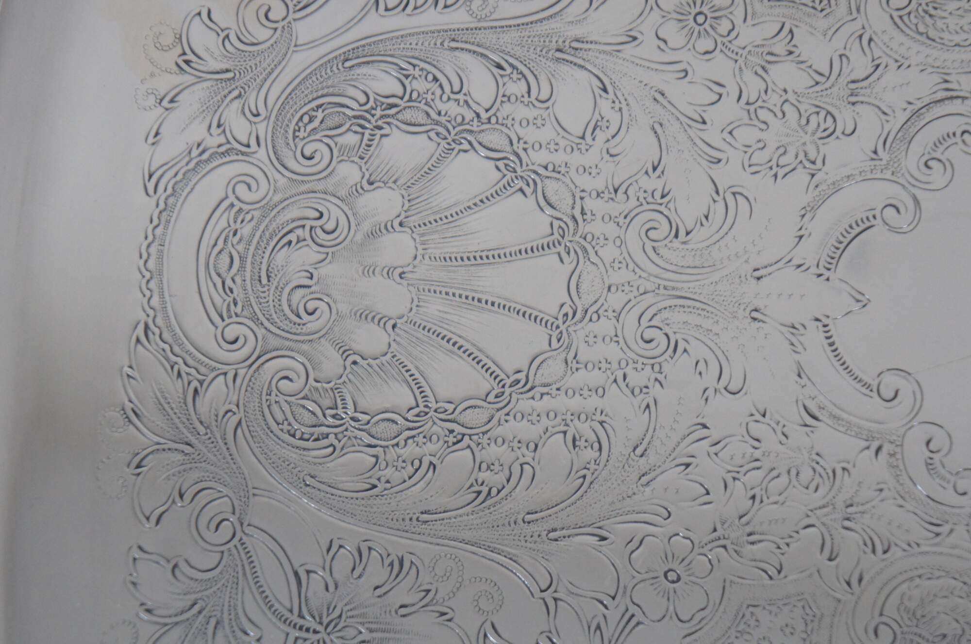 Vintage rectangular silver plate serving tray by International Silver Company, Georgian Court pattern, number 708, featuring etched floral and scallop shell designs with simple beveled border and scalloped handles.