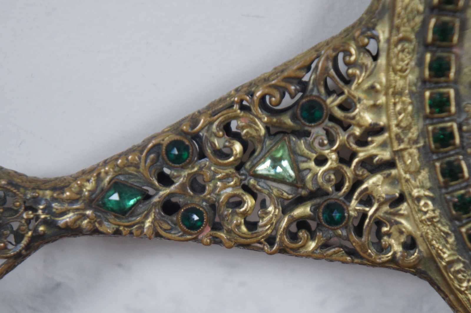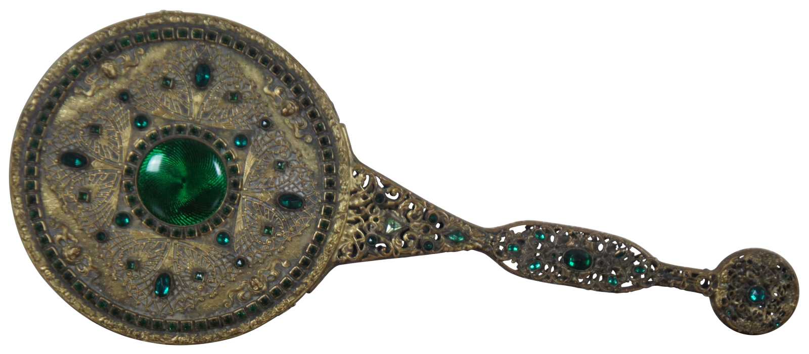 Antique early 20th century Art Deco gilt ormolu Empire Style hair brush and hand mirror set decorated with green glass jewels and guilloche enamel medallions. Attributed to E & JB.