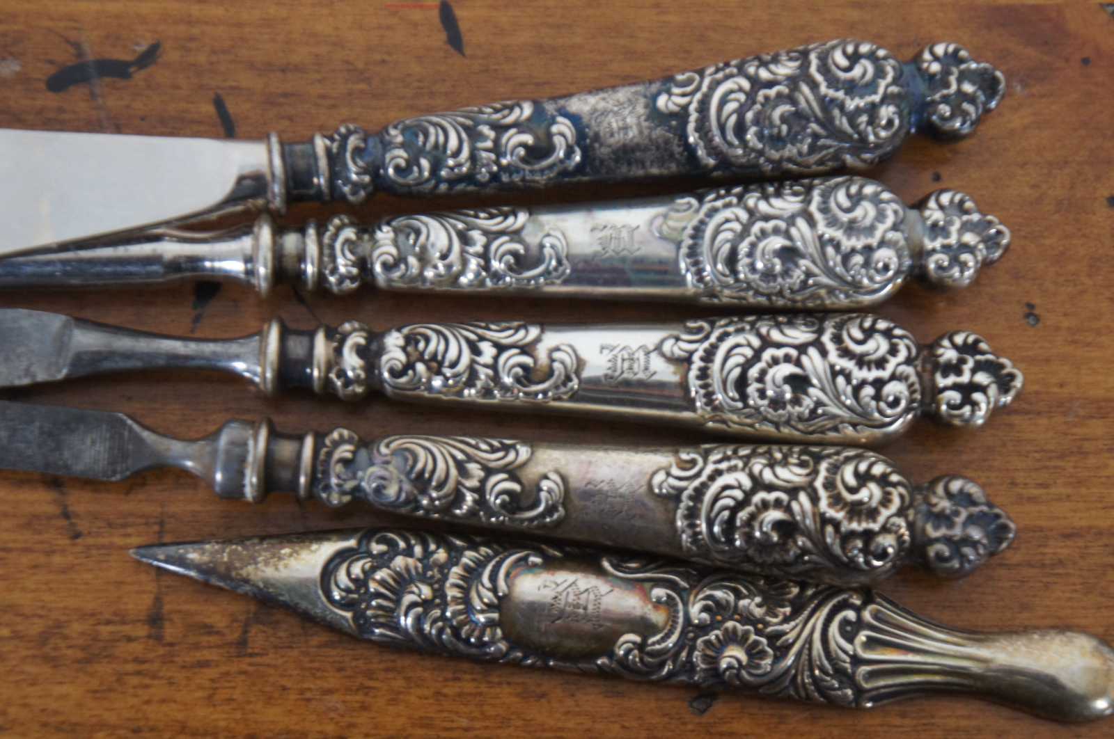 Early 20th century five piece vanity grooming set by Theodore W. Foster and Bros with art nouveau sterling silver handles, engraved with an M. Set includes a shoe horn, nail file, button hook, corn knife, and cuticle pusher. “Providence, RI - Founded in 1873 as White & Foster. From 1878 to 1898 the firm was active as Foster & Bailey as partnership of Theodore W. Foster and Samuel H. Bailey. From 1898 the company was incorporated under the name Theodore W. Foster & Bros. Co but continued to use the F&B mark until 1951.”