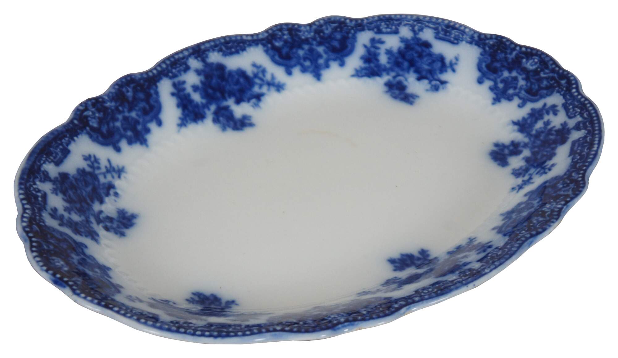 Antique W.H. Grindley & Co porcelain oval serving platter with a baded scalloped edge, decorated with floral designs in flow blue. “ Earthenware manufacturer at the Newfield Pottery and then the Woodland Pottery, Tunstall, Stoke-on-Trent, England - The company was founded at the Newfield Pottery in 1880 by William Harry Grindley (principal partner). Mr Turner and Mr Alfred Meakin were also involved. Early adverts stated that they produced Earthenware and Ironstone China - particularly for the Canadian, United States, South American and Australian markets. In March 1883 Alfred Meakin left the partnership. In 1891 the company moved to the Woodland Pottery, Woodland Street, Tunstall. In 1908 W. H. Grindley set up a sister company - The Grindley Hotel Ware Co. The founder, William Harry Grindley, died in 1924. In 1960 Alfred Clough Ltd purchased W. H. Grindley, who continued to trade under their own name as part of the 'Alfred Clough Group'. In the 1960 Pottery Gazette directory the company officers are listed as: Director & Commerical Manager - B. Powner, Export Sales Manager - A. E. Nierinck, Home Sales Manager - F. Spooner. In 1978 the name of the Clough Group was changed to Grindley of Stoke (Ceramics) Ltd. In 1982 W. H. Grindley, Cartwright & Edwards and other group assets were sold to the United Kingdom Provident Institution and the company became a member of the newly formed Federated Potteries Co. Ltd. The assets of Federated Potteries were dispersed in 1987 and in January 1988 the management of Grindley's purchased the business and recommenced trading under the W. H. Grindley & Co. Ltd. name. The business had financial difficulties and 1991 saw the company in the hands of the receivers.”