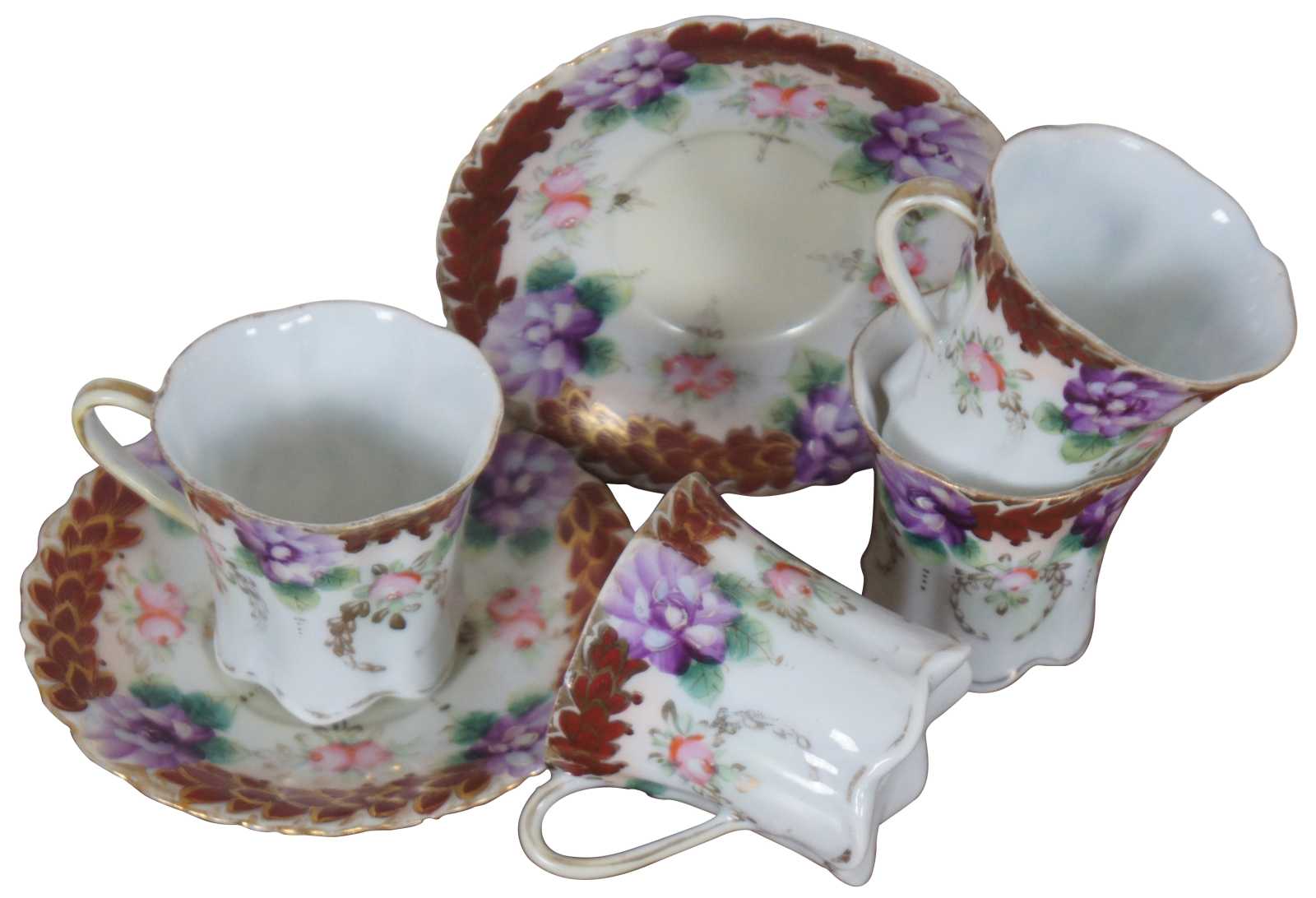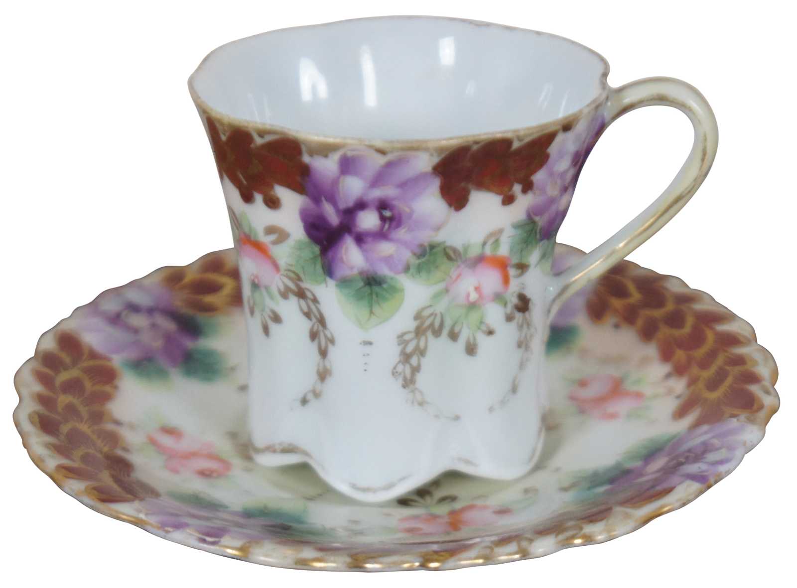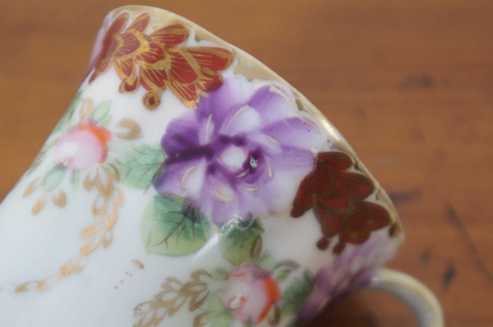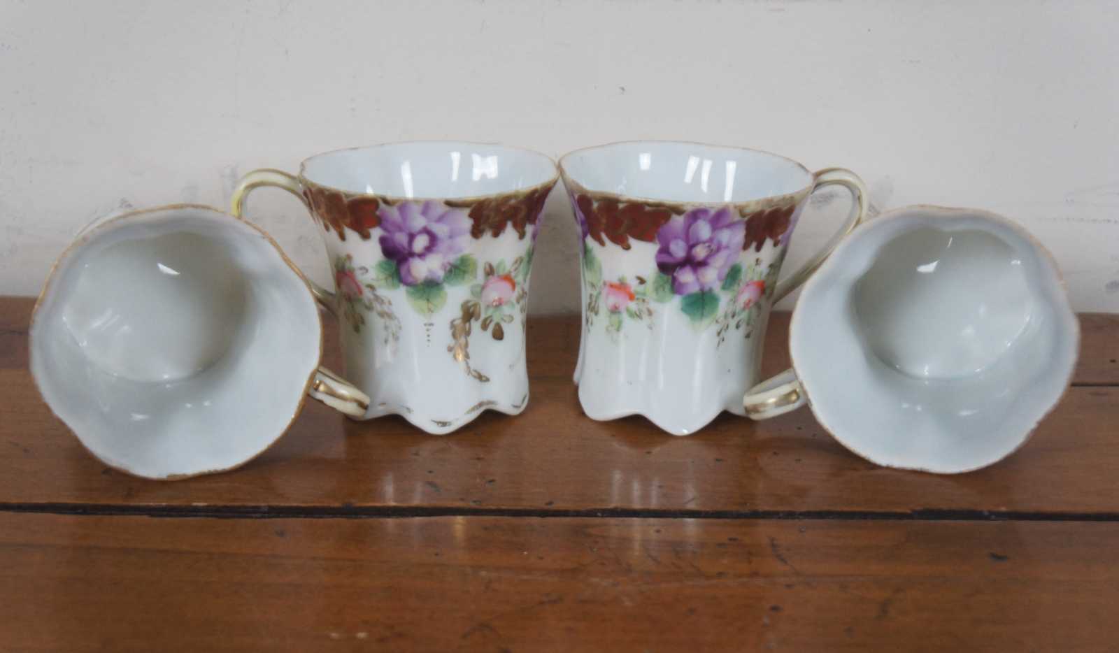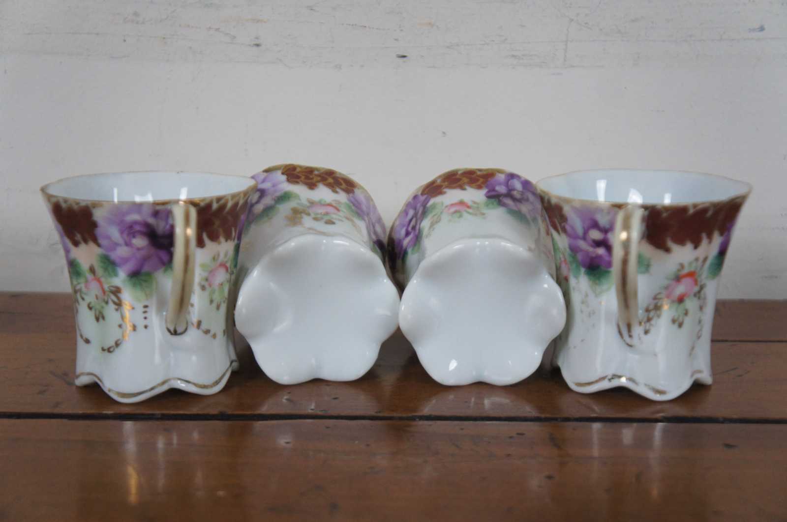 Antique floral painted porcelain demitasse cups and saucers with scalloped bases, pink and purple flowers and trim of rust colored gilded leaves; includes four cups and two saucers.