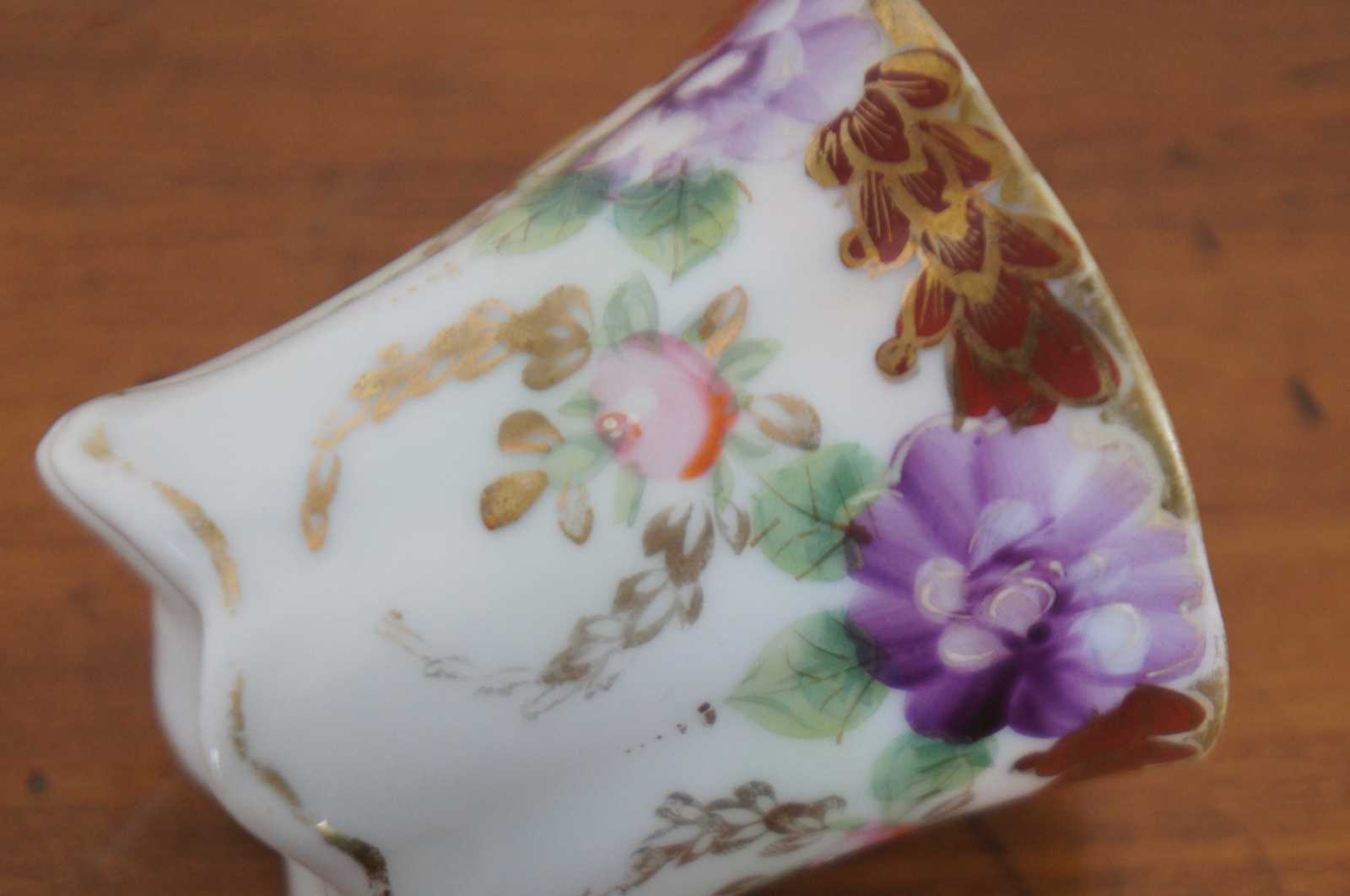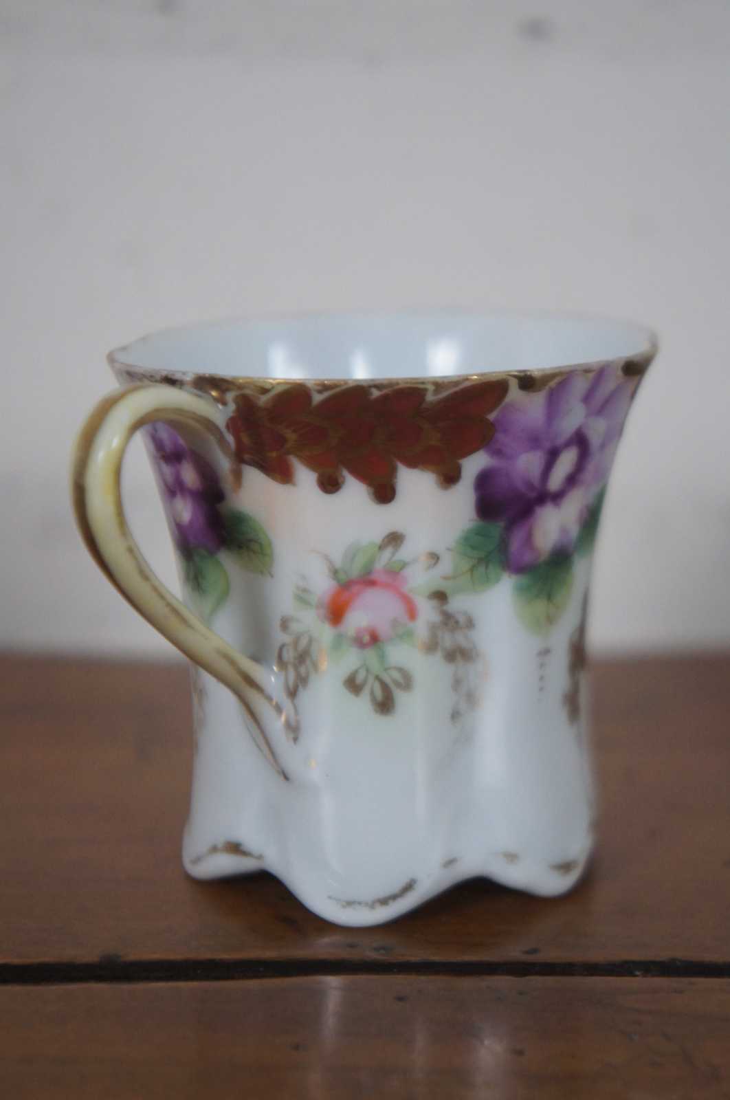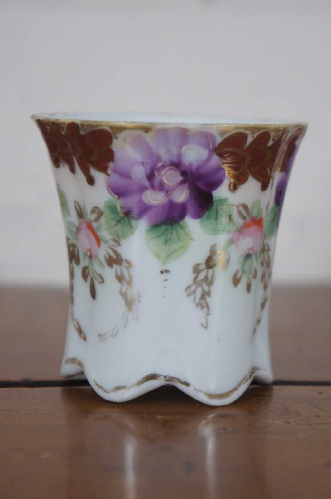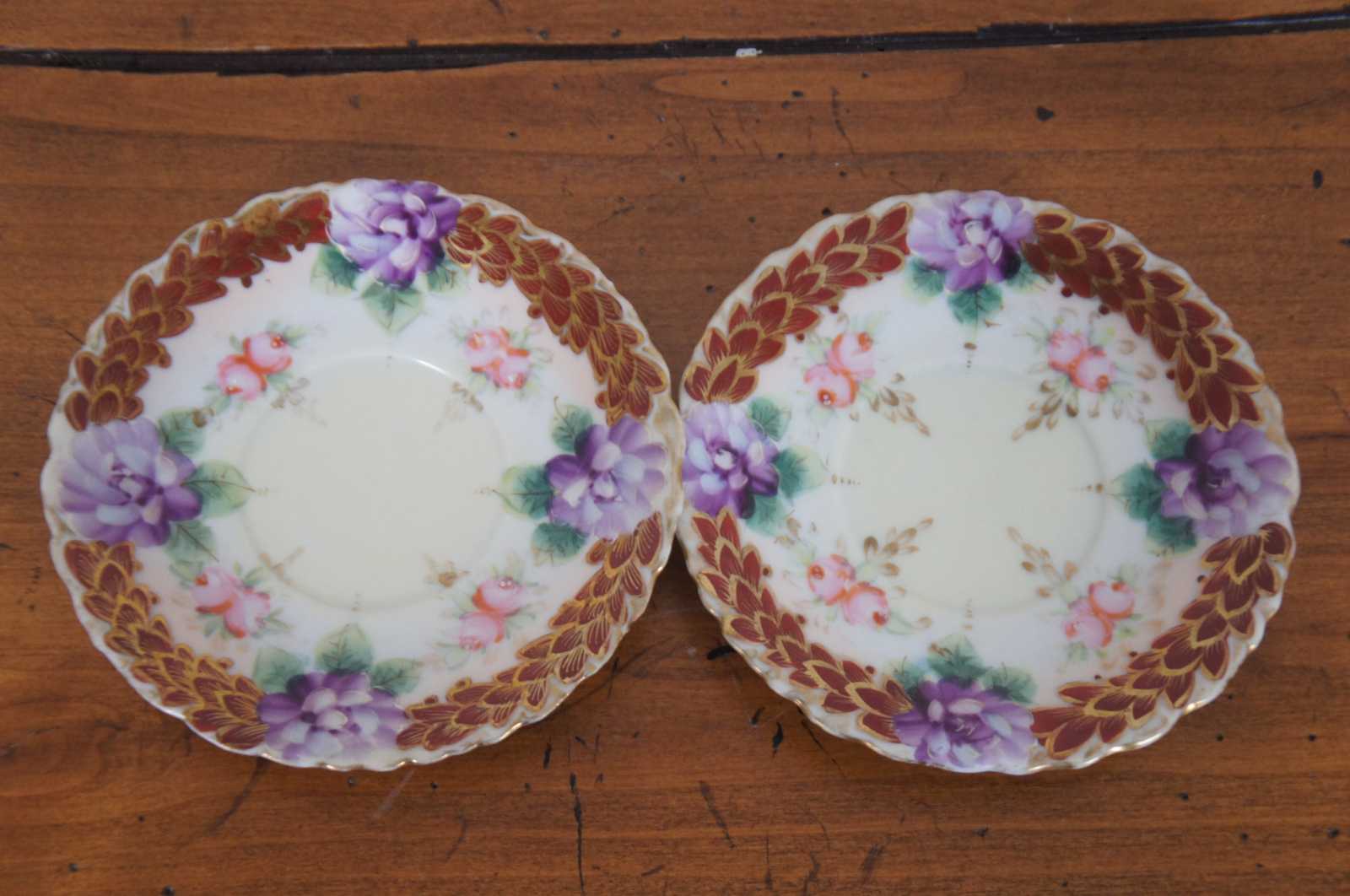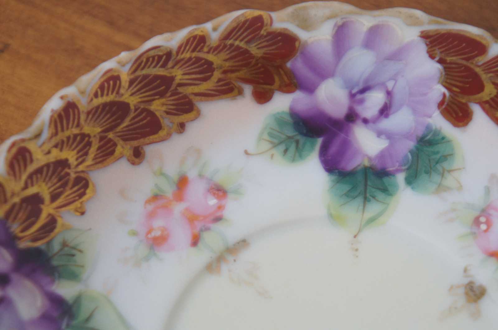 Antique floral painted porcelain demitasse cups and saucers with scalloped bases, pink and purple flowers and trim of rust colored gilded leaves; includes four cups and two saucers.