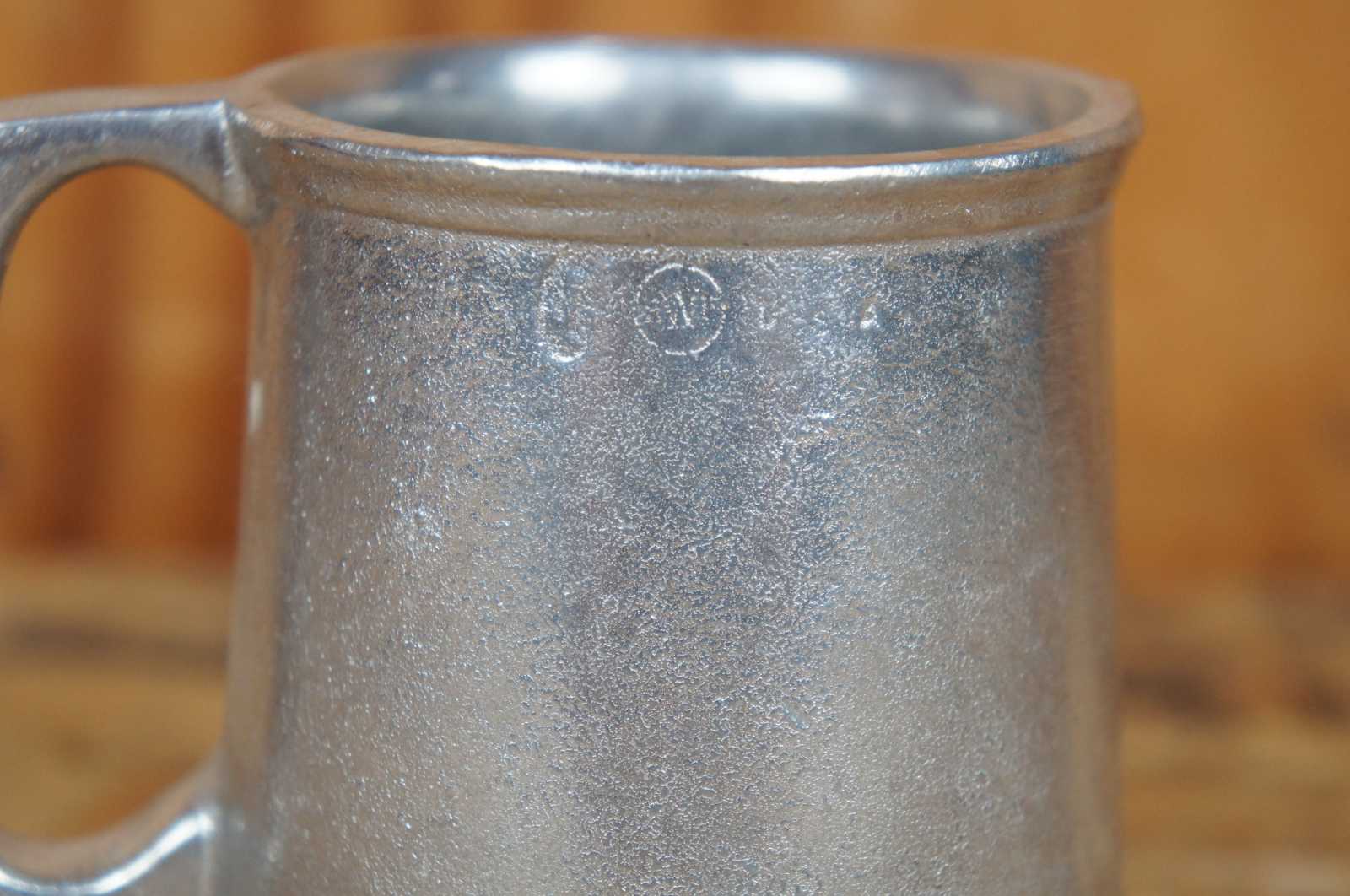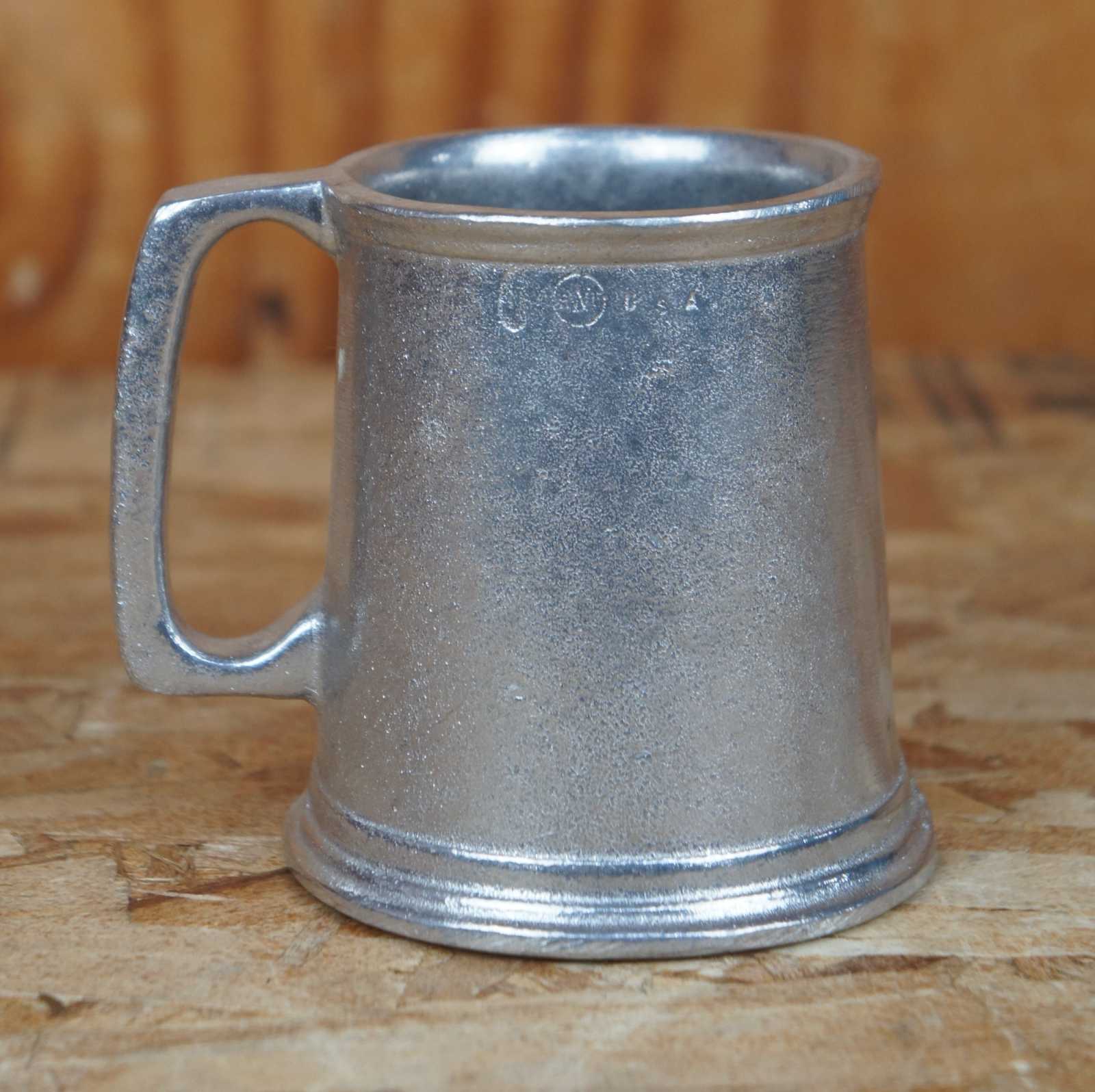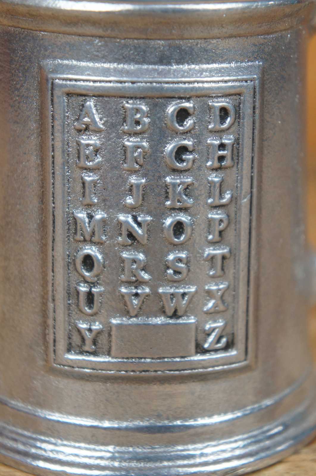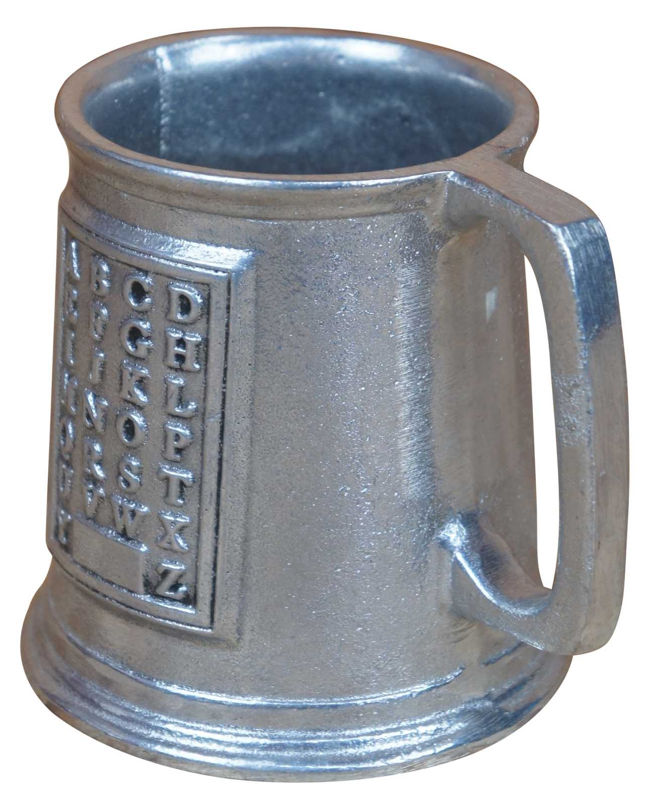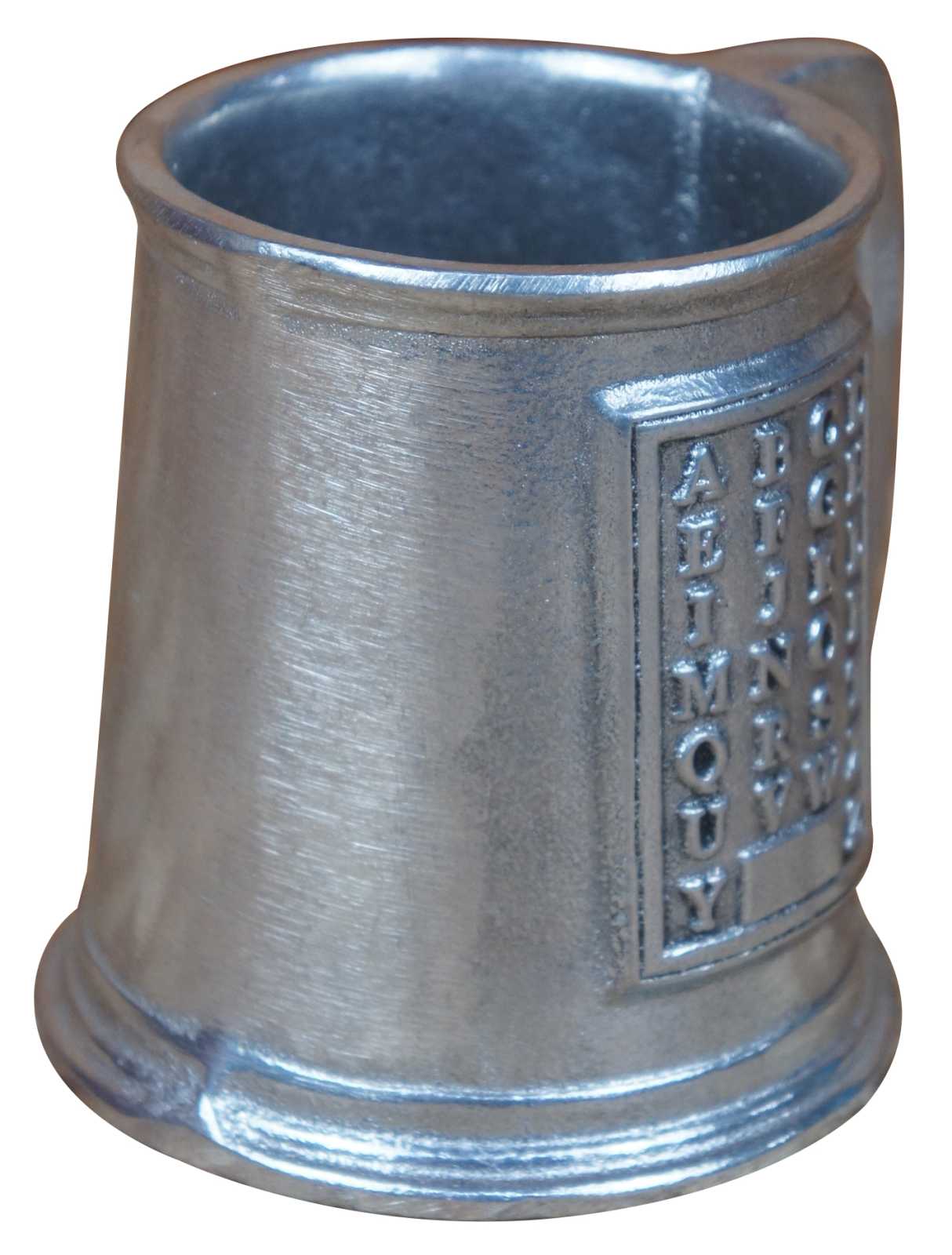 Vintage Wilton Armetale aluminum / metal mug with the alphbet embossed on one side.