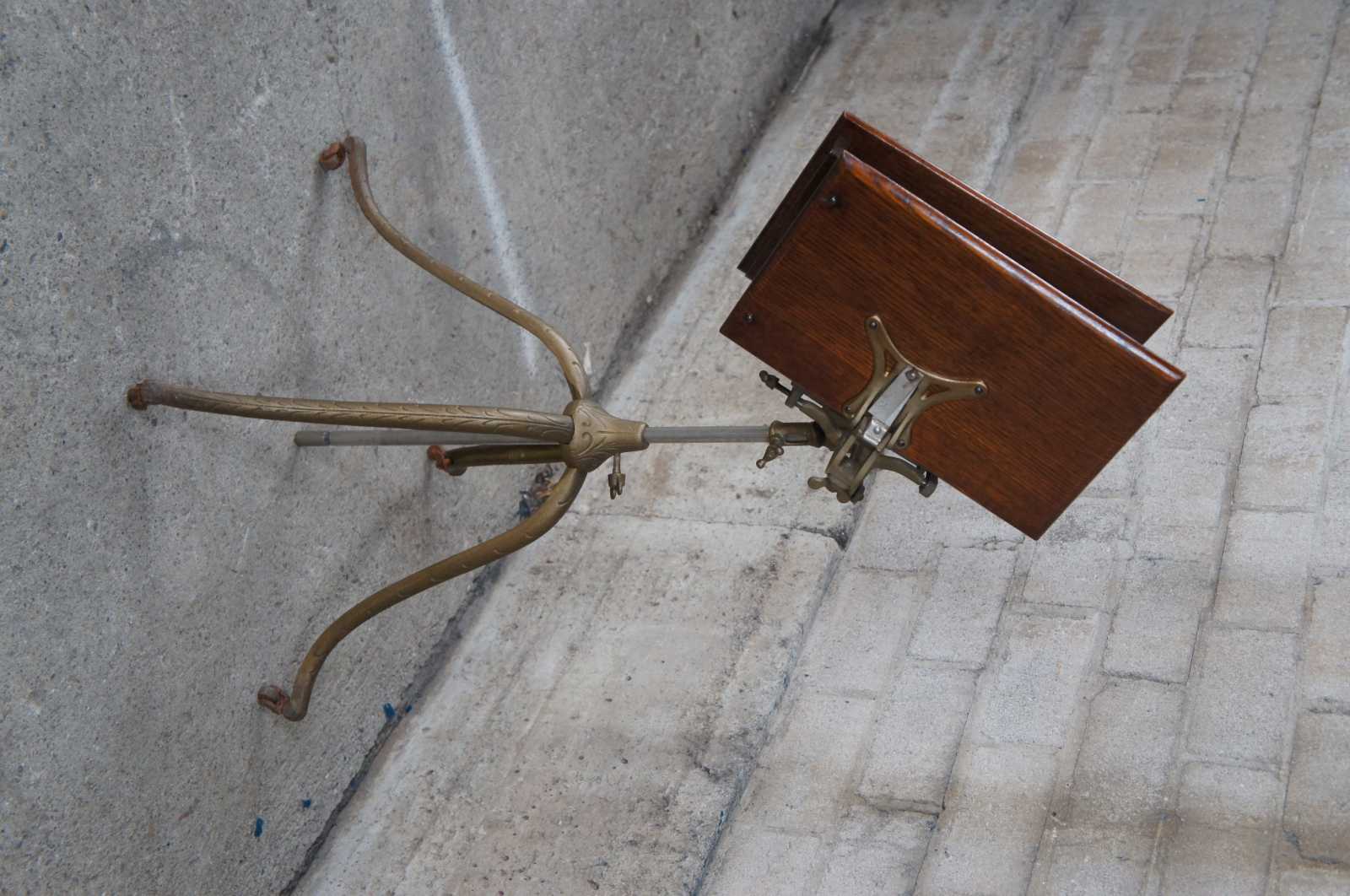 Antique adjustable Columbia Dictionary library stand by Josiah Anstice & Co of Rochester New York featuring ornate wrought iron pedestal base and quartersawn oak book holder. Circa 1895.