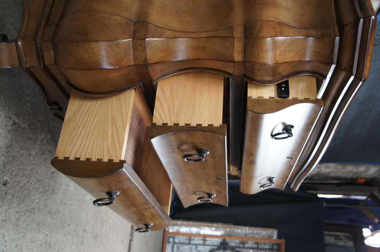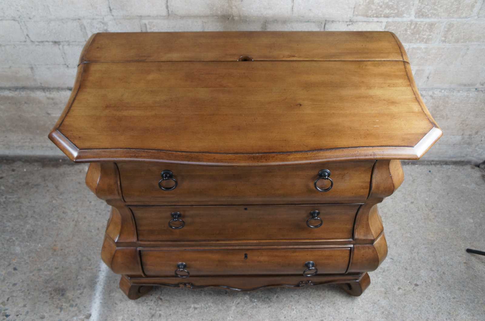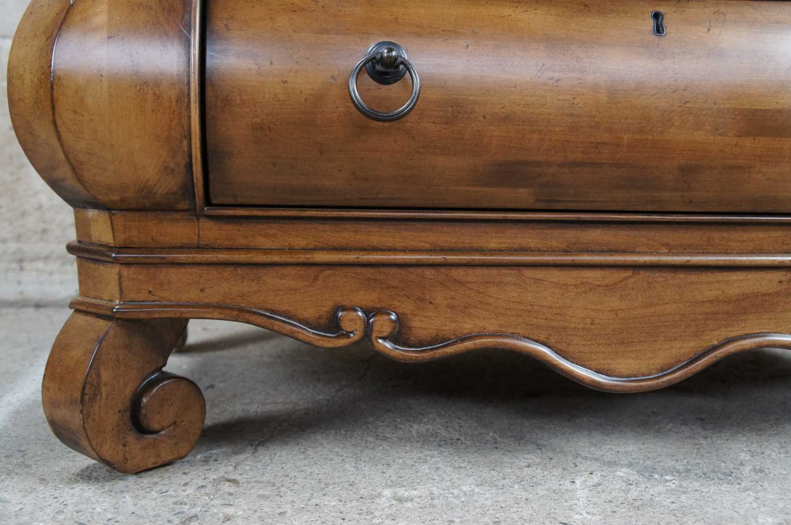 Pair of New Lou Louie P's bombe commodes or nighstands. Drawing inspiration from Louis Phillipe and Dutch styling. Crafted of solid alder in a lightly distressed, distinctly brown finish with graceful lines and modern sensibility. Features three dovetailed drawers, a lower cedar drawer and upper flip top lid with power strip to conceal electronics and cords. SKU 1020590