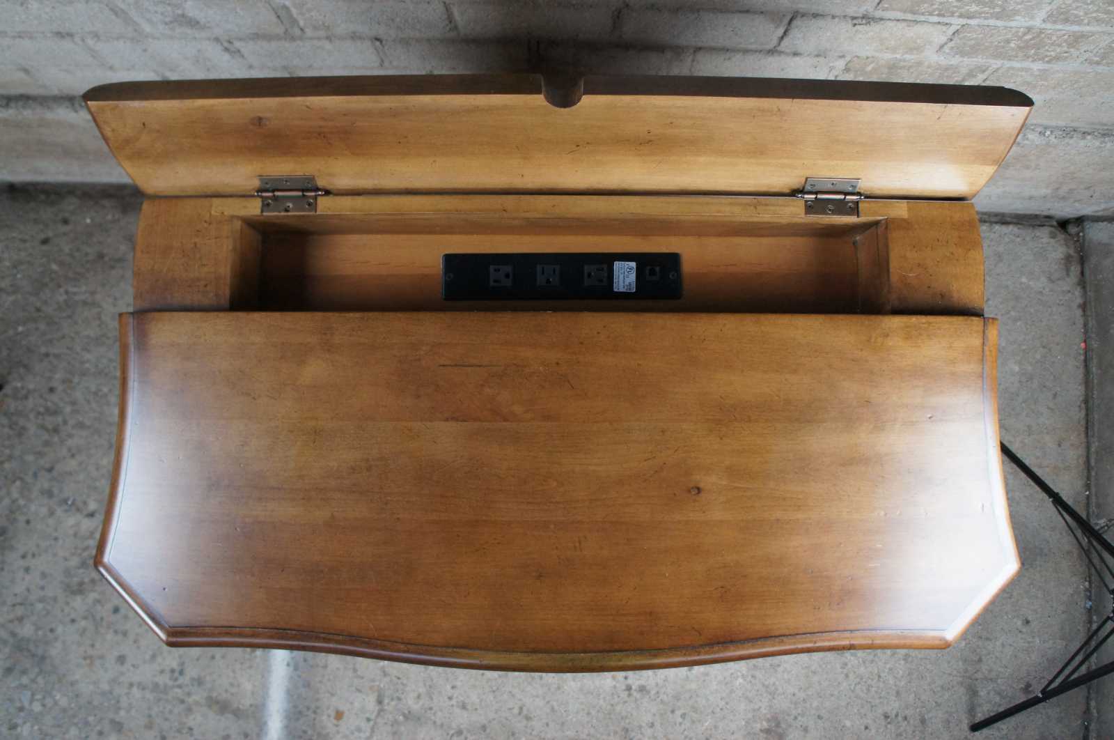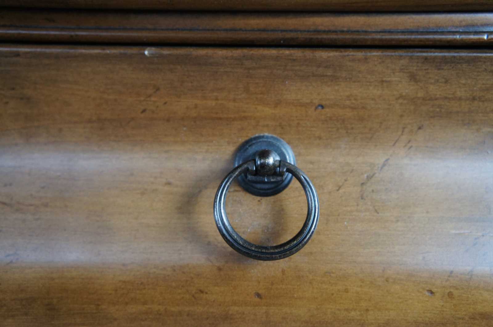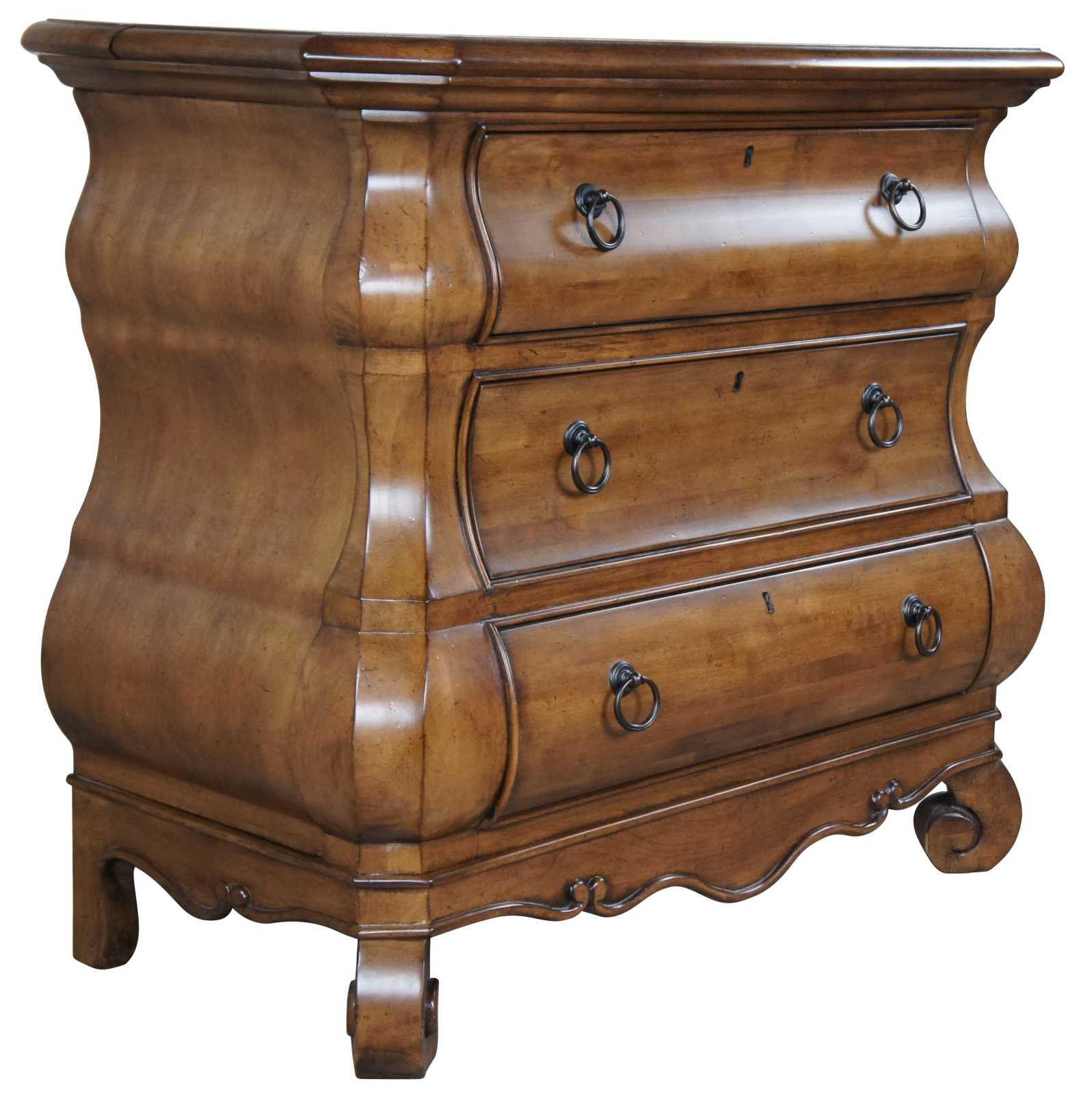 Pair of New Lou Louie P's bombe commodes or nighstands. Drawing inspiration from Louis Phillipe and Dutch styling. Crafted of solid alder in a lightly distressed, distinctly brown finish with graceful lines and modern sensibility. Features three dovetailed drawers, a lower cedar drawer and upper flip top lid with power strip to conceal electronics and cords. SKU 1020590