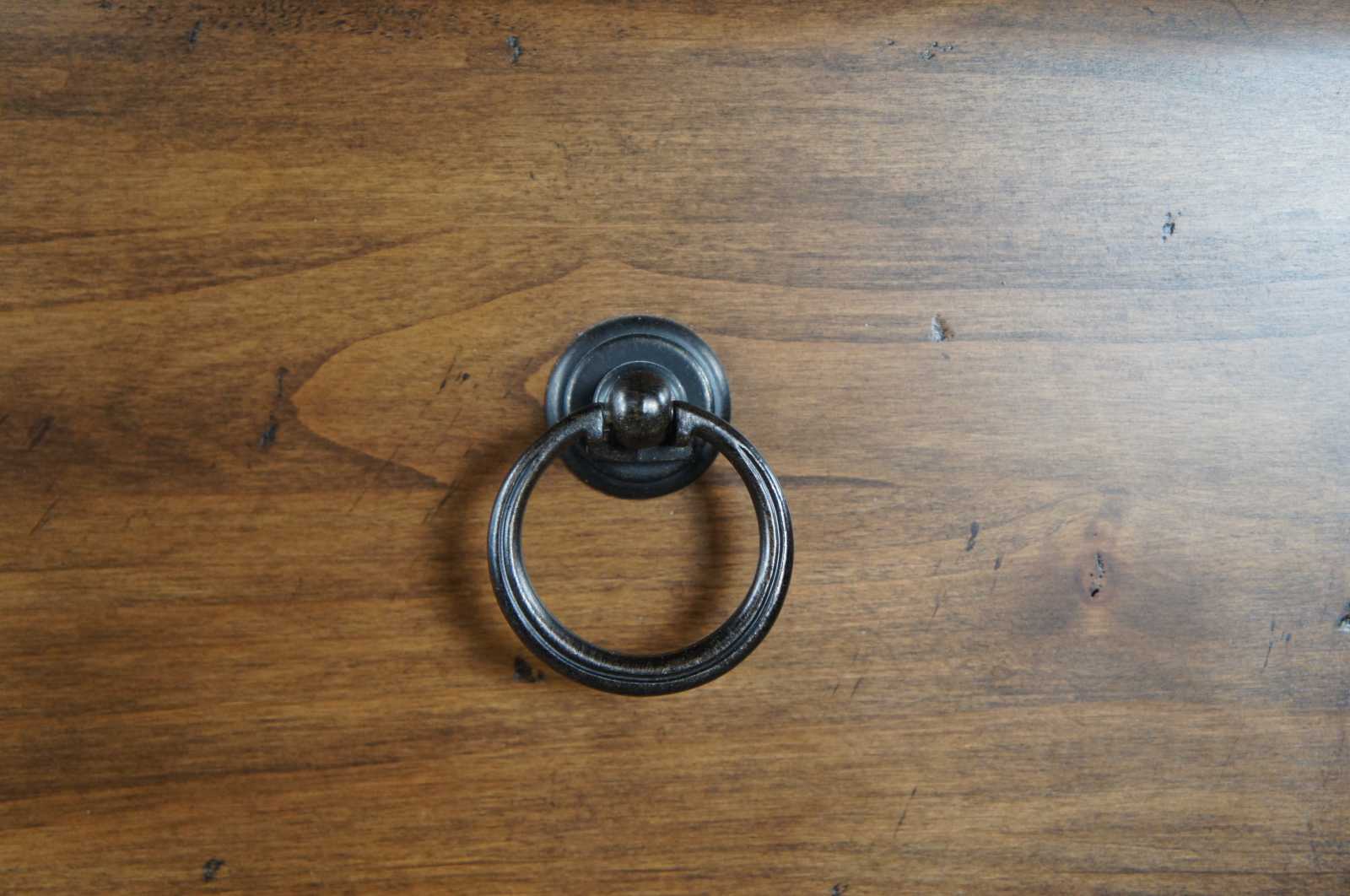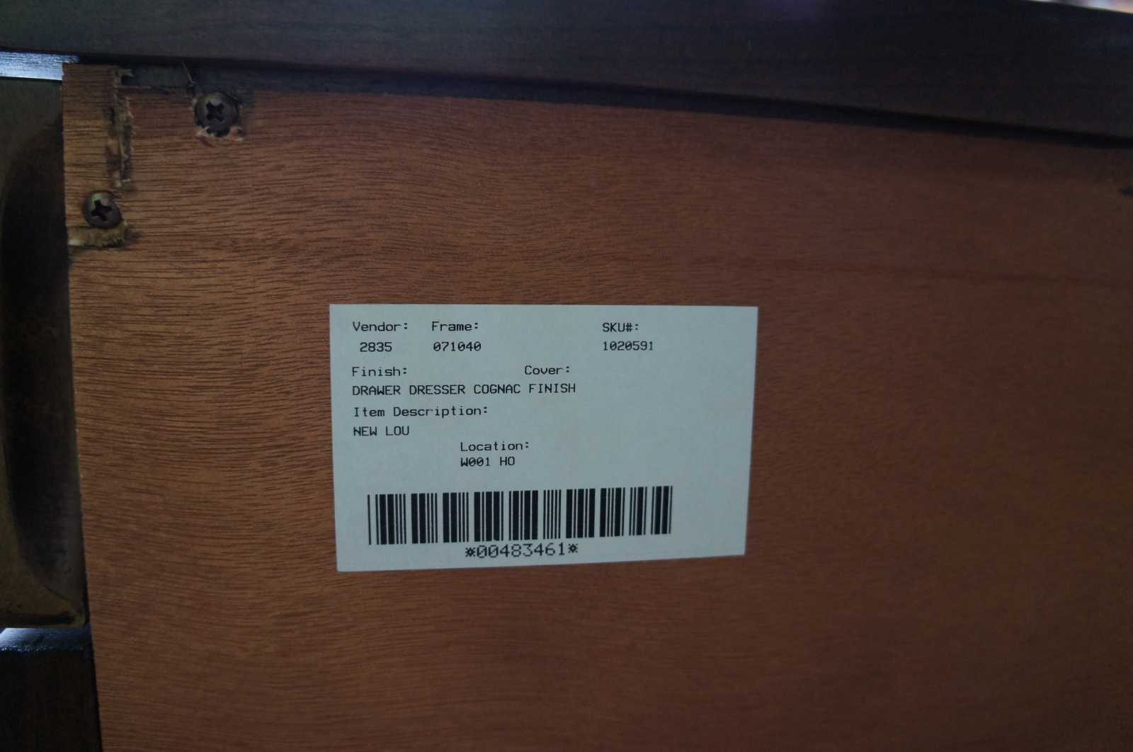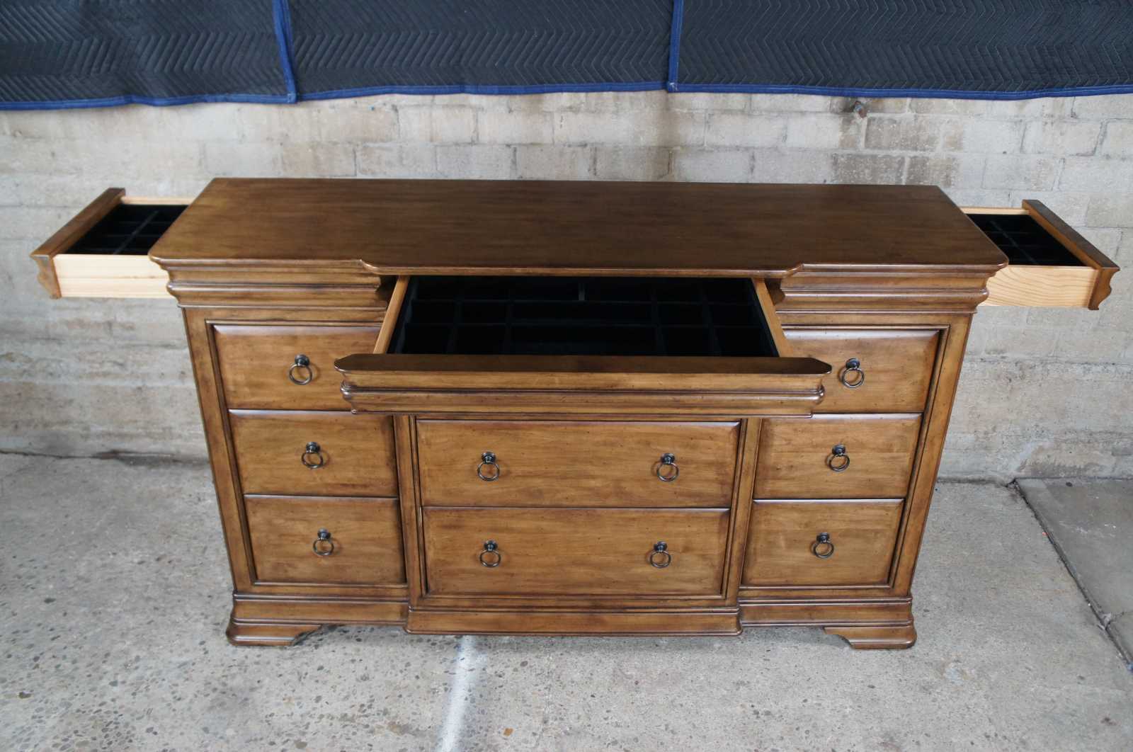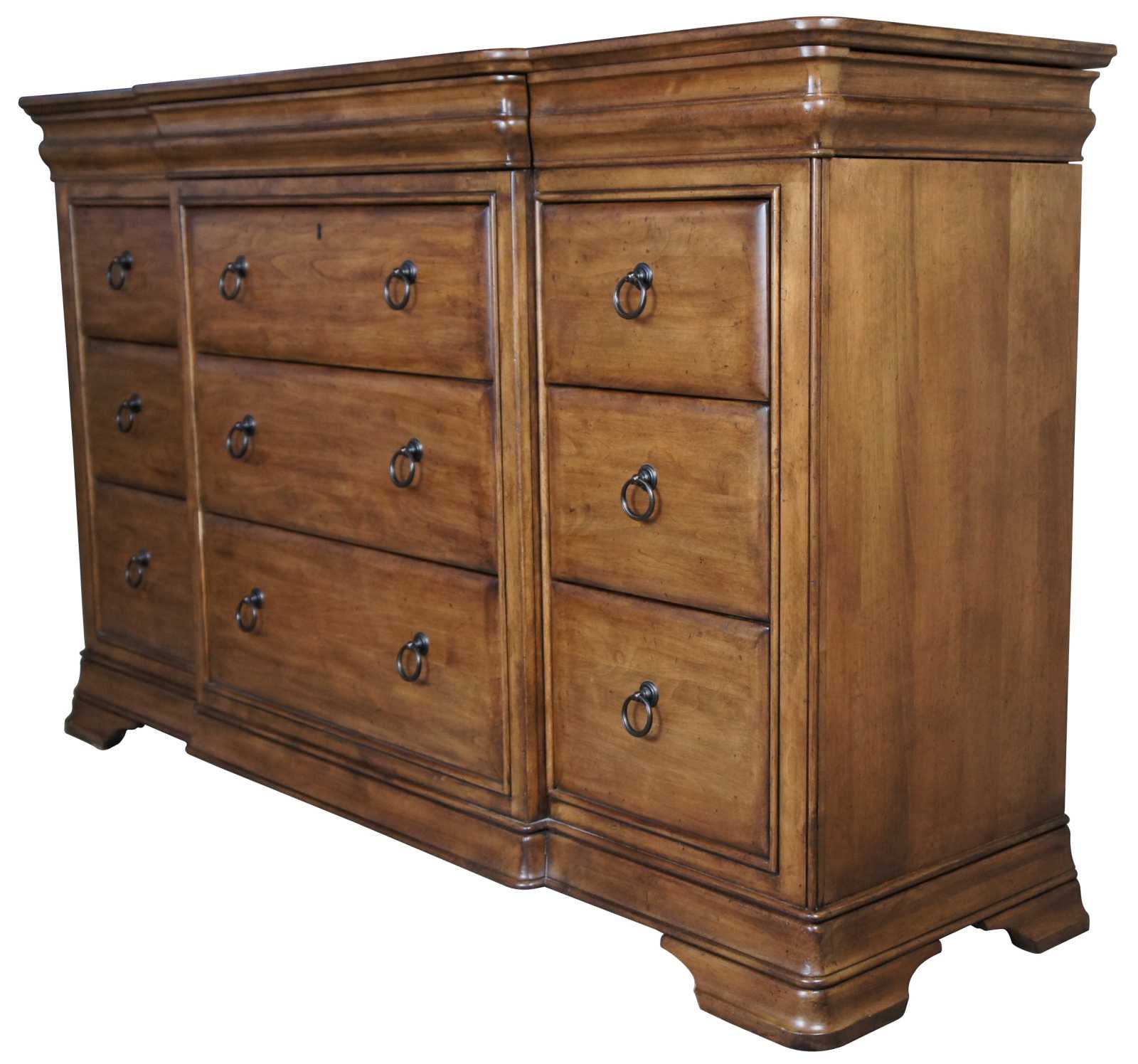 New Lou 12 Drawer Dresser by Pennsylvania House & Universal. Drawing inspiration from Louis Phillipe styling. Crafted of solid alder in a lightly distressed, distinctly brown finish with graceful lines and modern sensibility. Features nine dovetailed drawers with lower cedar drawers. Top left drawer has drop down front for audio player or cable box storage. Includes 3 hidden felt lined cornice drawers. SKU 1020591, Cognac Finish