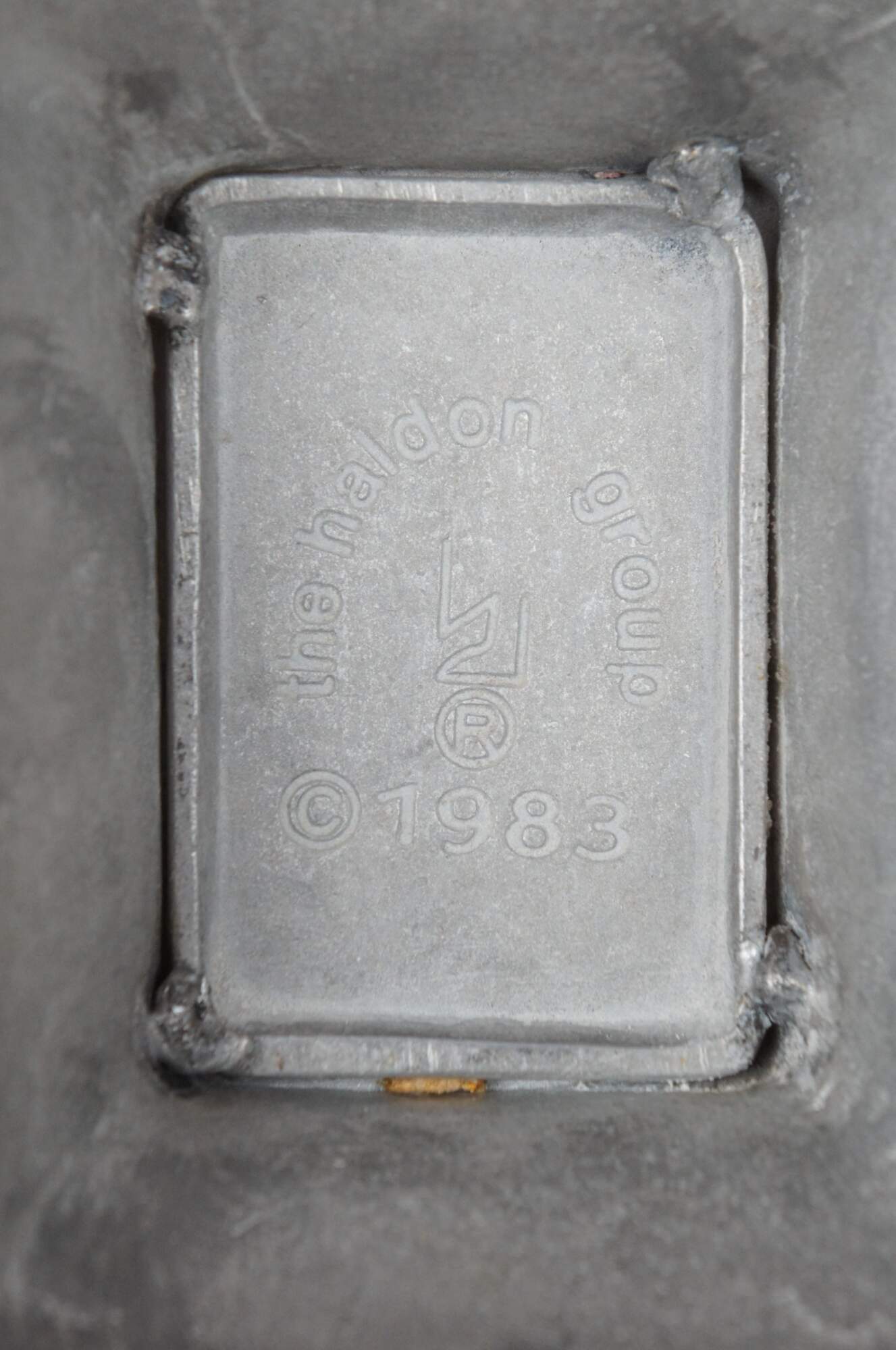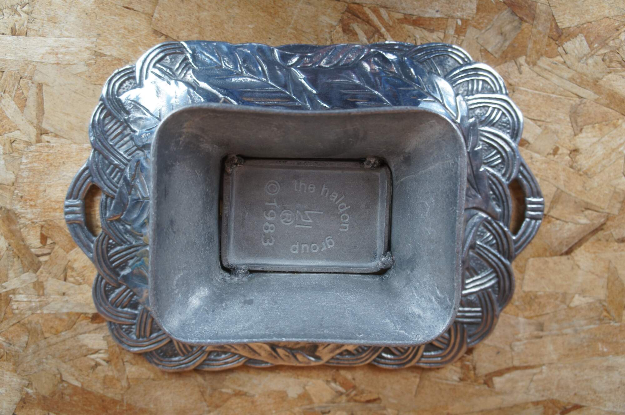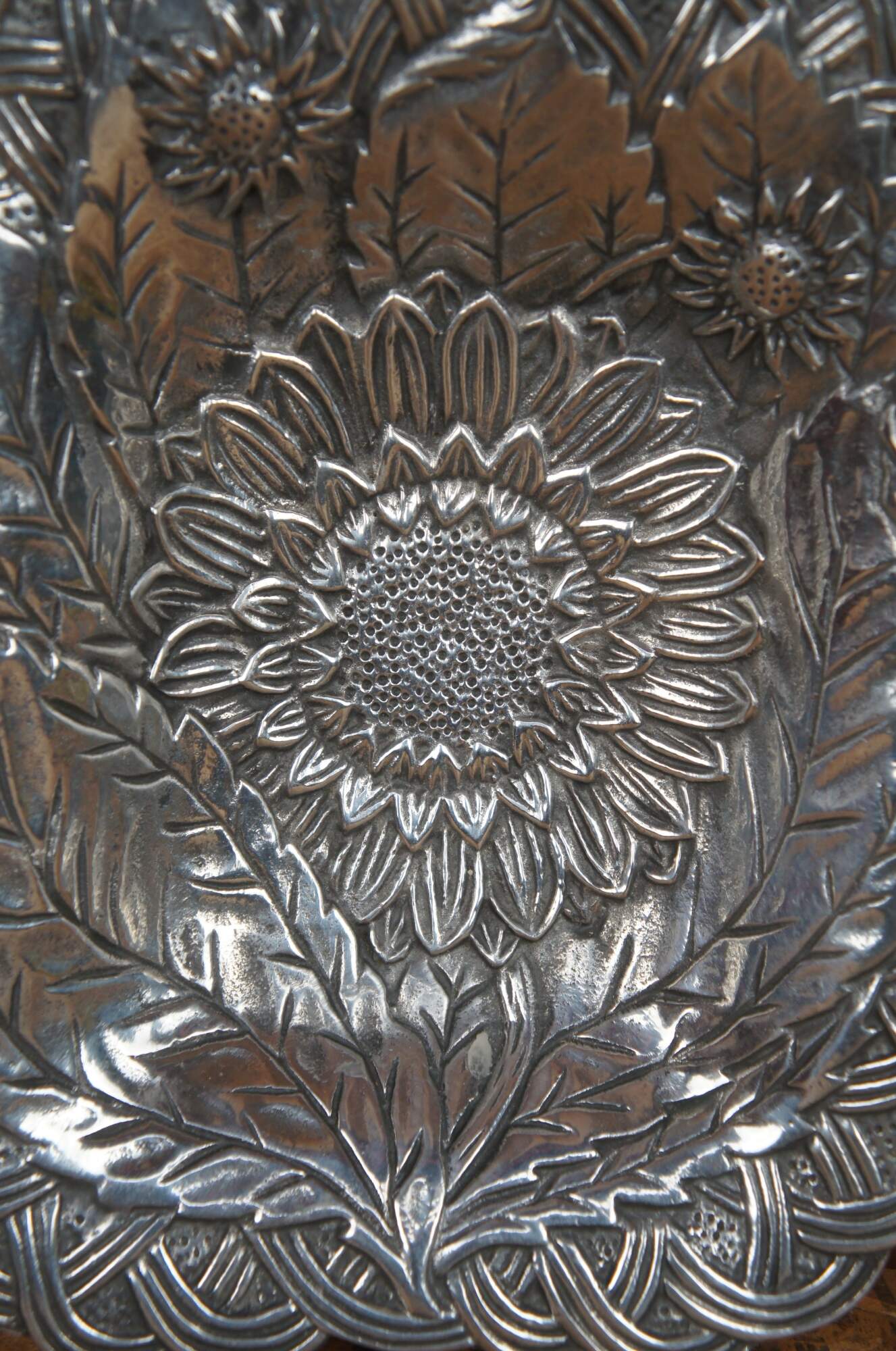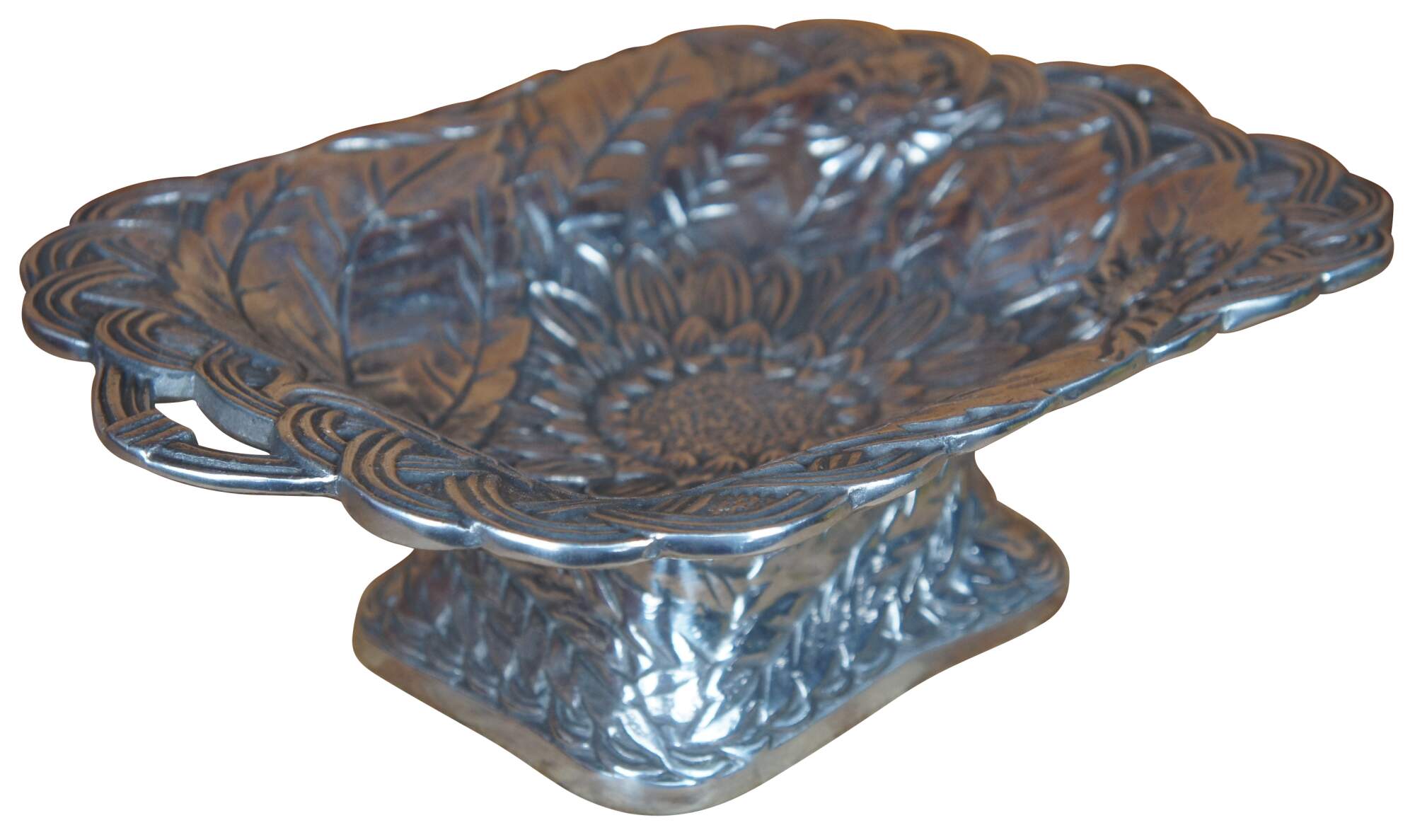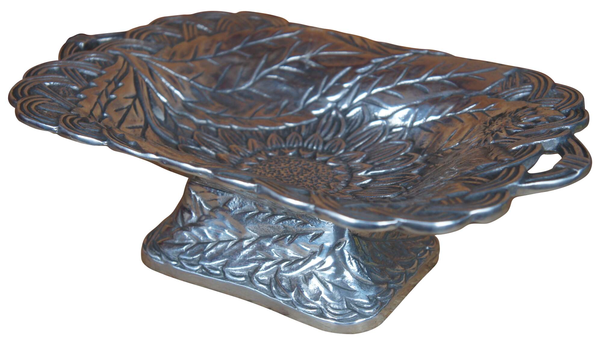 1983 vintage The Haldon Group cast aluminum footed centerpiece bowl or compote featuring low relief floral Sunflower design with scalloped basket weave edge and handles.