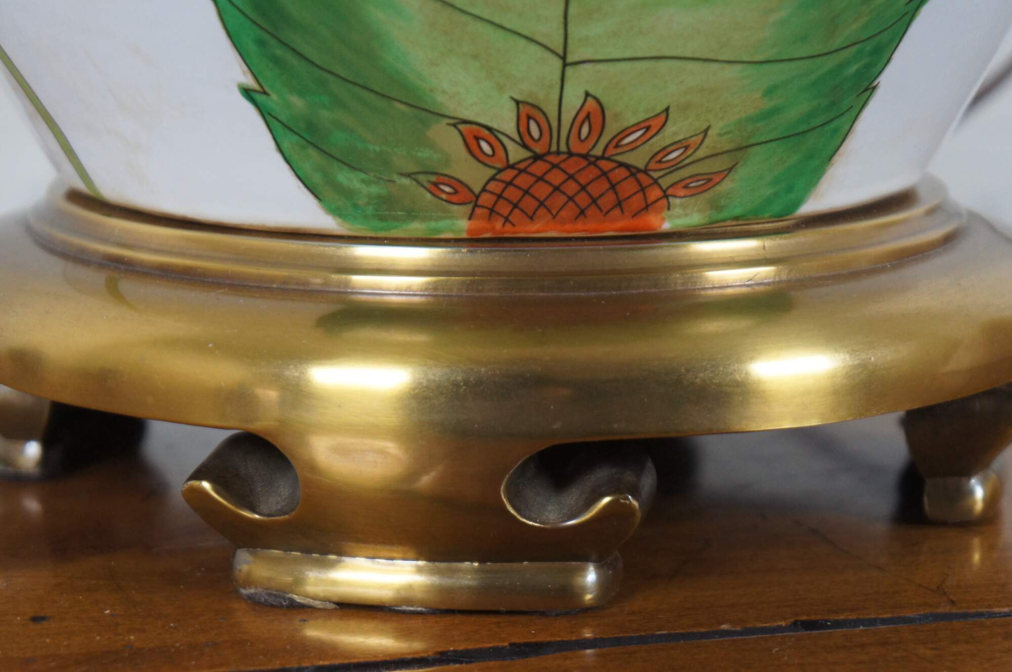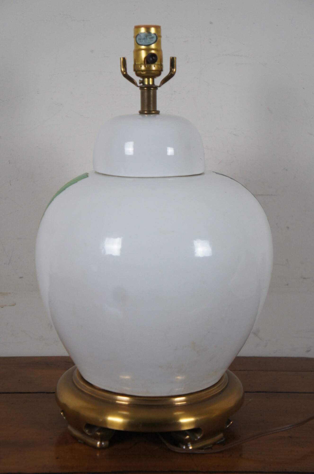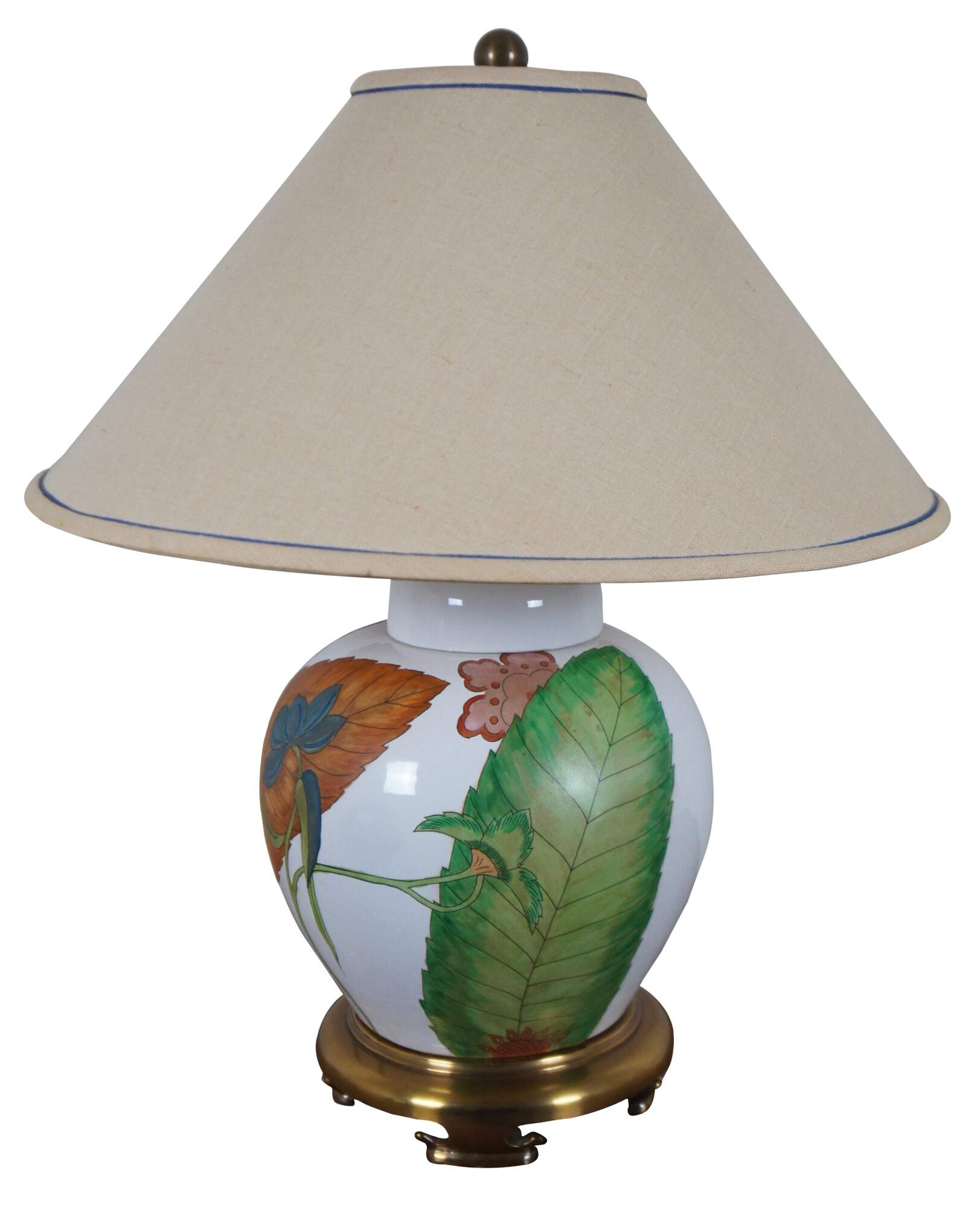 Vintage Chapman ginger jar table lamp circa 1980’s; white glazed porcelain with orange, blue, pink and green matte painted leaves and flowers, brass base and finial.